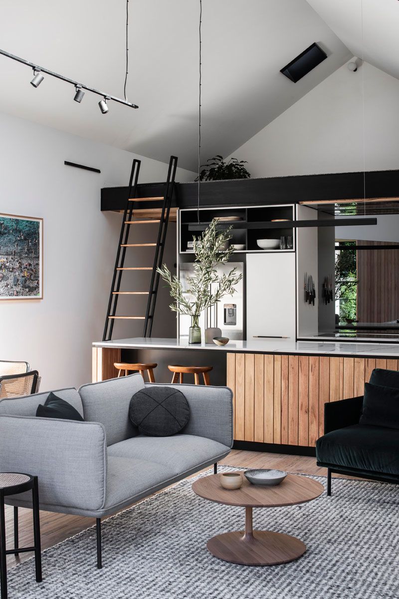 Specjalna konstrukcja zaprojektowana przez architektów stworzyła wysoką i otwartą przestrzeń. Zmieścił się w niej salon, jadalnia, kuchnia i strych. Sofę w niewielkim salonie ustawiono w stronę czarnego kominka, który spoczął na niskiej półce wykonanej na zamówienie. Ta półka w dalszej części zamienia się w ławkę, która ciągnie się w dwie strony, dochodząc do drzwi prowadzących na taras i podwórko. Za kanapą urządzono małą jadalnię. Drewno na ścianach podkreśla wysoki sufit i tworzy piękne tło dla stołu i krzeseł.