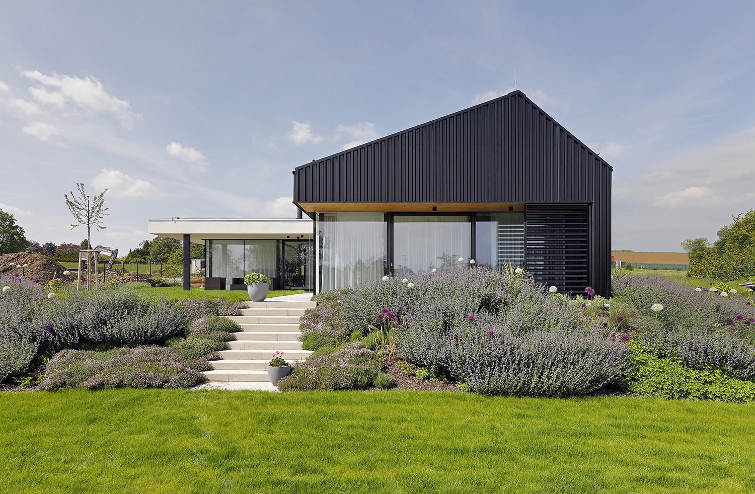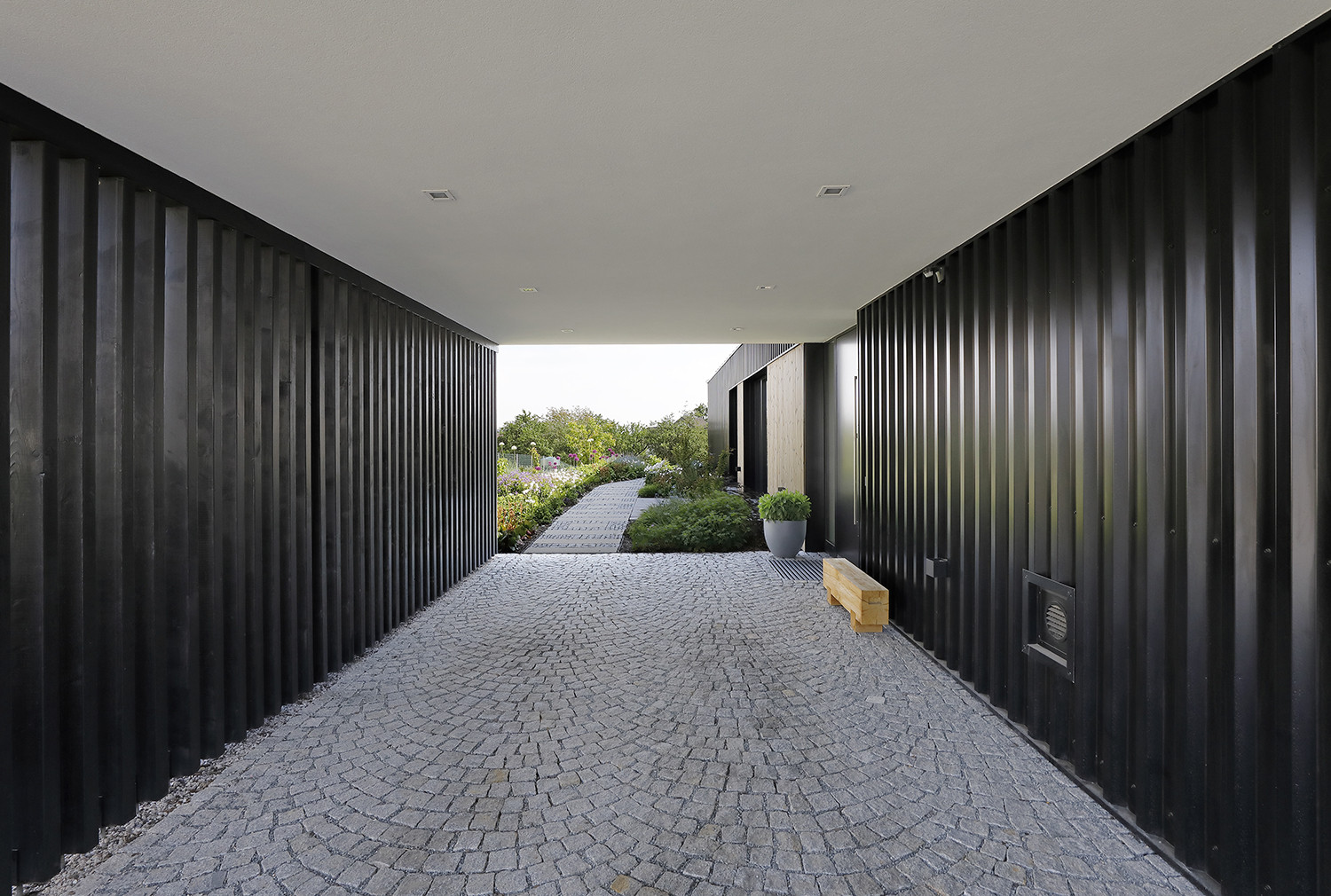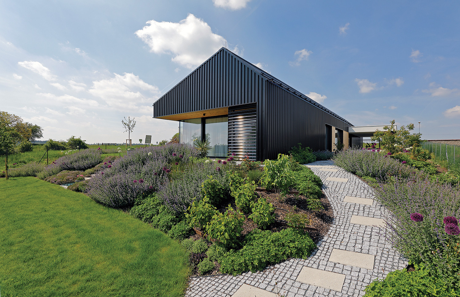 Główna masa budynku została obłożona czarną blachą trapezową, co nadaje jej surowy, monolityczny charakter. Materiał ten przywołuje skojarzenia z architekturą Nowej Zelandii, gdzie proste, metalowe formy często wpisują się w otwarty krajobraz. W Radimovicach czarna elewacja kontrastuje z zielenią ogrodu i podkreśla geometryczną czystość bryły.
