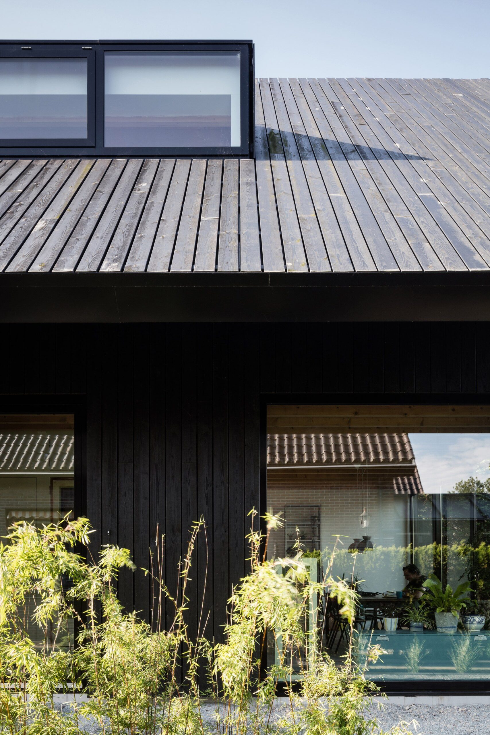 Stalowa konstrukcja wspiera warstwowe panele wypełnione wysokiej jakości izolacją i to one tworzą ściany oraz dach. Panele zostały wykończone z zewnątrz czarnym drewnem sosnowym, pokrytym ochronnym woskiem. Pionowo ułożone deski przełamują wyłącznie okna, które mają minimalistyczne, czarne futryny. One również zapewniają optymalną efektywność termiczną.