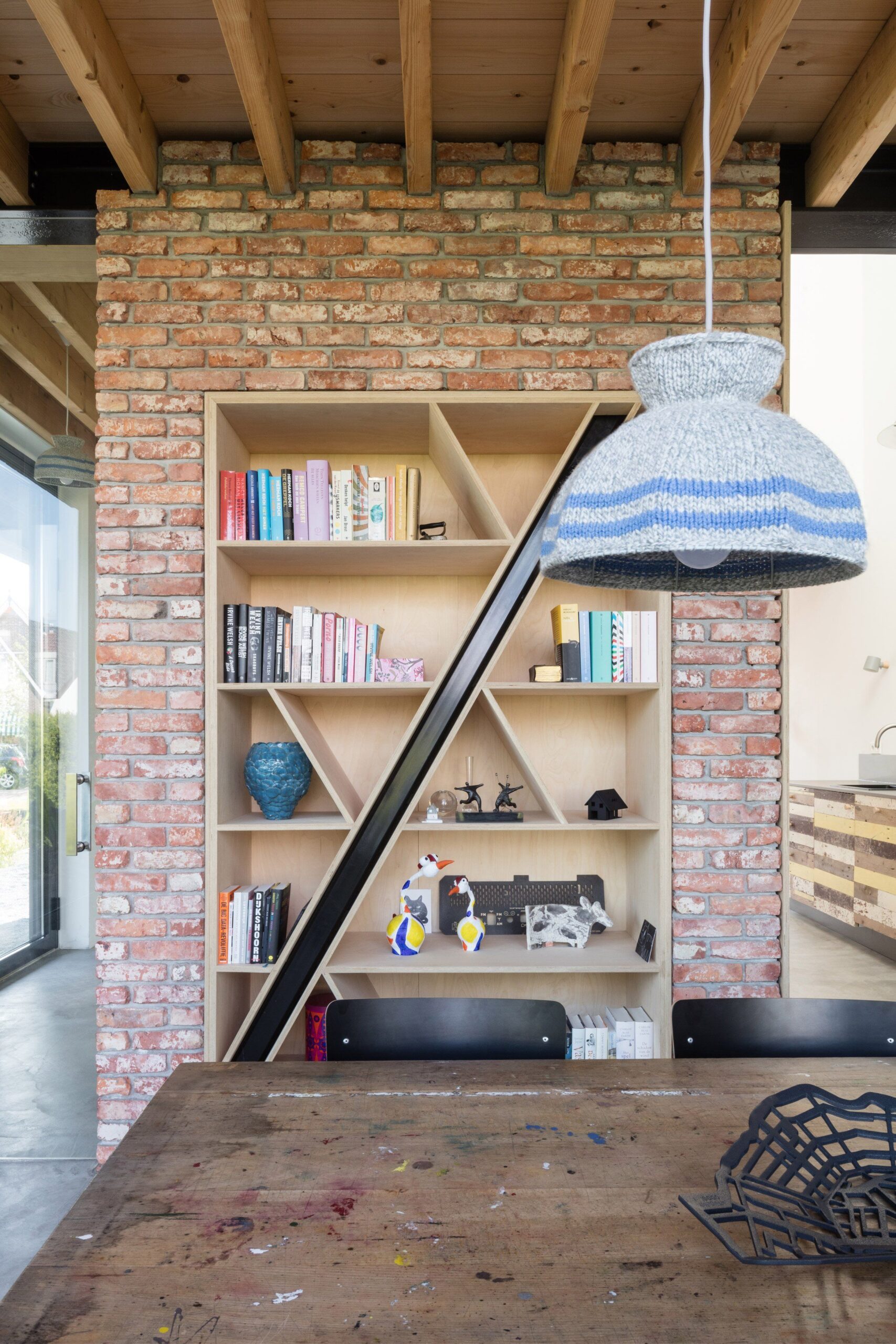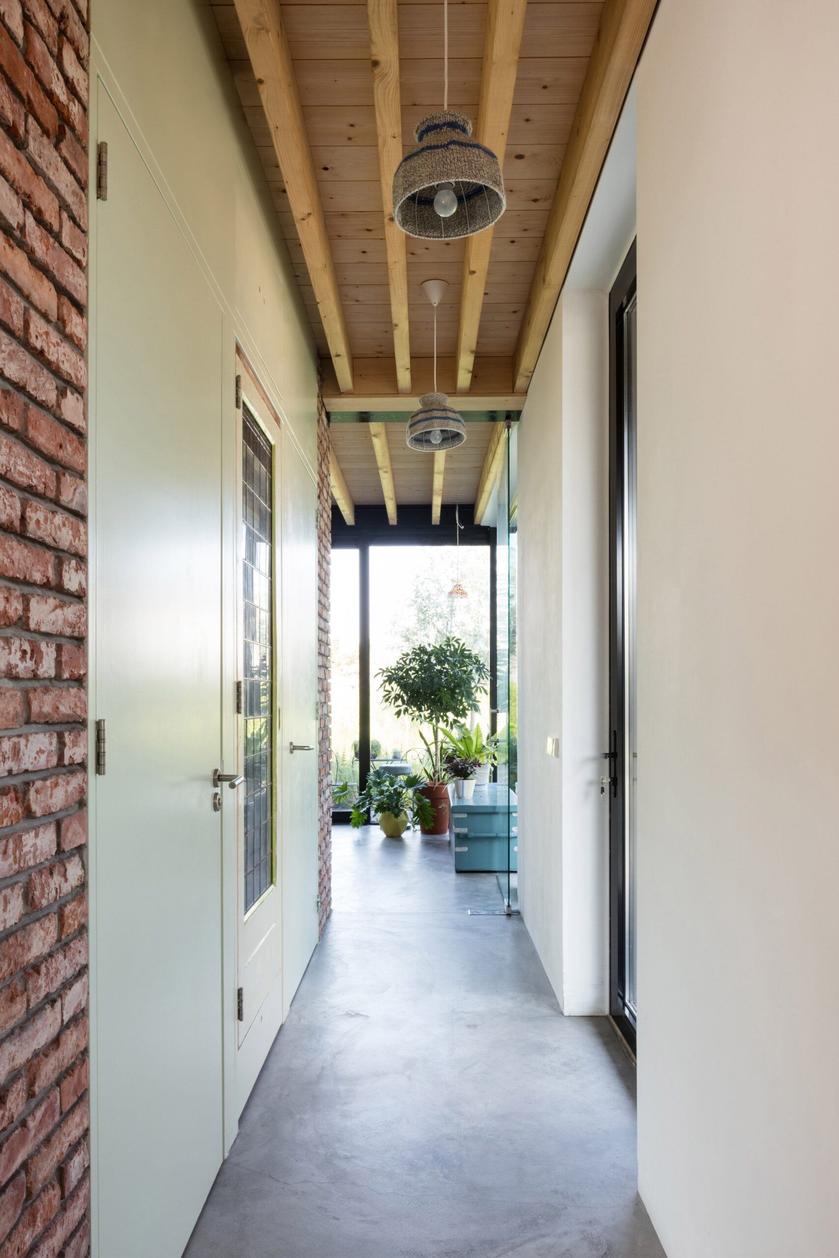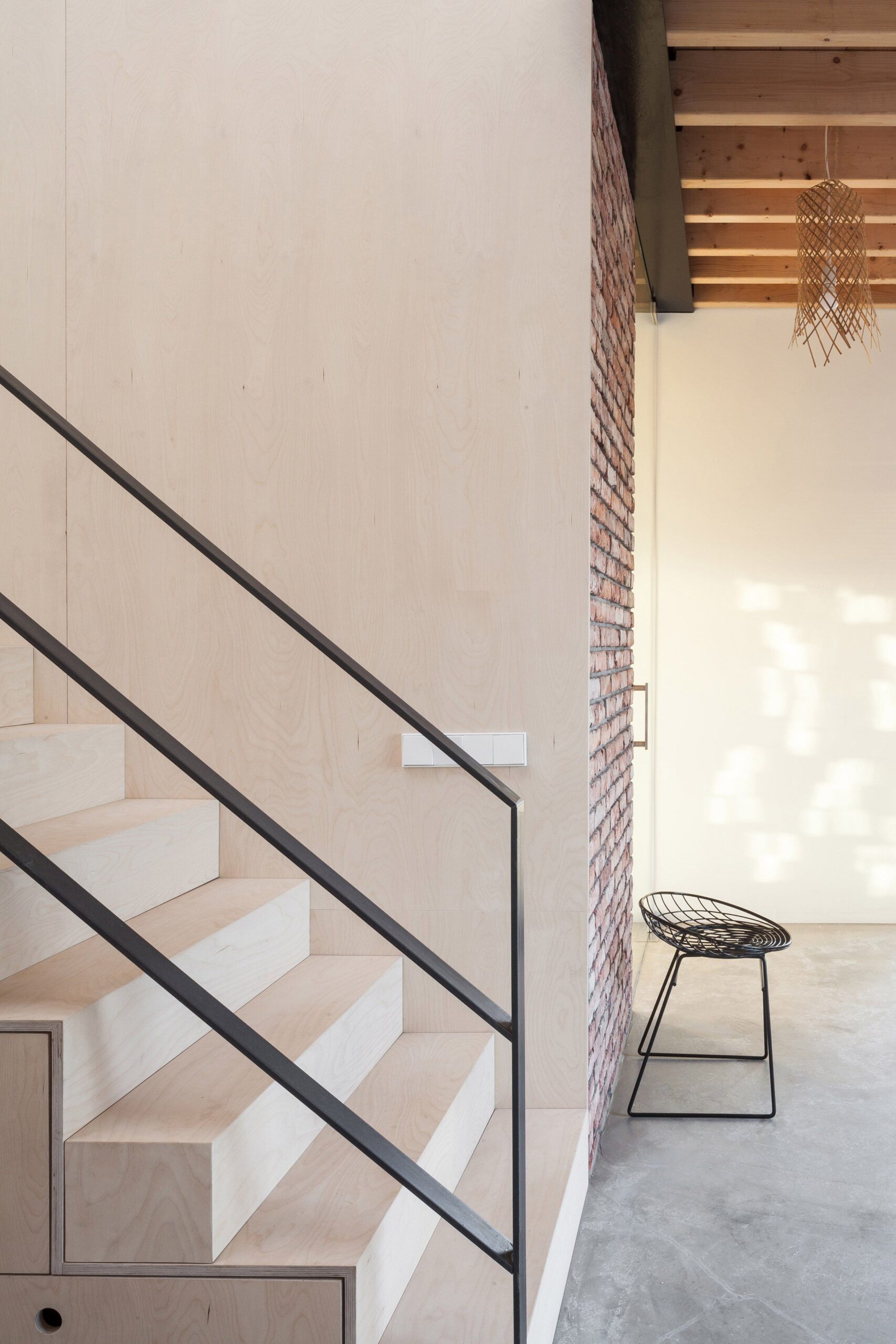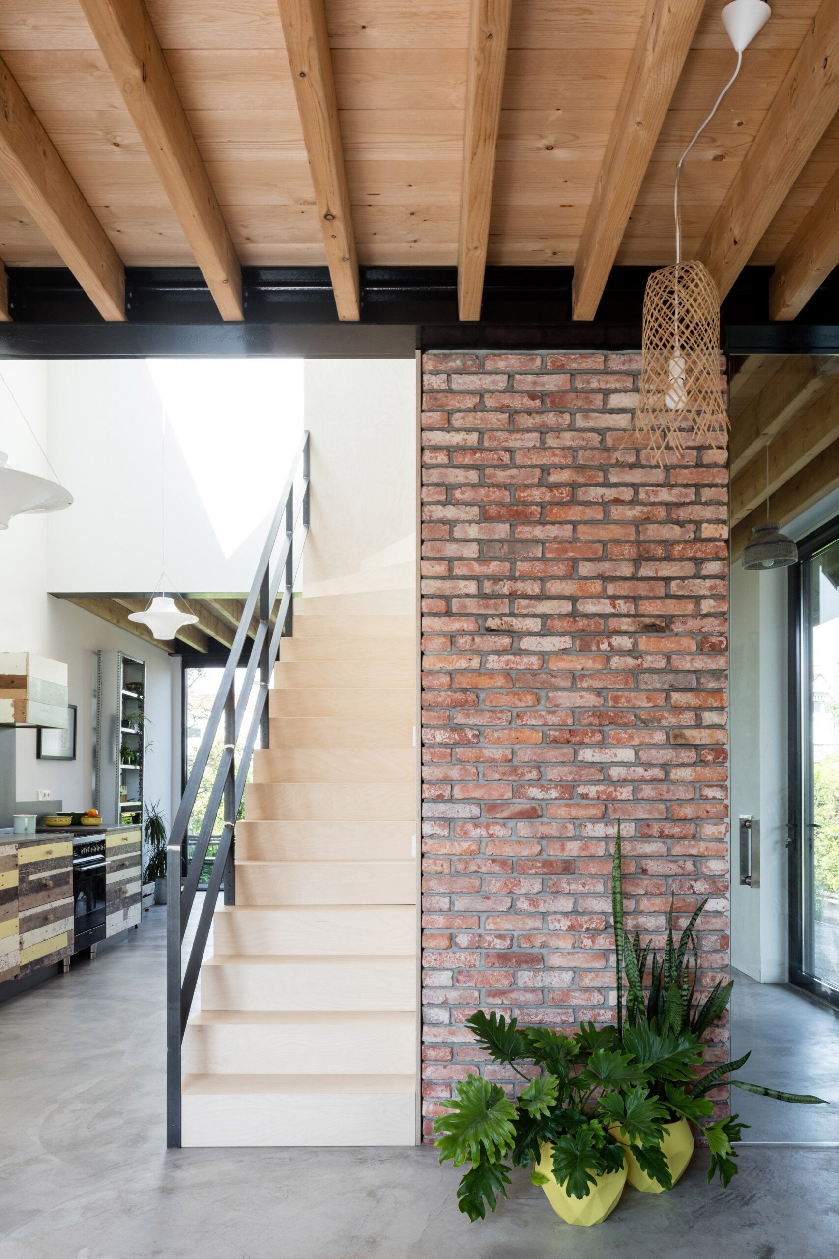 Wewnątrz powierzchnia podzielona jest na różne strefy, w czym pomaga ceglasty „rdzeń” budynku. Cegła ta pochodzi z wnętrza stojącego tu wcześniej domu. Ten centralny element mieści wbudowane półki, szafę i toaletę, a tuż obok znajdują się schody prowadzące na wyższe poziomy domu. Przestrzeń salonu obok wejścia łączy się z kuchnią, która prowadzi do jadalni znajdującej się w tylnej części. Ta przestrzeń zakończona jest pełnym przeszkleniem, łącznie z przesuwnymi drzwiami, które otwierają się na taras i ogród.