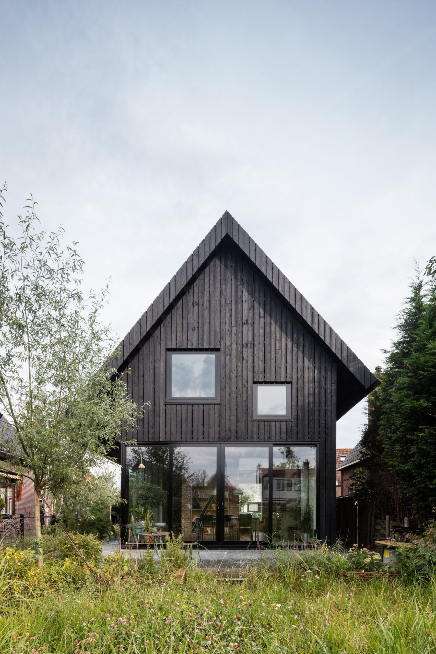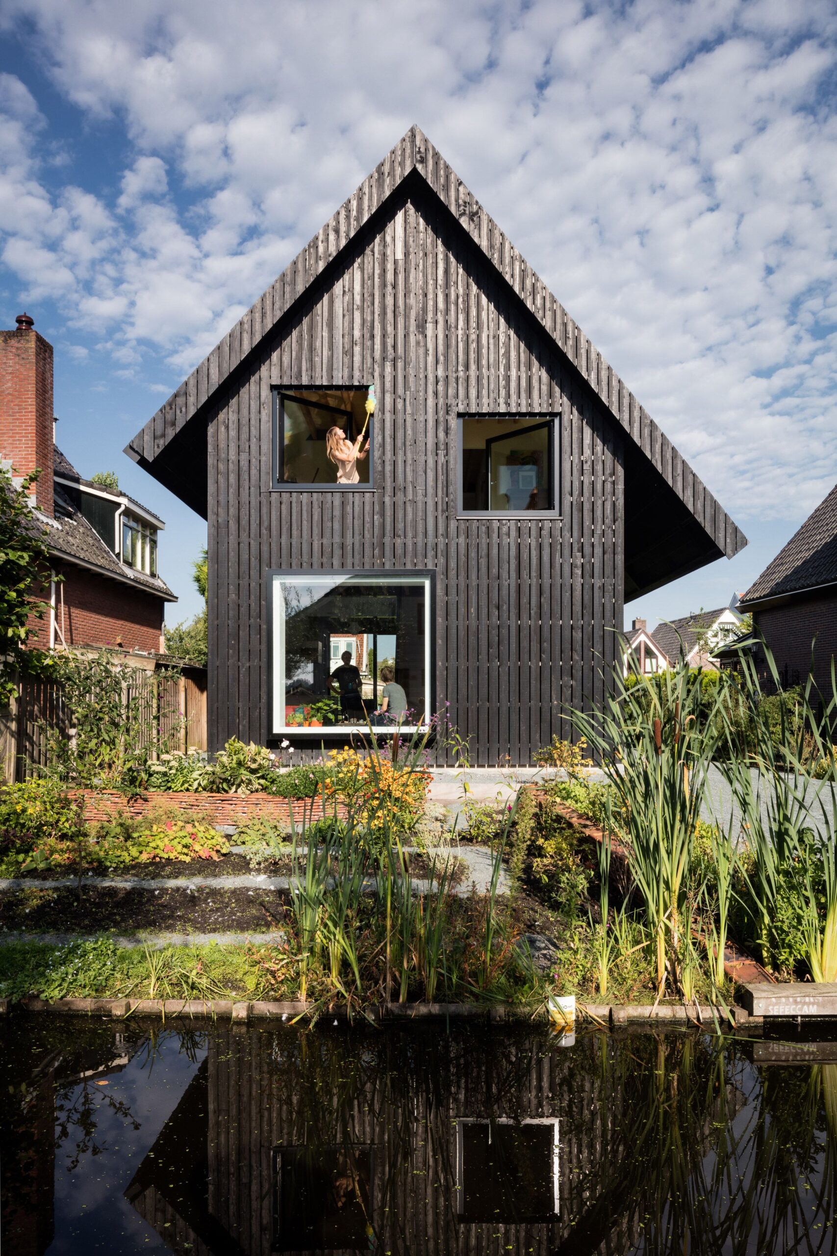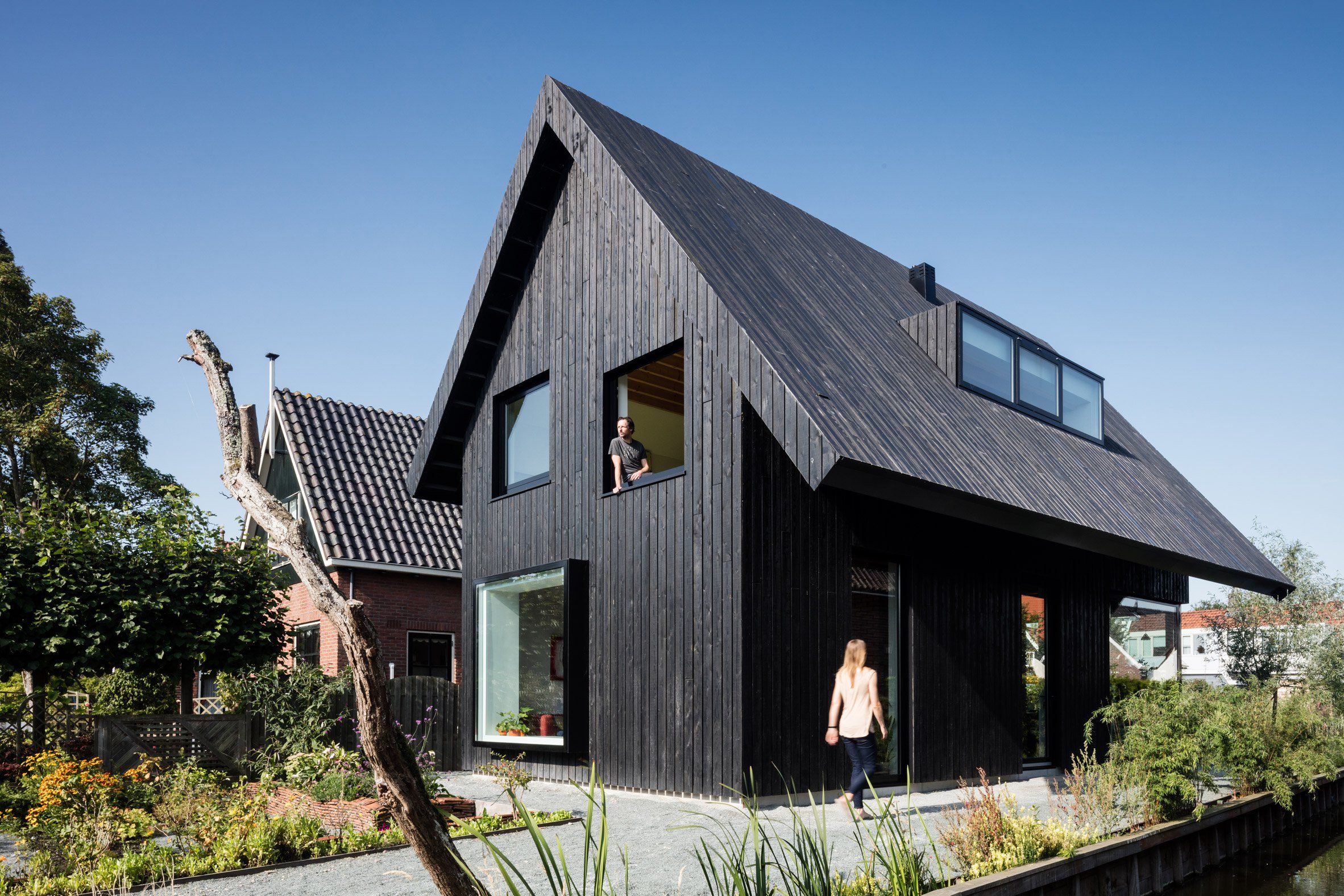 Holenderski architekt Chris Collaris zbudował dom w Amsterdamie, który w 100 procentach obity jest poczerniałym drewnem. Jego asymetryczny dach dwuspadowy wydłuża się z jednej strony, tworząc osłonięte wejście.