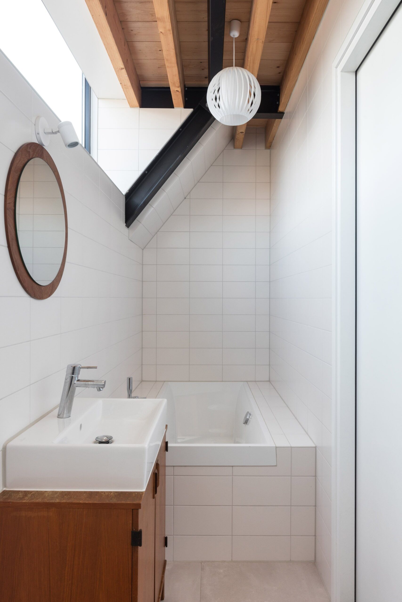 Duże okno wystaje z jednej ze ścian, mieszcząc również wygodne siedzisko, z którego można podziwiać piękny ogród. Projekt ma też okno mansardowe, które przełamuje linię dachu, wpuszczając naturalne światło do łazienki.