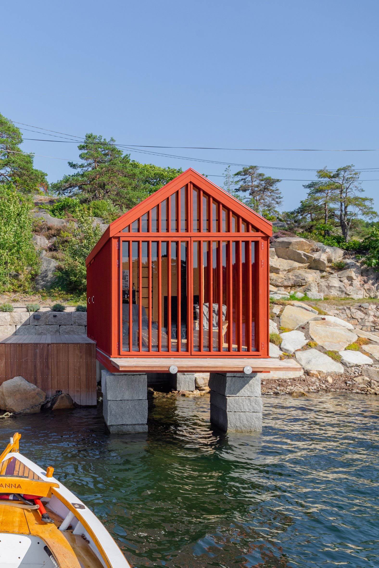 Na norweskim wybrzeżu w rejonie Hankøsundet, w hrabstwie Østfold, powstała niewielka, lecz wyrazista kabina zaprojektowana przez Handegård Arkitektur. Budynek usytuowano bezpośrednio nad wodą, na granitowych filarach wyniesionych ponad taflę morza. Lokalizacja pozwala na niezakłócony kontakt z krajobrazem i codzienne obcowanie z rytmem przypływów, światłem oraz zmienną pogodą typową dla norweskiego wybrzeża.