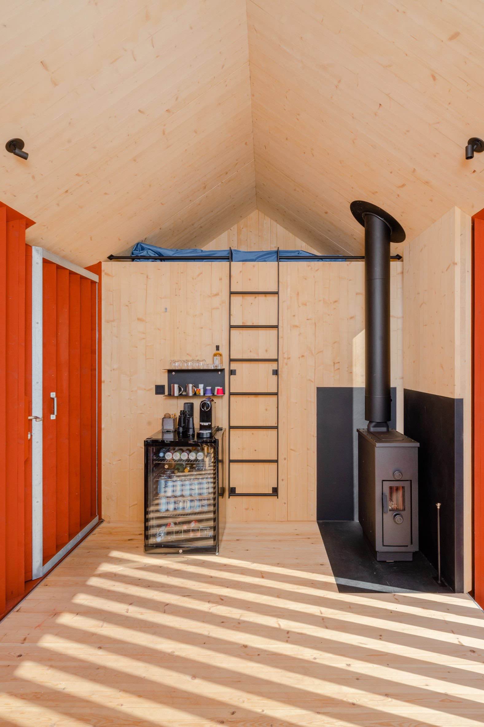 Wnętrze kabiny wykończono sklejką, która nadaje przestrzeni ciepły, naturalny charakter. Układ funkcjonalny jest prosty i podporządkowany widokowi na wodę. W tylnej części znalazło się miejsce na niewielki aneks z minibarem oraz piec opalany drewnem, natomiast front przestrzeni pozostawiono otwarty, z możliwością ustawienia leżaków i swobodnego wypoczynku. Dwie pełnowysokościowe drzwi wahadłowe pozwalają całkowicie otworzyć wnętrze na zewnętrzny drewniany podest i morską bryzę.