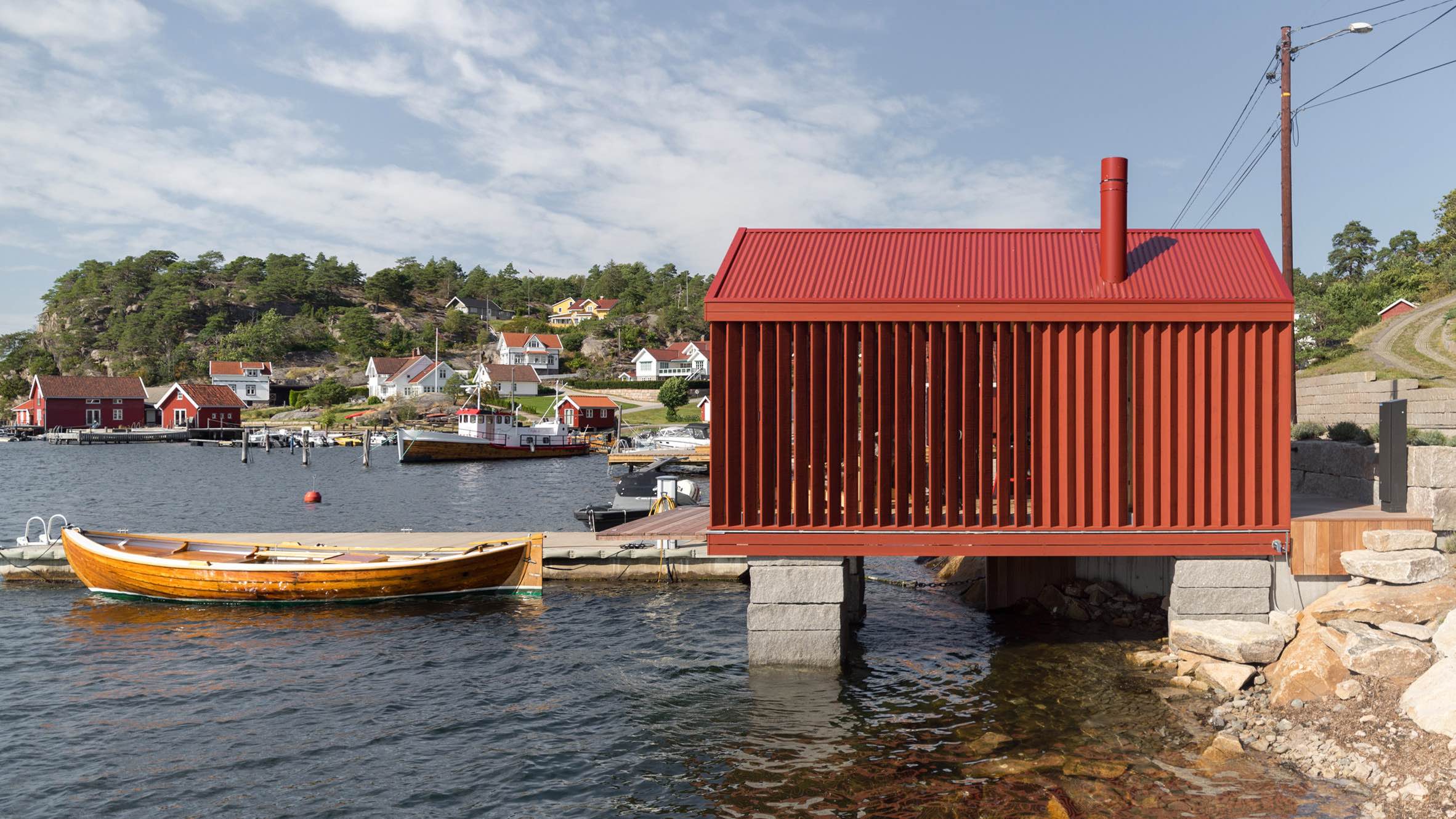 Projekt, nazwany Bathhouse, czerpie bezpośrednio z lokalnej tradycji architektonicznej. Jego forma i intensywnie czerwona kolorystyka nawiązują do klasycznych norweskich boathouse’ów, od lat obecnych w nadmorskim krajobrazie. Architekci nie zdecydowali się jednak na dosłowne odtworzenie historycznego wzorca, lecz zaproponowali jego współczesną reinterpretację, balansującą pomiędzy znajomością a nowoczesnością.