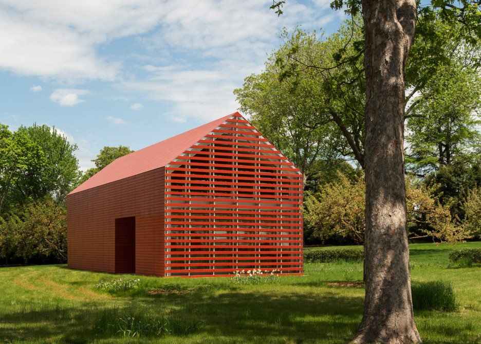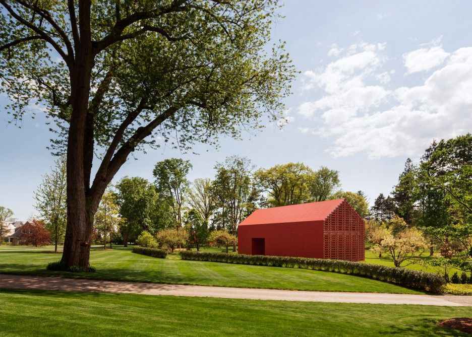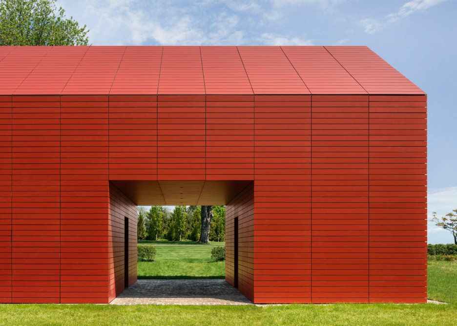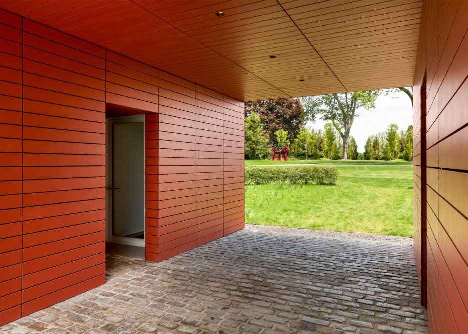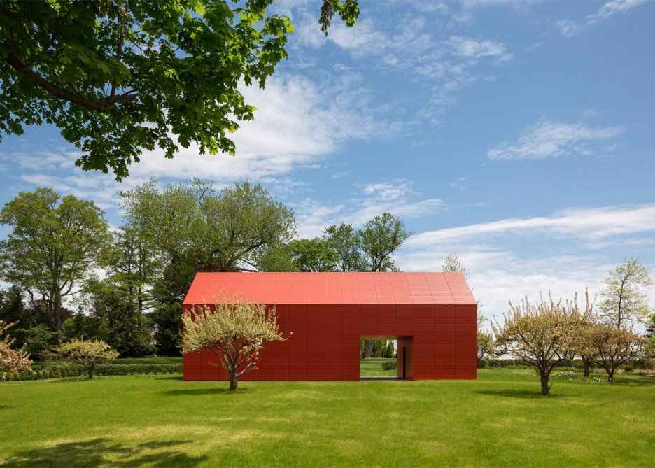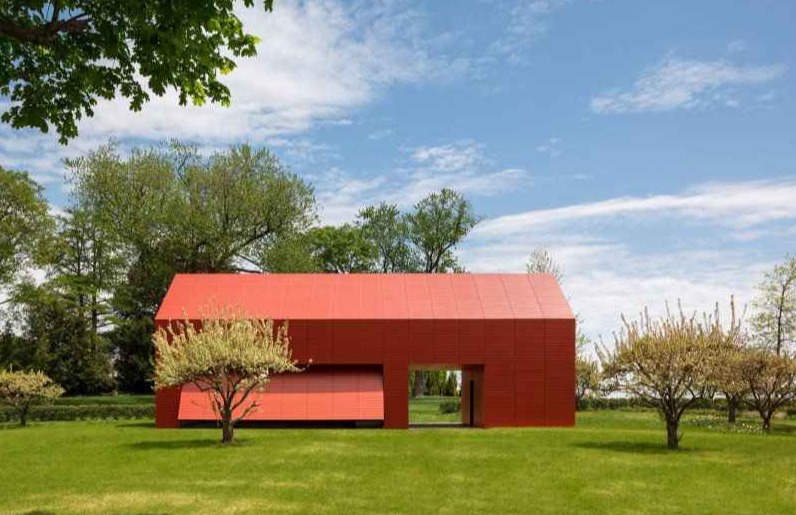 Firma Roger Ferris + Partners z Connecticut zaprojektowała wyjątkowe artystyczne studio połączone z domem, którego bryła nawiązuje do klasycznej architektury Nowej Anglii. Ta nowoczesna stodoła została w całości obłożona jasnoczerwonymi listwami Swisspearl — wysokiej jakości cementem włóknistym — dzięki czemu z daleka wygląda jak jednolity, rzeźbiarski obiekt na tle wybrzeża. Projekt zdobył uznanie, otrzymując nagrodę Architizer A+ 2016 Popular Choice Winner w kategorii Architektura i Kolor, przede wszystkim za odważne, konsekwentne wykorzystanie intensywnej czerwieni.