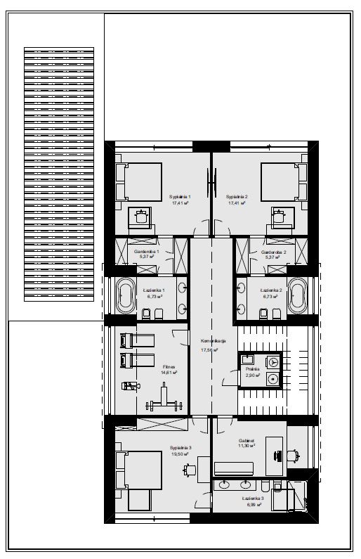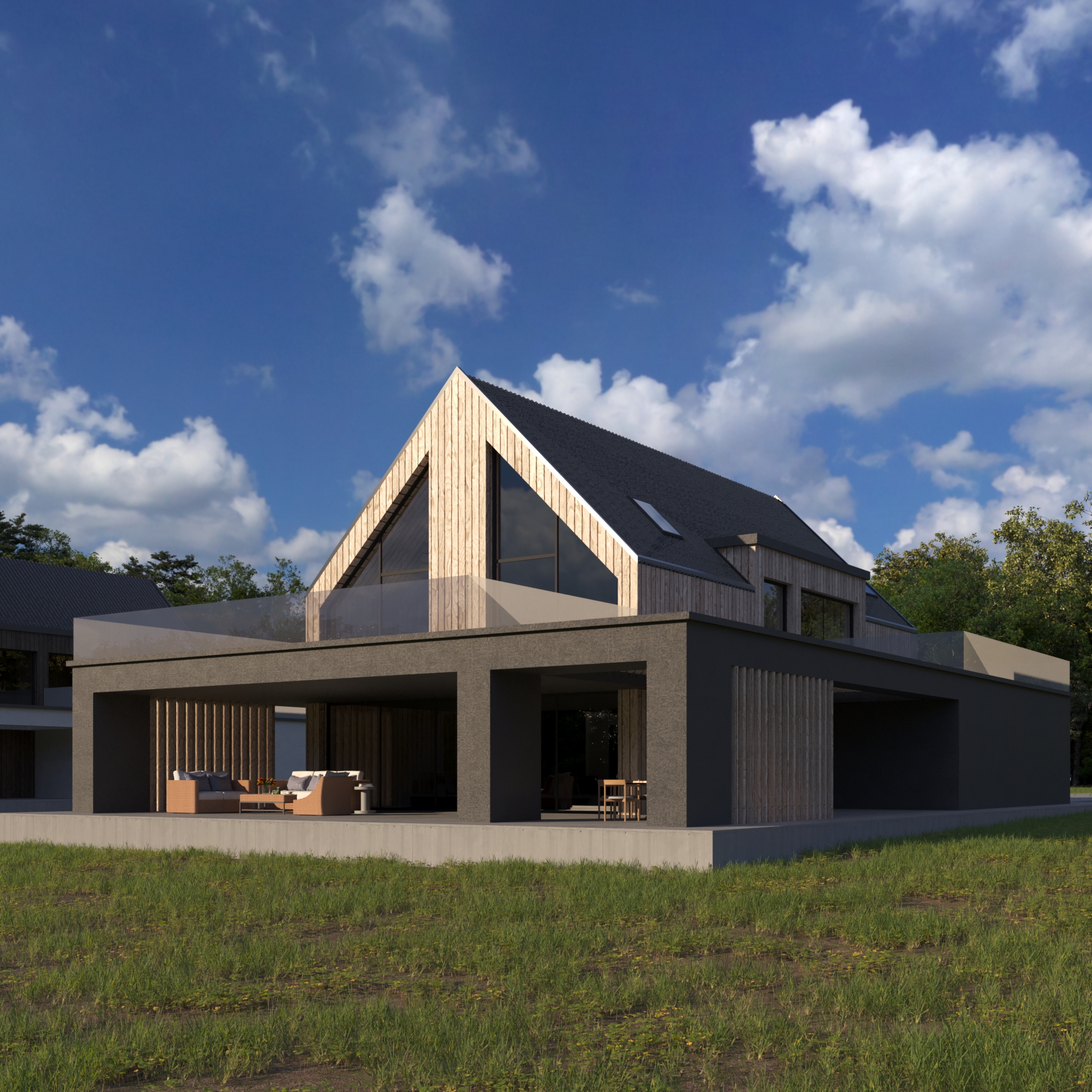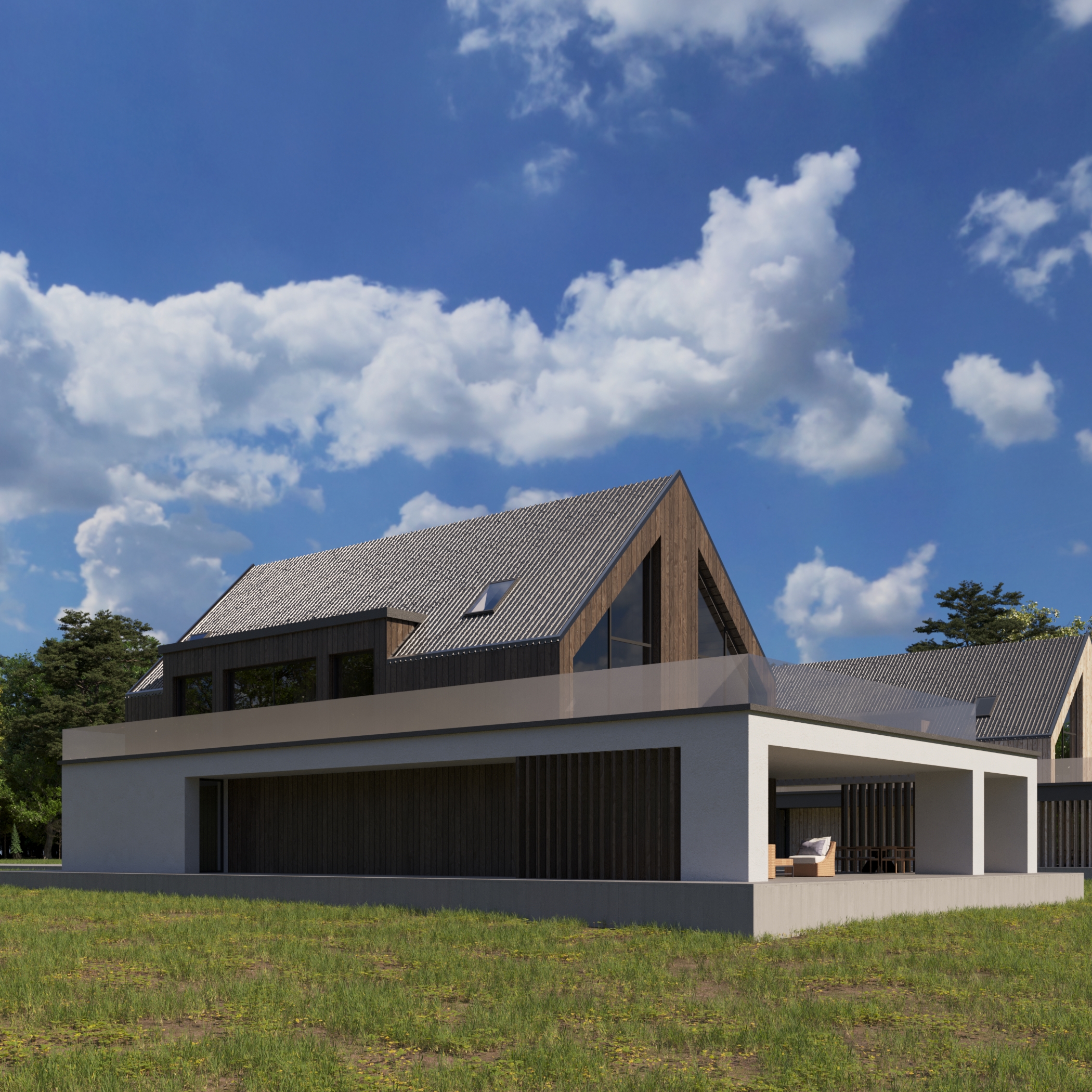 Cztery domy o powierzchni około 250 m² każdy wyróżniają się eleganckimi bryłami z dwuspadowymi, bezokapowymi dachami. Dwukondygnacyjna forma z użytkowym poddaszem łączy nowoczesność z praktycznym podejściem. Ciekawym akcentem są wykusze dachowe, które dodają poddaszu wyjątkowych walorów użytkowych i estetycznych. Zarówno na parterze, jak i na piętrze znajdują się przestronne tarasy – idealne do podziwiania widoków na jezioro i otaczającą przyrodę.