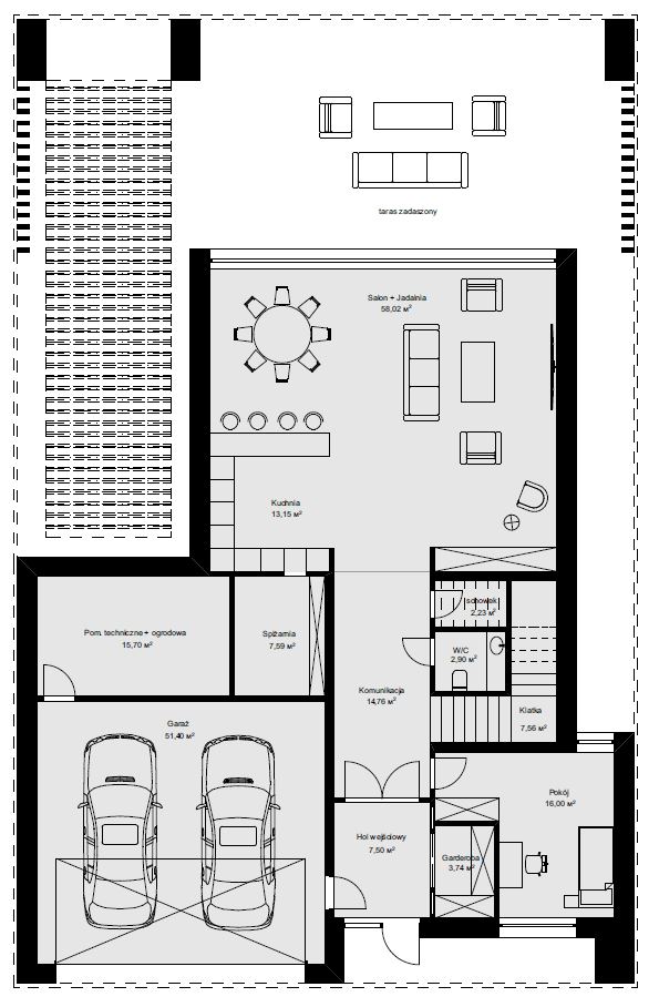 Strefa wejściowa, kuchnia i garaż umieszczone są od frontu budynku. Część dzienna zlokalizowana od strony południowo-zachodniej zapewnia maksymalne wykorzystanie światła i niezakłócony widok na jezioro. Na poddaszu zaprojektowano komfortową strefę master bedroom, oferującą prywatność i relaks.