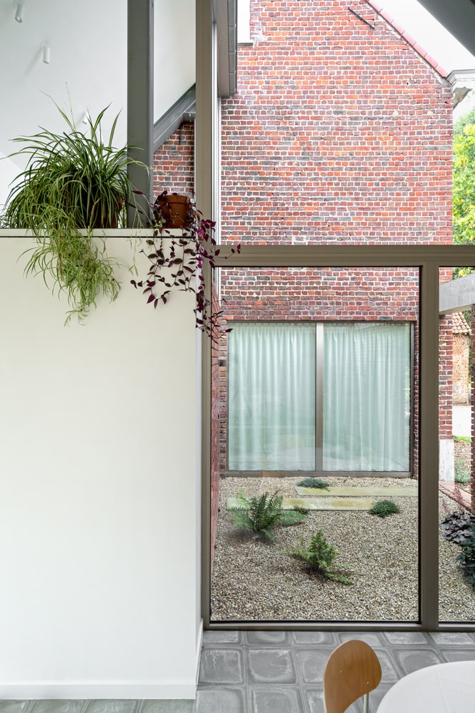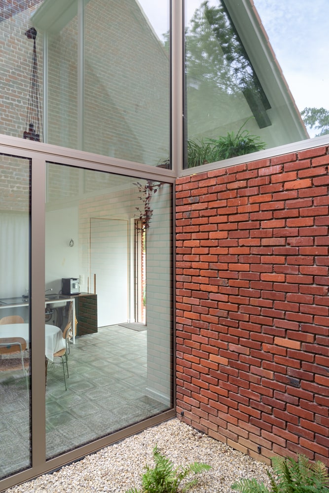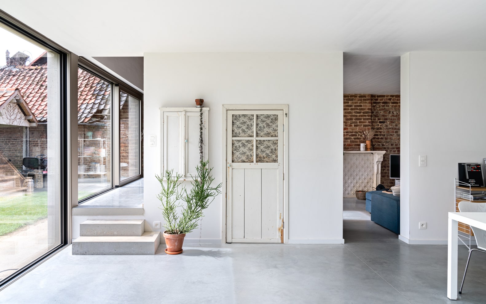 Front domu został starannie odnowiony zgodnie z pierwotną fasadą, zachowując historyczny charakter budynku, natomiast tylna elewacja została otwarta na otaczający krajobraz dzięki dużym przeszkleniom oraz betnowej konstrukcji portykowej, łączącej obie bryły w jedną spójną całość. Przestrzeń wejściowa prowadzi przez patio i jasny hol, łącząc stary dom i stodołę w integralną część mieszkalną obejmującą salon, kuchnię, jadalnię oraz magazyny. Duże okna zapewniają panoramę pól, a mieszanka surowej cegły, tynku i stali buduje kontrast między tradycją a nowoczesnością, nadając projektowi ciepły i autentyczny charakter.