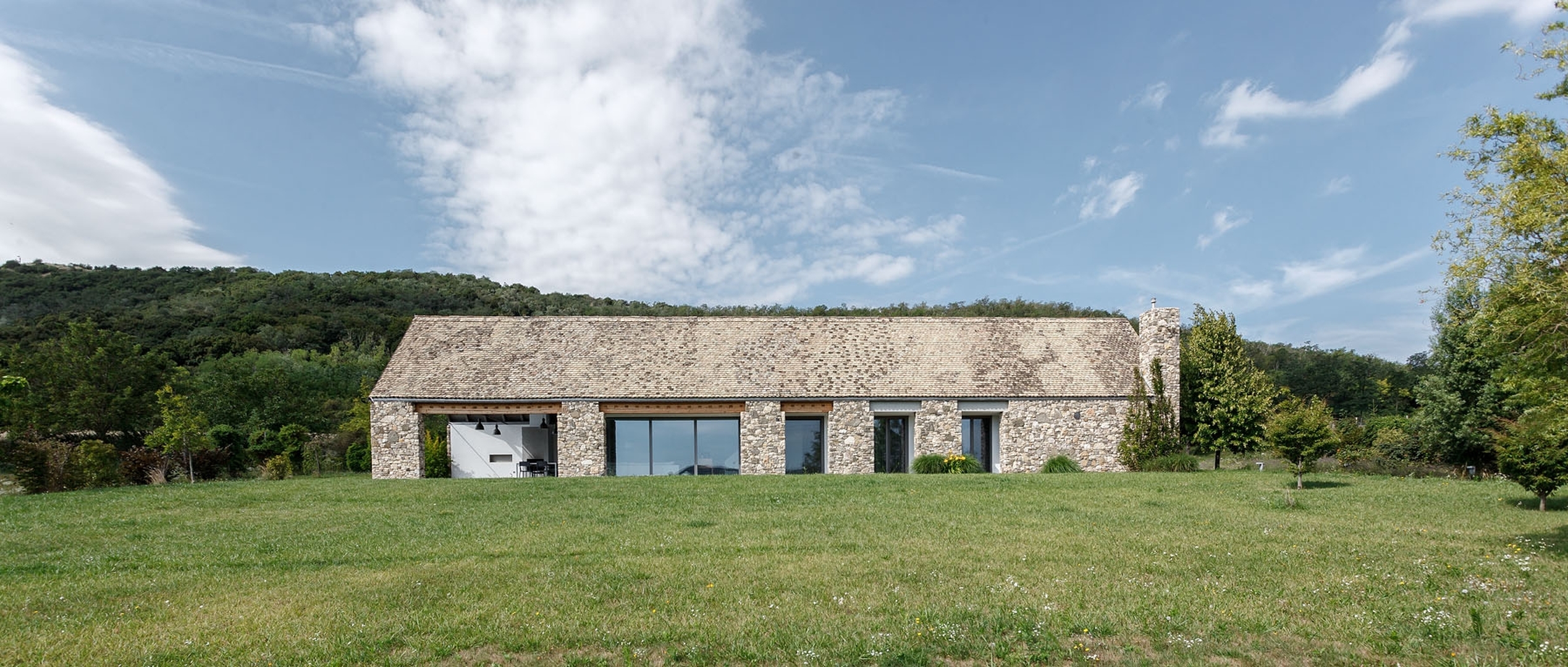 Budynek o imponującej długości 33 metrów i powierzchni 236 m² został wkomponowany w otaczającą przyrodę zgodnie z wytycznymi Urzędu Ochrony Przyrody Székesfehérvár. Jednym z kluczowych założeń projektu było wykorzystanie materiałów pochodzących z rozebranych budynków w regionie. Potężne mury z lokalnego kamienia potasowego nie tylko zapewniają stabilność, ale też doskonale izolują wnętrze, pozwalając na komfortowy wypoczynek niezależnie od pory roku.