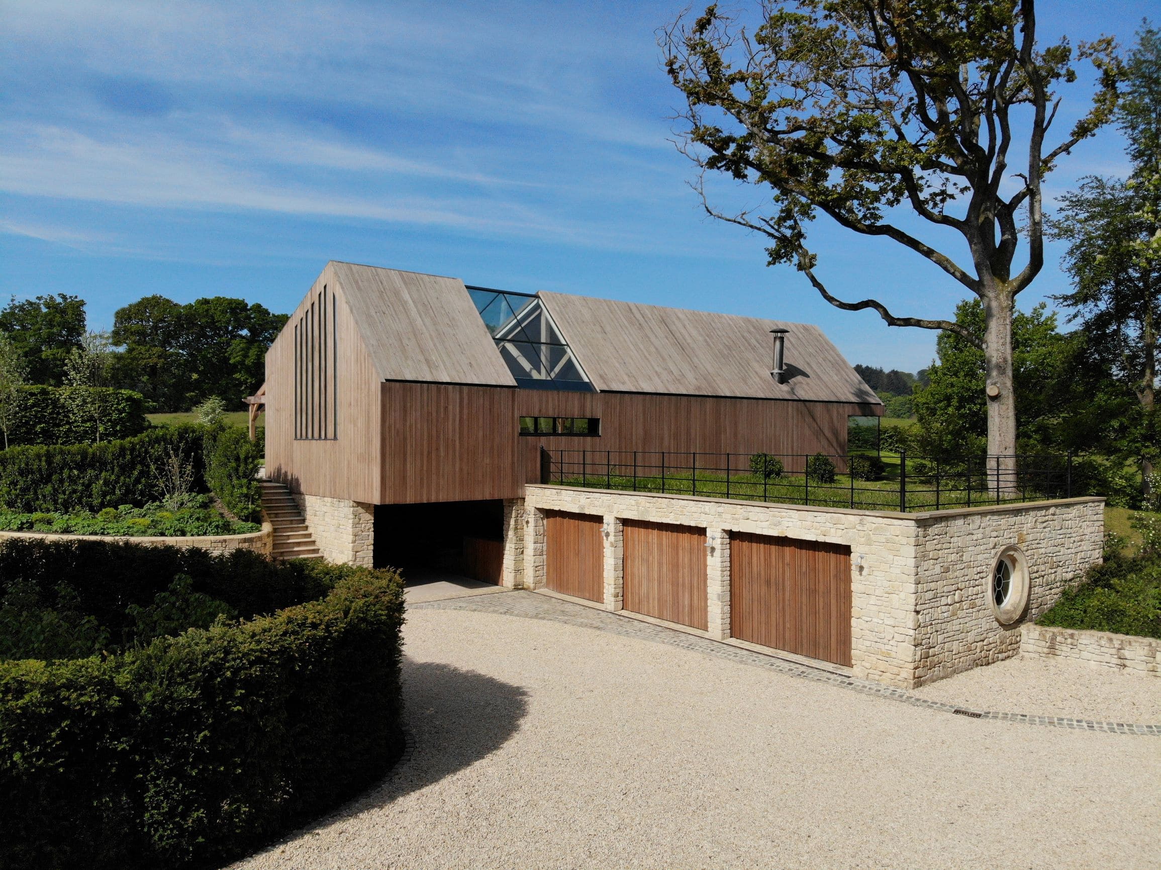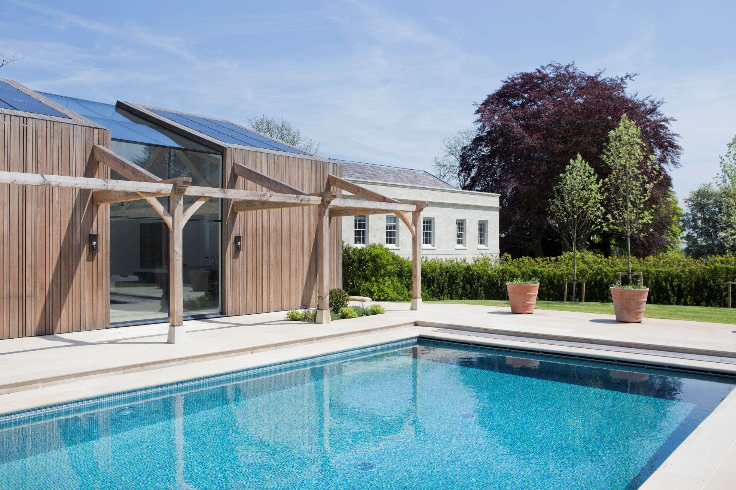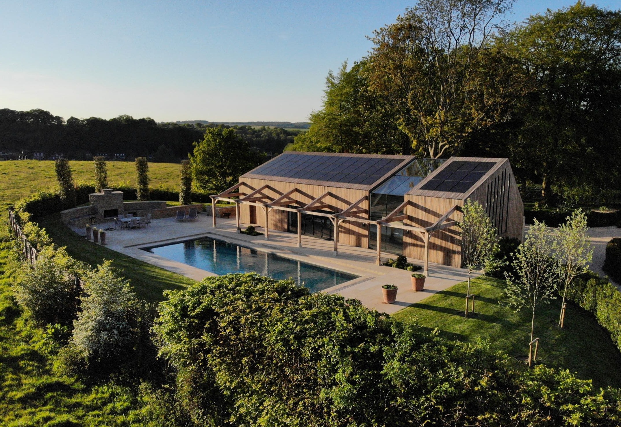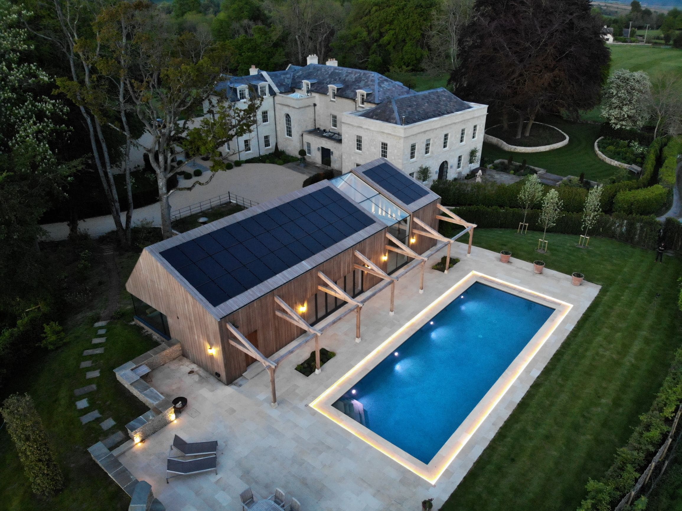 Richmond Bell Architects zostali poproszeni o zaprojektowanie nowoczesnej oficyny na terenie historycznej posiadłości Fonthill w Tisbury, hrabstwie Wiltshire. Inwestorzy oczekiwali przestrzeni, która będzie służyć jako studio pilates, domek przy basenie oraz zaplecze techniczne. Budynek miał również pomieścić trzy przestronne wnęki garażowe, a także specjalnie wydzielone strefy na instalacje technologiczne – m.in. kocioł na biomasę oraz zasobnik na pelety. Projekt musiał zatem łączyć funkcjonalność, estetykę oraz ekologiczne podejście do energii.