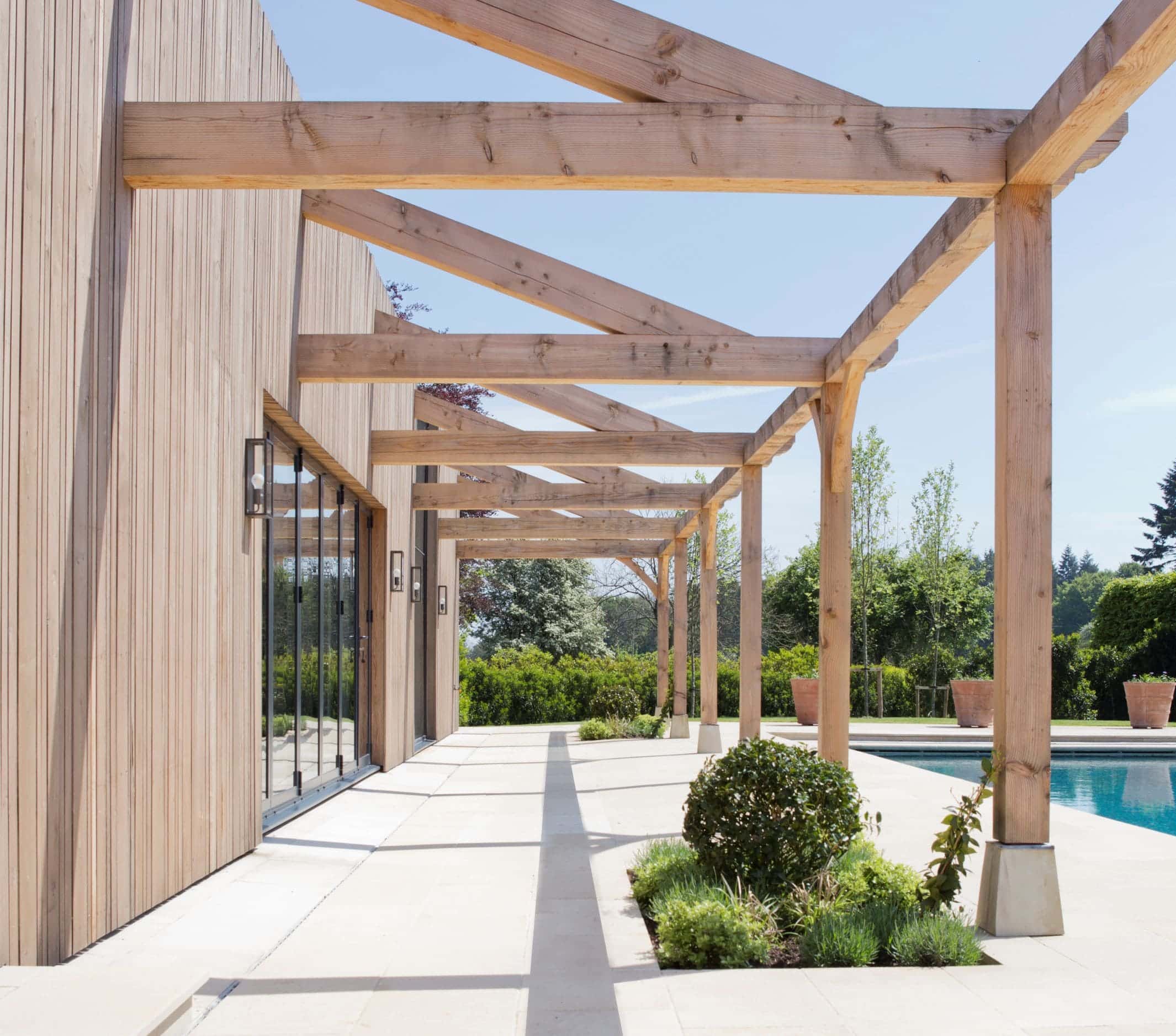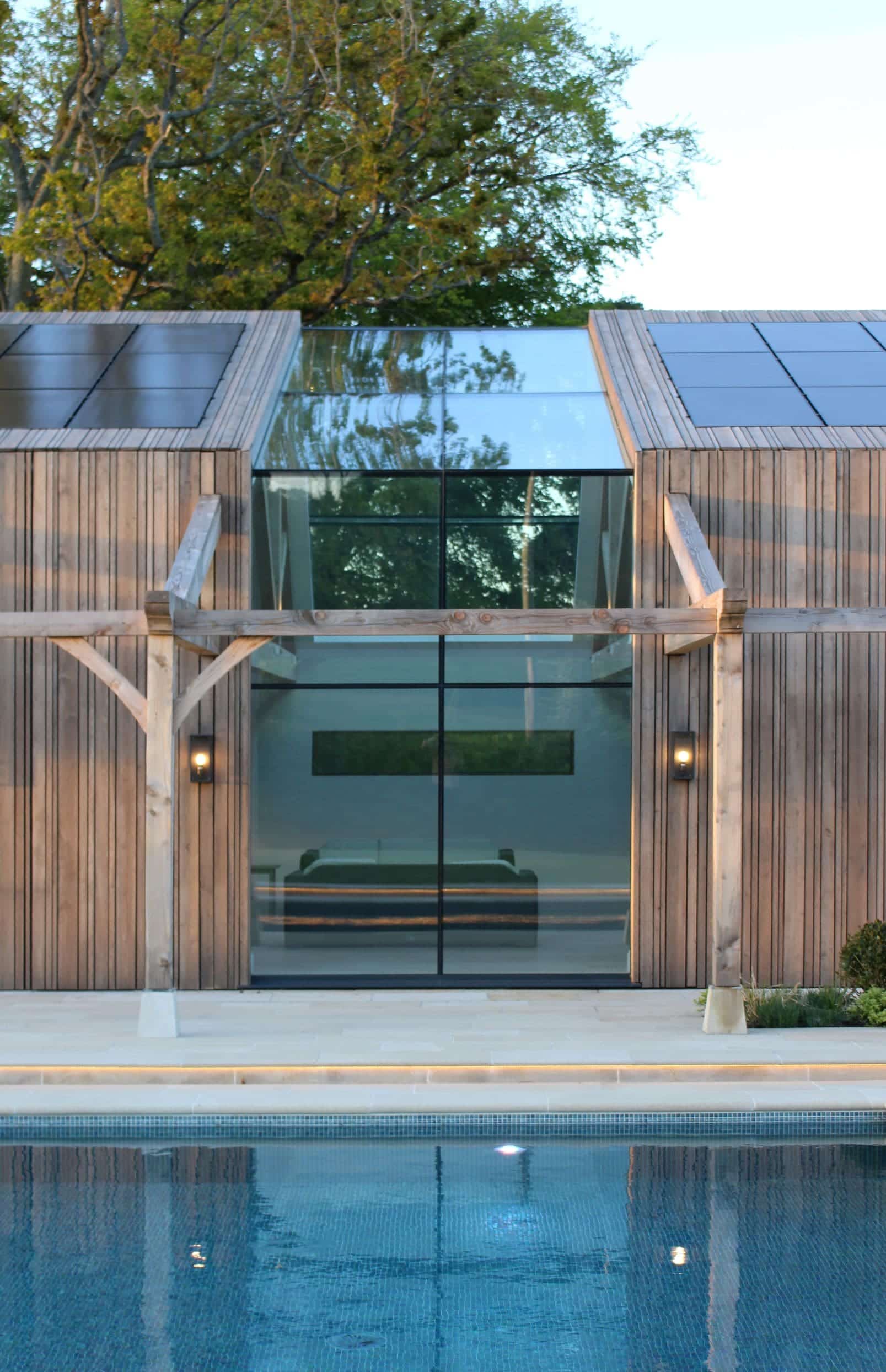 Architekci zaproponowali minimalistyczną bryłę z dużymi przeszkleniami, która wtopiła się w otoczenie ogrodów posiadłości. Dzięki zastosowaniu naturalnych materiałów, budynek doskonale wpisuje się w kontekst miejsca, przypominając formą nowoczesną stodołę, która nie konkuruje z głównym domem, lecz go uzupełnia. Część mieszkalna otwiera się na basen i strefę relaksu, tworząc idealne warunki do wypoczynku i aktywności fizycznej. Równocześnie układ przestrzenny zapewnia prywatność i wygodny dostęp do zaplecza technicznego.