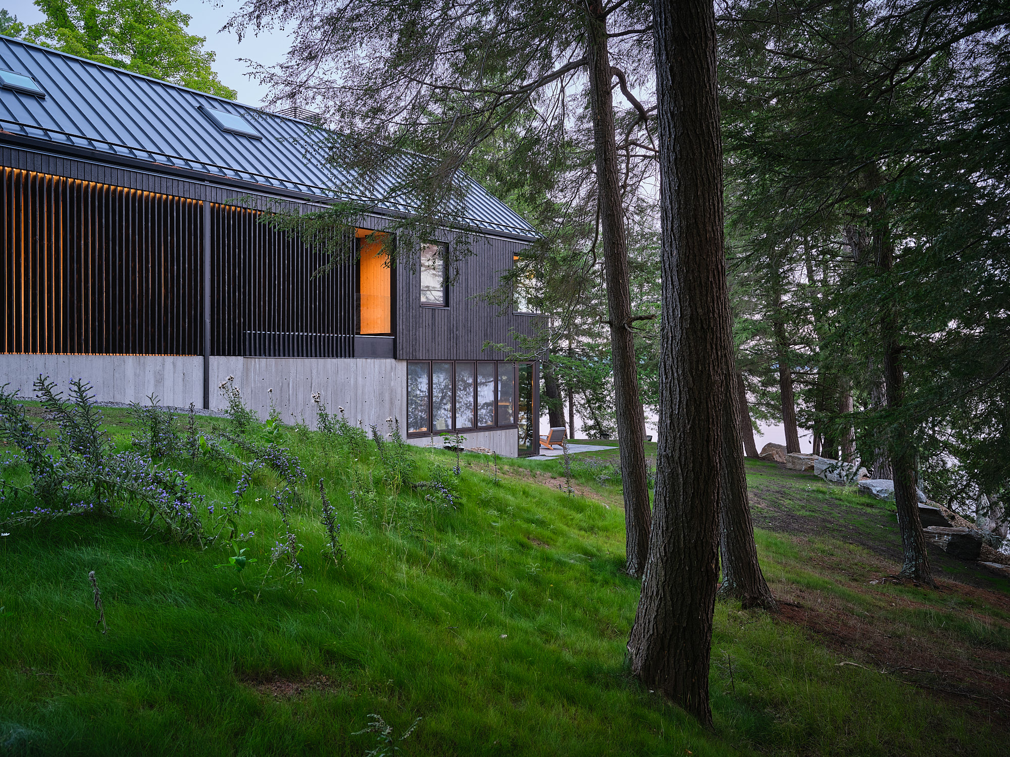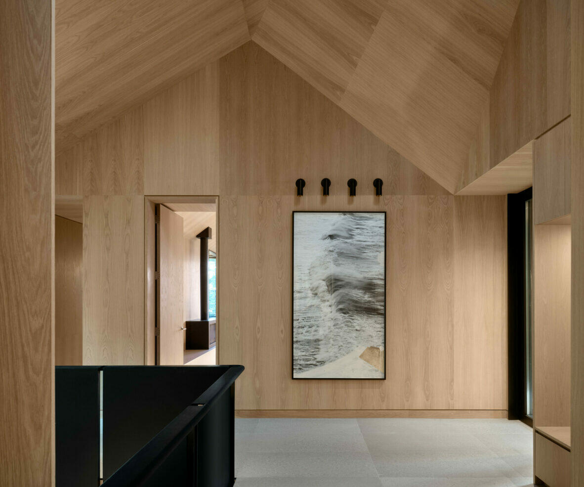 Wędrując przez zagajnik, w którym jelenie ogołociły pnie drzew u podstawy, nagle dostrzega się zarys domu – jego węgielkowy dach przebija się przez rytm pionowych sylwetek. Ta dramatyczna forma, widoczna wśród drzew, tworzy silną grę kontrastów – między pionem a poziomem, otwartością a intymnością, konstrukcją a otaczającym krajobrazem. To przestrzeń, która nie narzuca się, lecz subtelnie współistnieje z naturą, zarówno się w niej chowając, jak i odsłaniając.