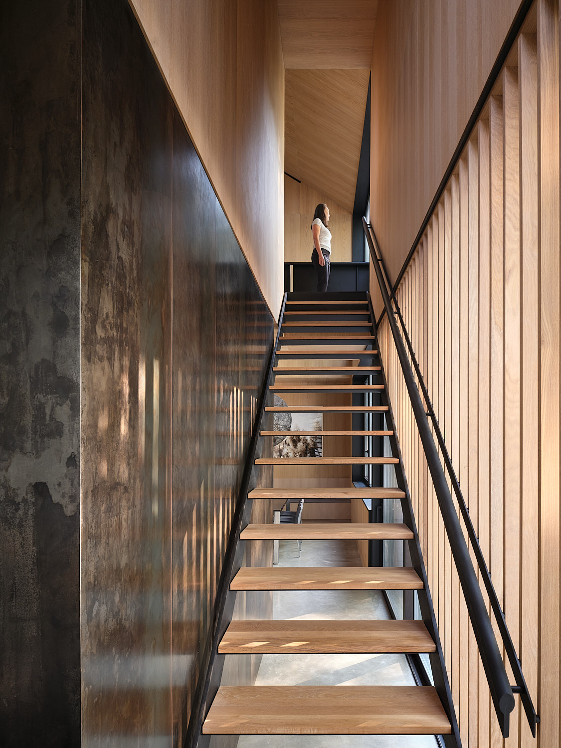 Z zewnątrz dom wygląda jak współczesny monolit – ciemna bryła z dwuspadowym dachem pokrytym wąskimi listwami, z których uformowano również elewację frontową. Wieczorem listwowa fasada subtelnie przepuszcza światło, zapowiadając ciepłe, jasne wnętrze. We wnętrzu dominuje jasny, naturalny dąb – starannie dopasowane panele ścienne kryją szafy, systemy instalacyjne i dyskretne oświetlenie, tworząc spójną i uspokajającą przestrzeń.