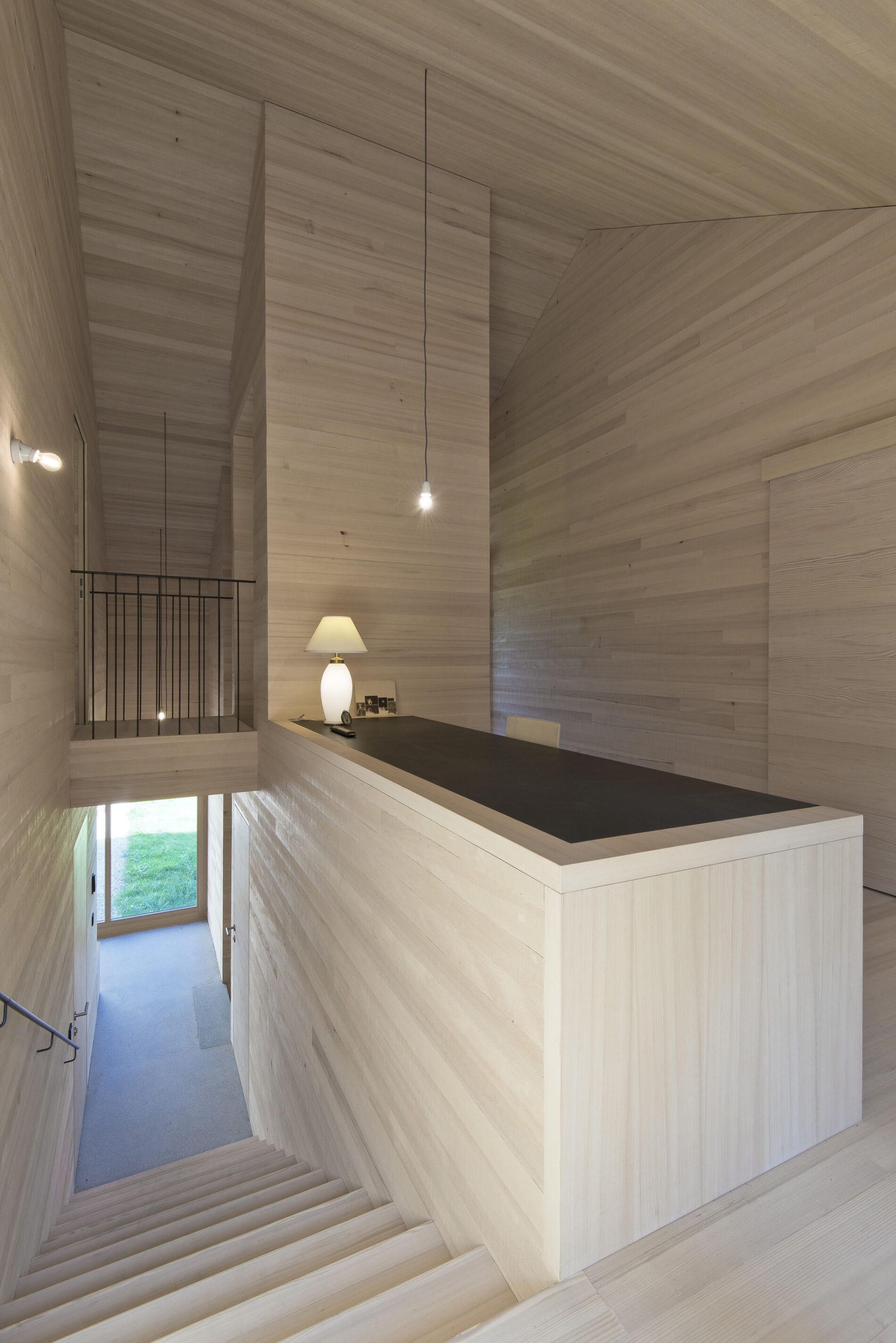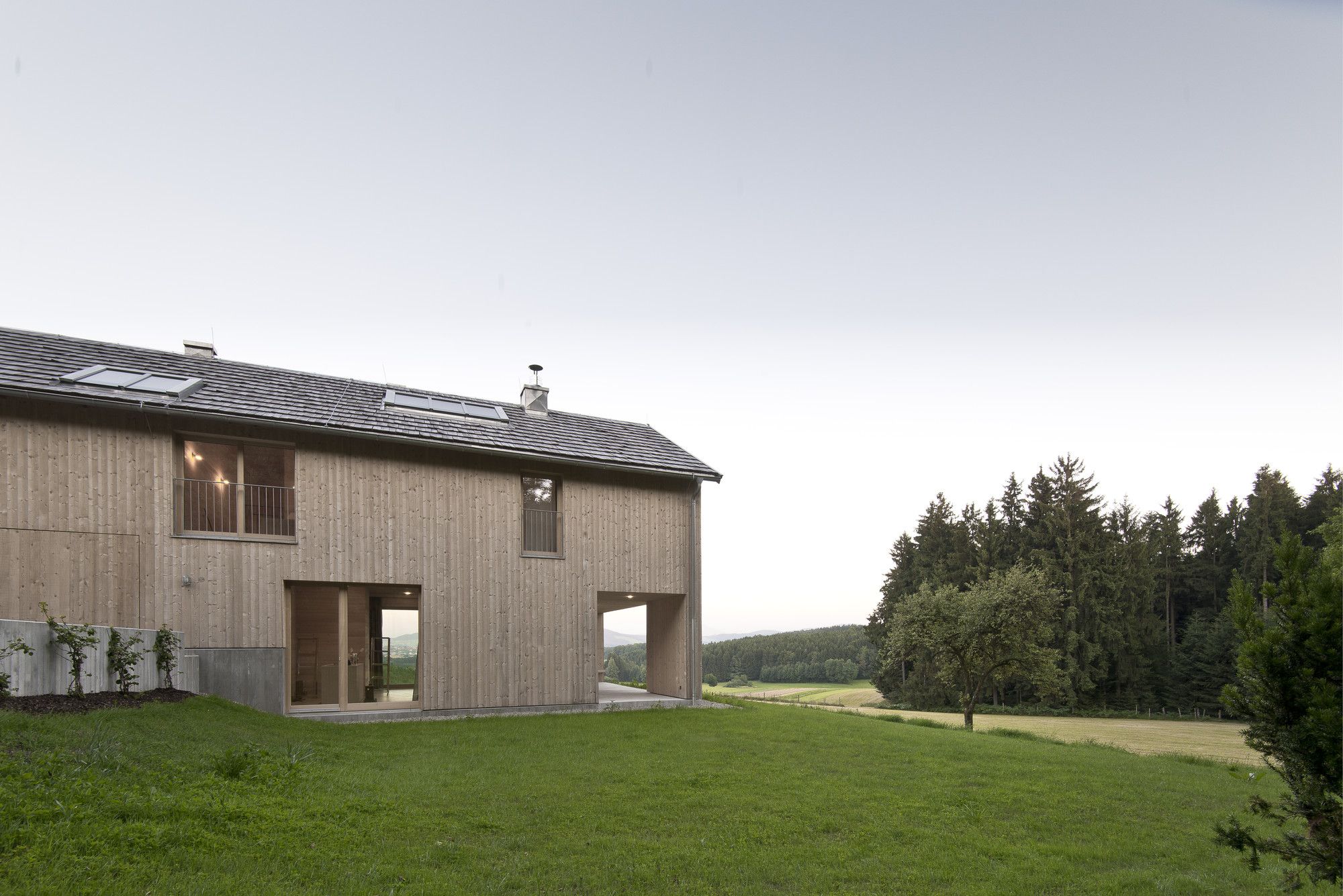 Dom główny oraz sąsiadujący domek dla gości tworzą przestrzeń zaprojektowaną jako przeciwwaga dla miejskiego życia – miejsce odpoczynku, ucieczki i regeneracji. Wnętrza wykończono deskami z drewna jodły pospolitej, które w połączeniu z prostymi, szlifowanymi podłogami tworzą ciepłe, naturalne i przestronne pomieszczenia. Starannie zaprojektowane okna i drzwi kadrują widoki na nierówny krajobraz i zapraszają naturę do środka. Optymalne wykorzystanie działki na zboczu, pochyłe dachy oraz zróżnicowane wysokości pomieszczeń nadają architekturze dynamiki i funkcjonalności. To przykład wiejskiego domu, który łączy tradycję, nowoczesność i ideę nowoczesnej stodoły jako harmonijnej formy życia blisko natury.