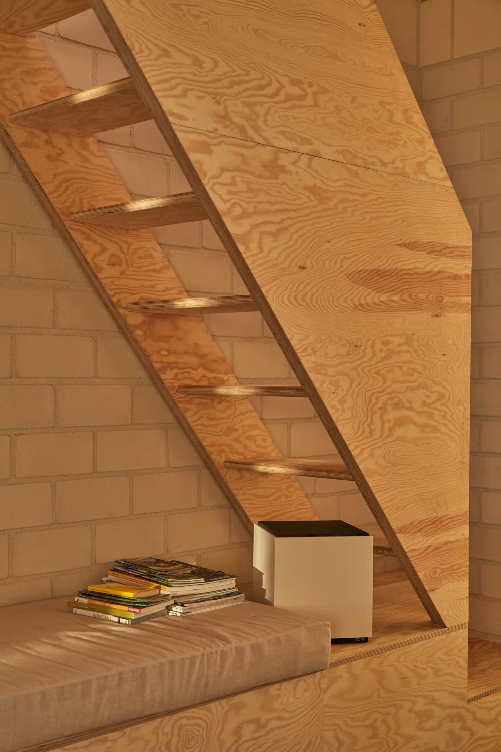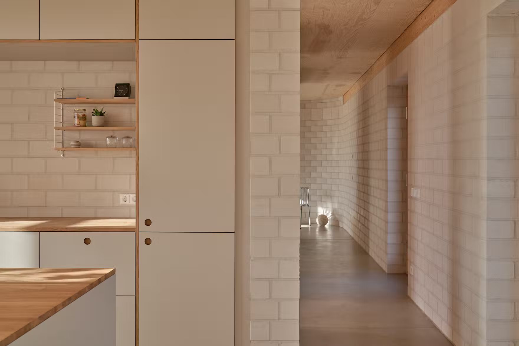 Dom ma prosty rzut z zakrzywioną ścianą od strony drogi i otwiera się w całości na zachodni krajobraz. Sypialnie i łazienka wychodzą bezpośrednio na duży, zadaszony taras, a szklane drzwi pozwalają połączyć wnętrze z ogrodem.