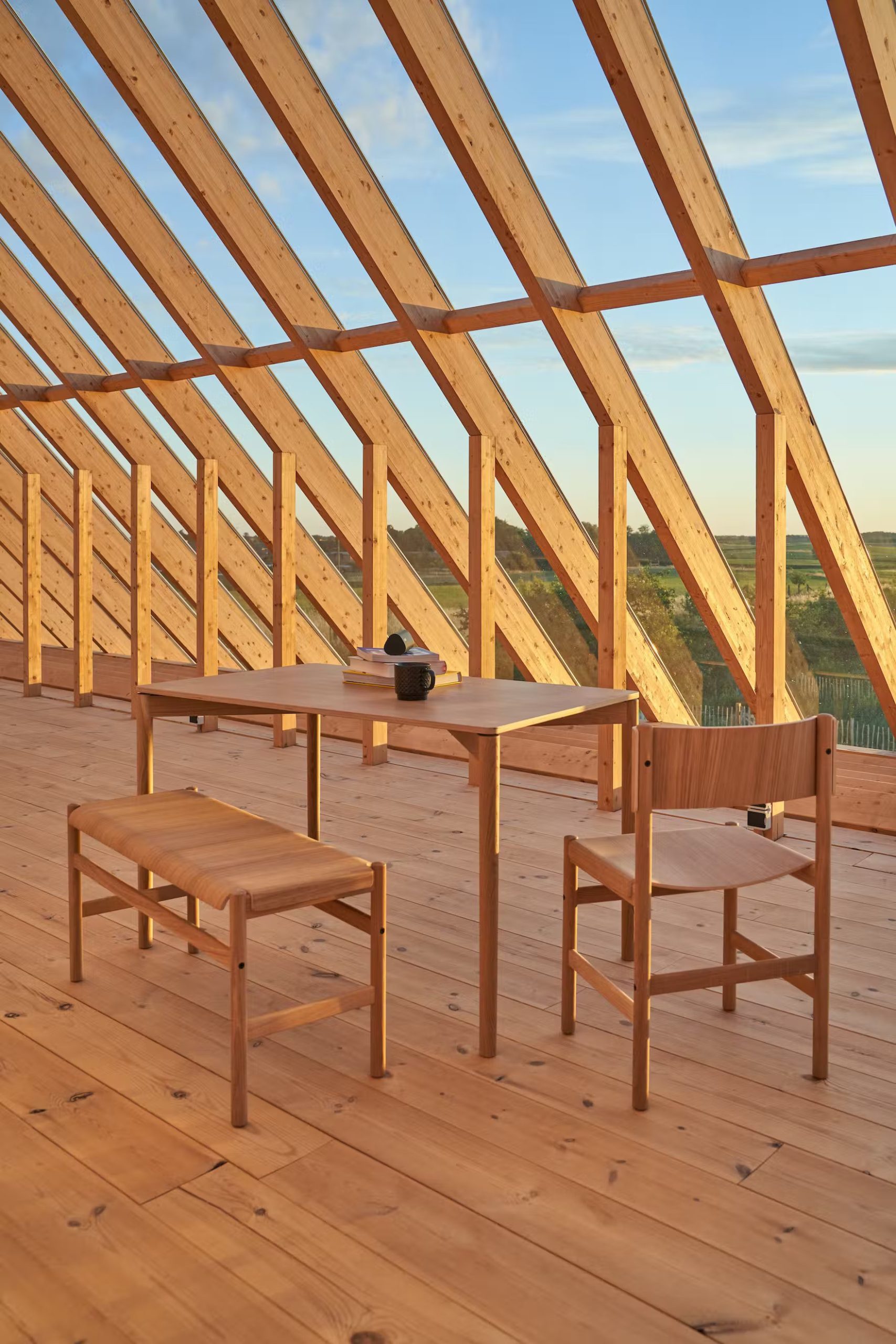 Największe wrażenie robi dach – od zachodu całkowicie przeszklony, tworzący szklarnię z widokiem na dolinę i zachody słońca. Wschodnią część pokryto poliwęglanem, który zmienia barwy wraz z ruchem słońca.