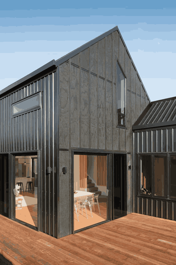 Projekt Davis Residence opiera się na koncepcji nowoczesnej stodoły, której forma składa się z dwóch brył o minimalistycznej estetyce. Mniejsza konstrukcja obejmuje wejście, gabinet oraz strefę funkcjonalną, nawiązując do uliczki biegnącej obok posesji. Budynek został połączony z prostokątnym garażem, dopełnionym podjazdem i pergolą. Dzięki temu całość zyskała harmonijną skalę i spójność z lokalnym krajobrazem, tworząc idealne połączenie nowoczesności, prostoty i nadmorskiego klimatu.
