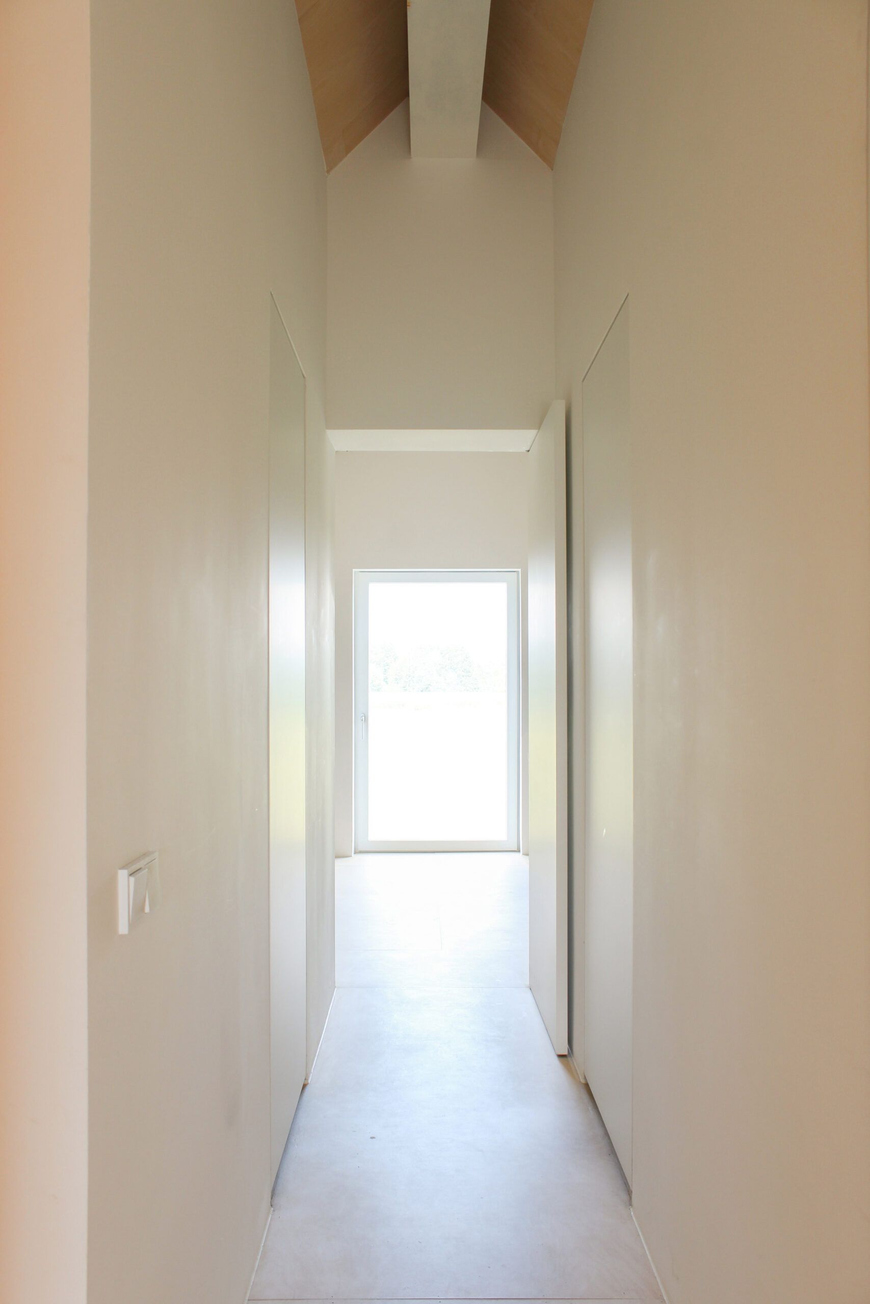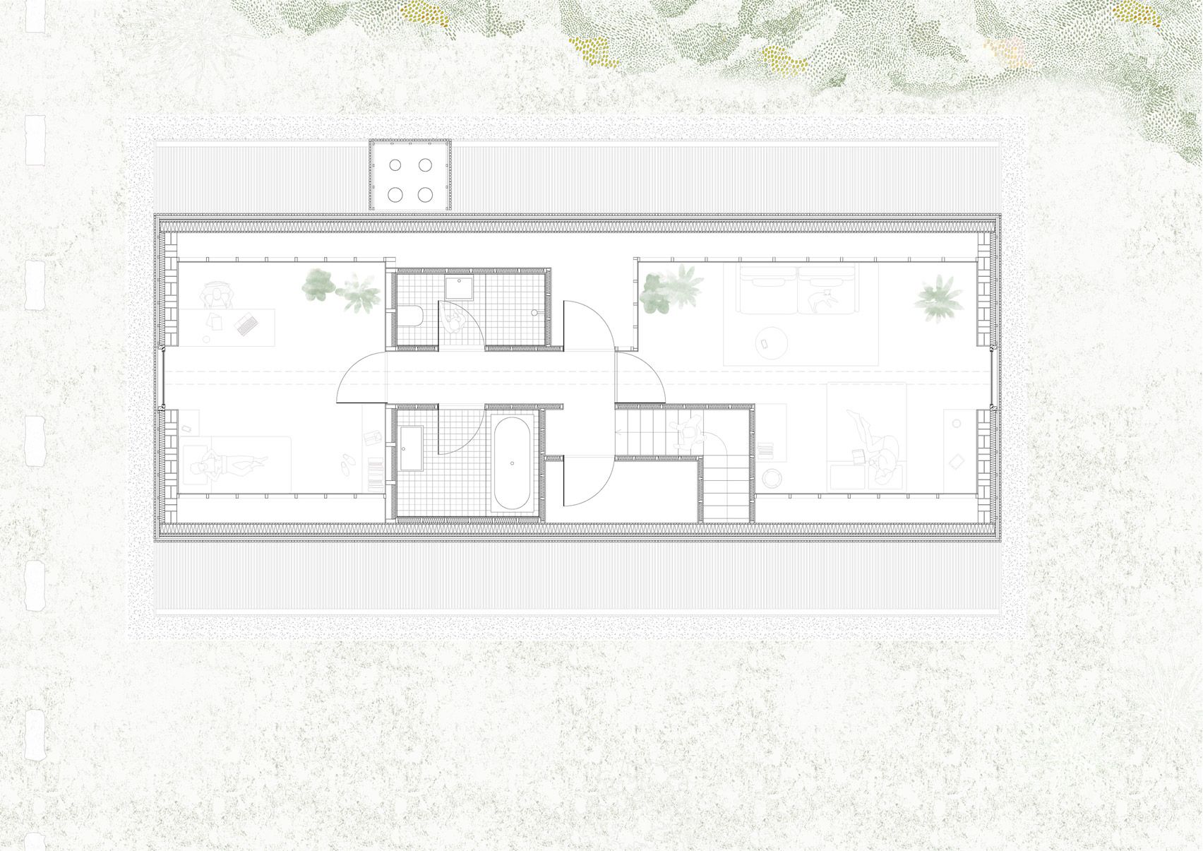 Przestrzenie znajdujące się na piętrze są mniej wyeksponowane na krajobrazy. Okna znajdujące się na obu końcach centralnego korytarza doświetlają drogę do ciepłych, wyłożonych sklejką pokojów. Aby zachować styl pozostałej części domu, komin w salonie został obity takimi samymi listewkami, które zastosowano na elewacji.
