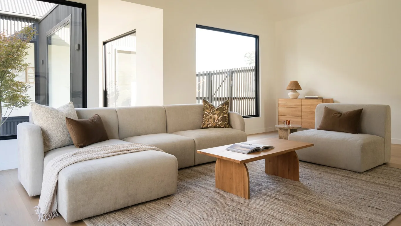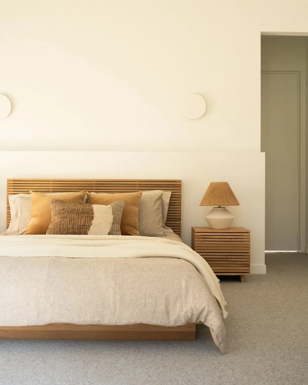 Każda z trzech sypialni w Daylesford Project została urządzona w duchu spokoju i wyciszenia. Główna sypialnia wyróżnia się łóżkiem Doze z luźną tkaniną i widocznymi przeszyciami, dopełnionym przez klasyczne stoliki nocne Harmony z litego dębu. Druga sypialnia oferuje naturalne ciepło dzięki łóżku i meblom o ażurowej strukturze, a trzecia otwiera się na widok zieleni, wprowadzając do wnętrza aurę relaksu dzięki łóżku Serene i stolikowi Ambience. Subtelna paleta barw – beże, szarości, biel i naturalne drewno – dopełnia spokojny, wyważony klimat.
