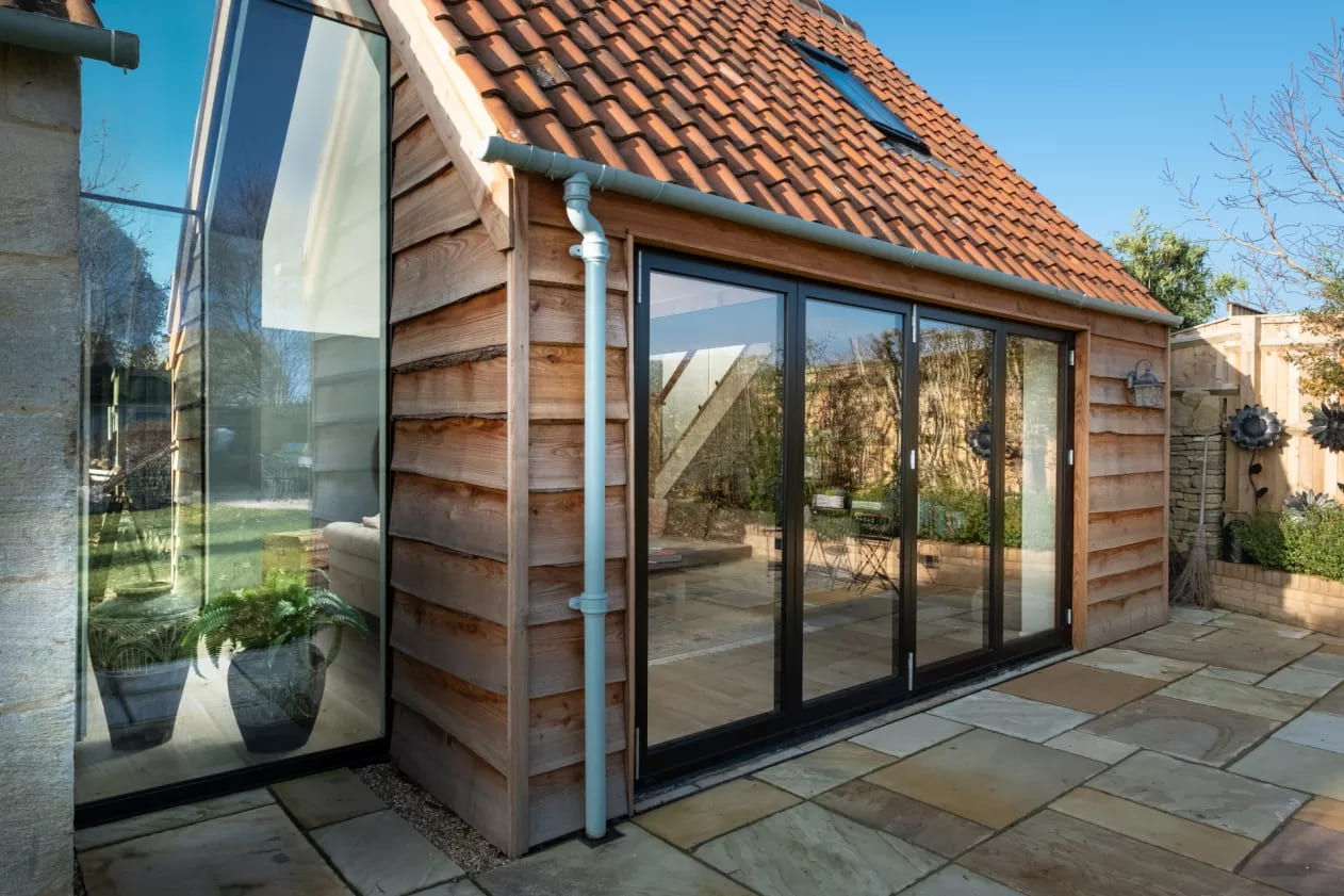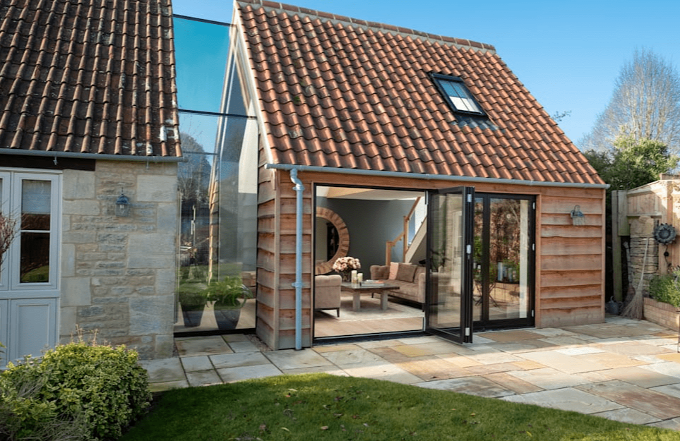 Szklane połączenie pozwala na wprowadzenie do wnętrza domu wyjątkowego poziomu światła, rozjaśniając zarówno przestrzenie mieszkalne, jak i nową dobudówkę. Dzięki zastosowaniu nowoczesnych technologii przeszklenia, takie rozwiązanie nie tylko wprowadza do wnętrza naturalne światło, ale także poprawia energooszczędność budynku. Dodatkowo, po obu stronach szklanego łącznika zamontowane zostały duże, 4-szybowe aluminiowe drzwi składane, które zapewniają łatwy dostęp do ogrodu i tylnego patio. W miesiącach letnich, właściciele domu mogą przesuwać drzwi, tworząc płynne przejście między przestrzenią wewnętrzną a zewnętrzną, umożliwiając jednocześnie cyrkulację świeżego powietrza.