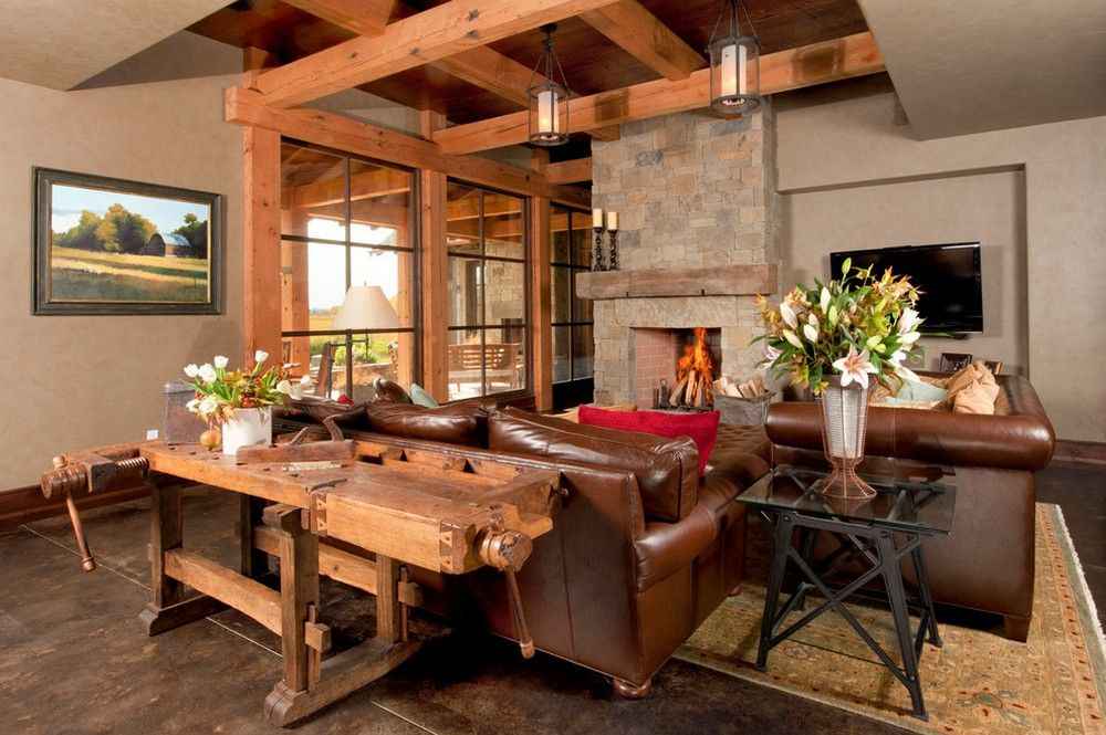 Wnętrze domu to spójna kompozycja naturalnych materiałów, takich jak kamień, lite drewno oraz skórzane meble w stylu vintage, które budują ciepłą i ponadczasową atmosferę. Centralnym punktem jest przestronny salon z kominkiem, otwarta kuchnia z dużą wyspą oraz jadalnia z widokiem na krajobraz Montany. Prywatna sypialnia oferuje panoramiczny widok na naturę, a funkcjonalne domowe biuro zapewnia komfort pracy. Całość projektu łączy cechy, które oferuje nowoczesna stodoła – prostą formę, naturalne materiały i silne powiązanie z otoczeniem – tworząc elegancki, a jednocześnie przytulny dom w stylu rustykalnym.