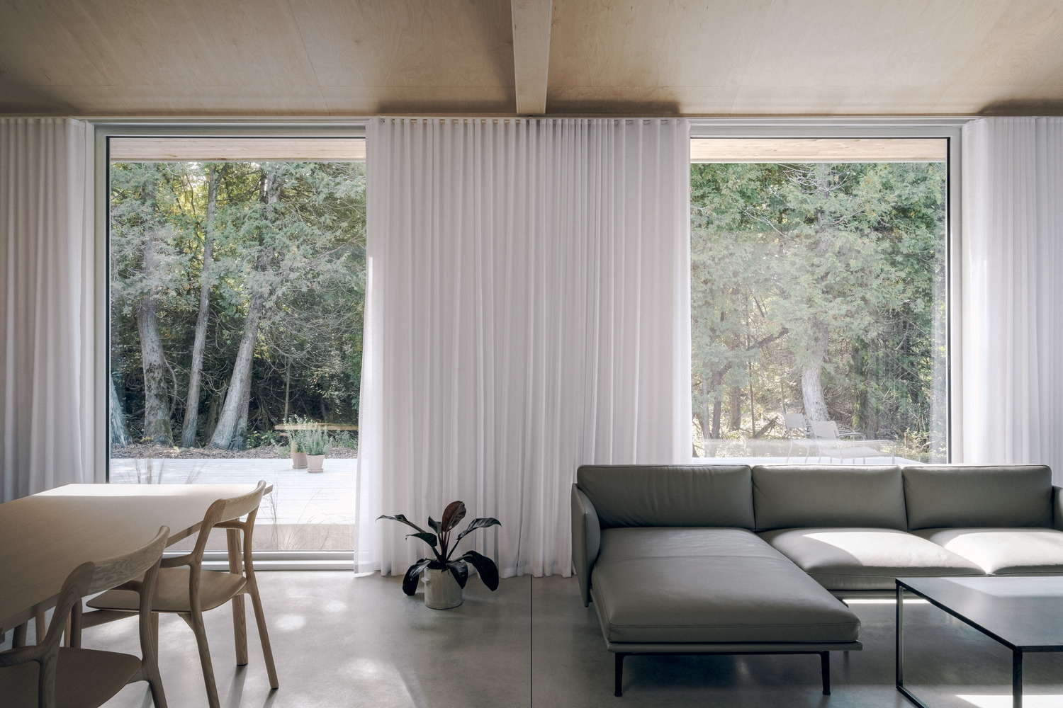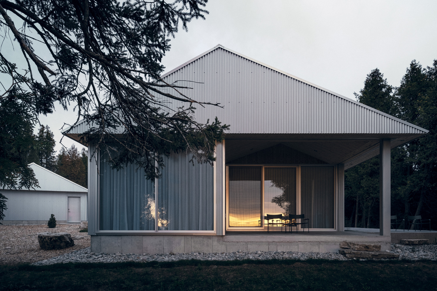 Devils Glen House, położony na malowniczym półwyspie Bruce, na północ od Toronto, to przykład nowoczesnej stodoły idealnie wkomponowanej w naturalny krajobraz. Projekt rozpoczął się od dwóch kluczowych założeń: po pierwsze, orientacji domu, by maksymalnie wykorzystać widok na jezioro, a po drugie, stworzenia dachu, który kształtuje światło, intymność i oferuje wyjątkowe punkty widokowe. Dzięki tym rozwiązaniom dom stanowi doskonały przykład architektury harmonizującej z naturą.