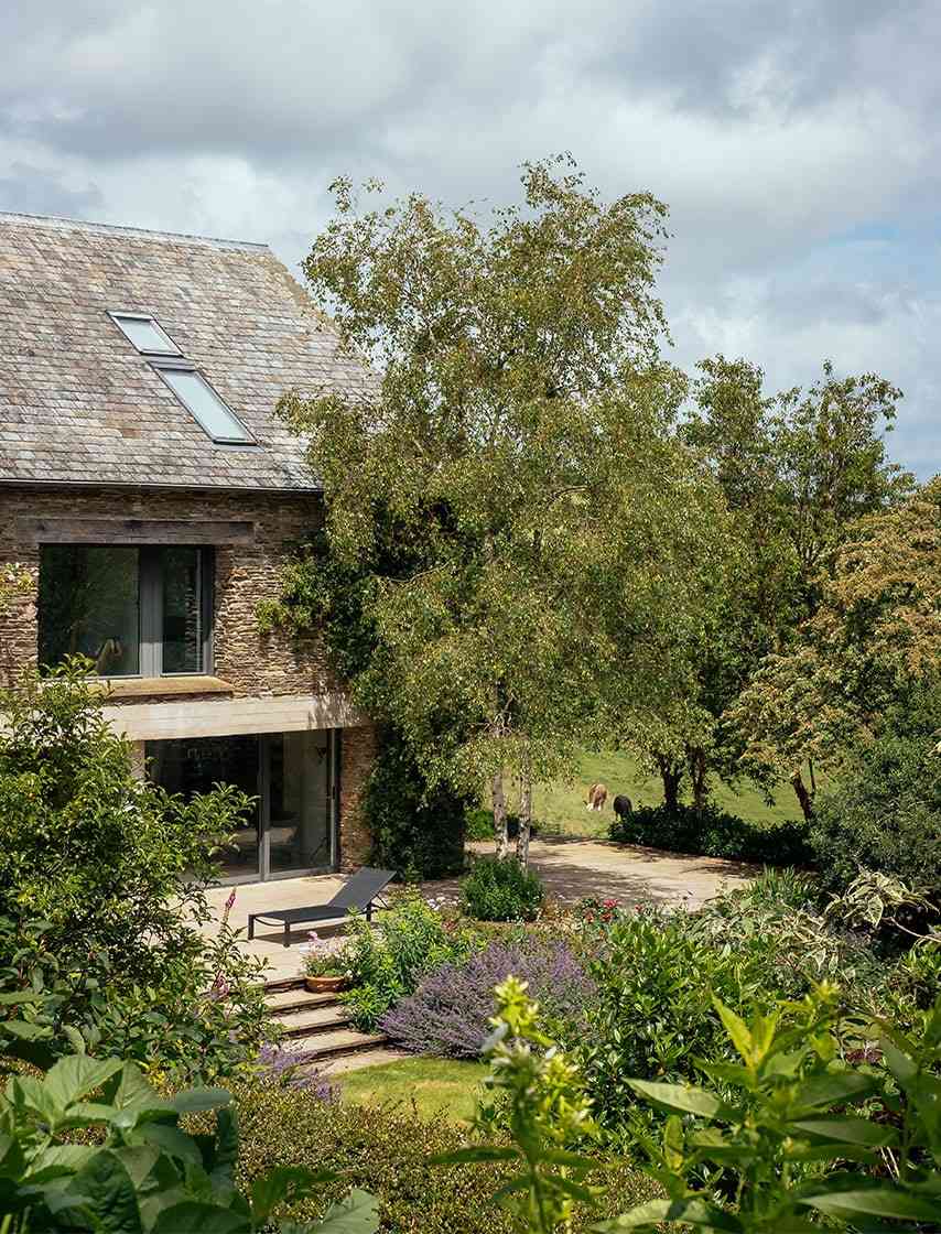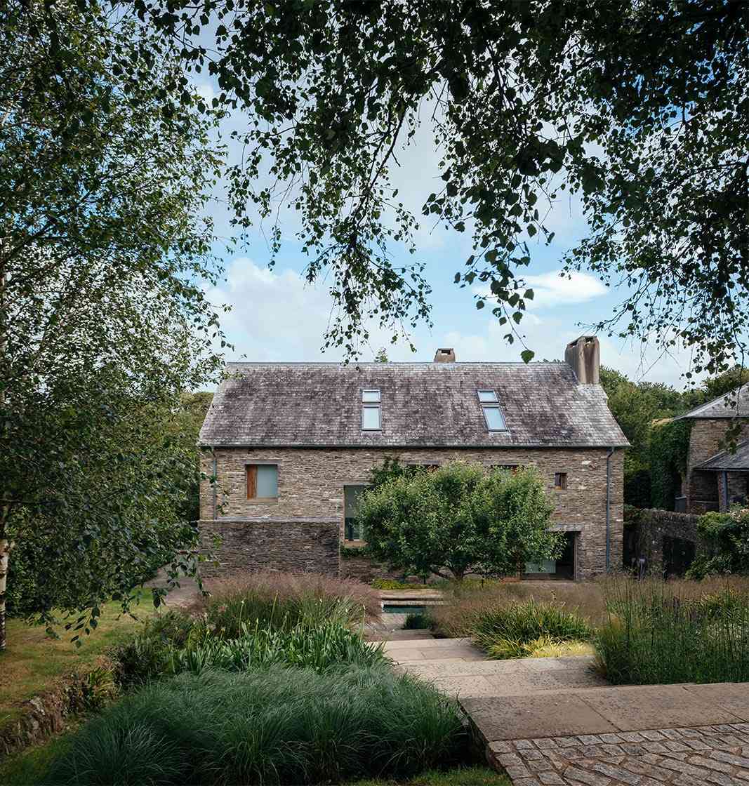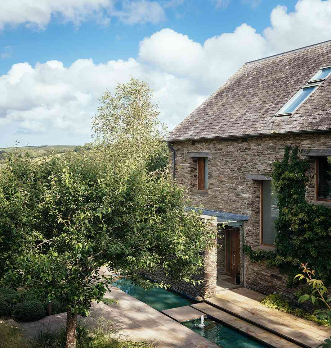 Architekci postawili na połączenie tradycji i nowoczesności, wykorzystując lokalne materiały w nowoczesny sposób. Ciemnoszary kamień odzyskany z rozbiórki dawnego budynku kontrastuje tu ze szkłem i betonem, tworząc elegancką kompozycję. Do drzwi prowadzi kamienna ścieżka biegnąca nad żwirową fosą – symboliczny element, łączący architekturę i ogrodnictwo, zgodny z duchem brytyjskiej architektury krajobrazowej. Devon Valley House stanowi wzorcowy przykład tego, jak nowoczesna stodoła może naturalnie wtopić się w krajobraz, stając się integralną częścią przyrody.