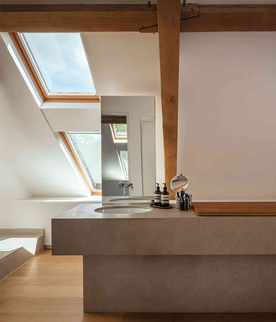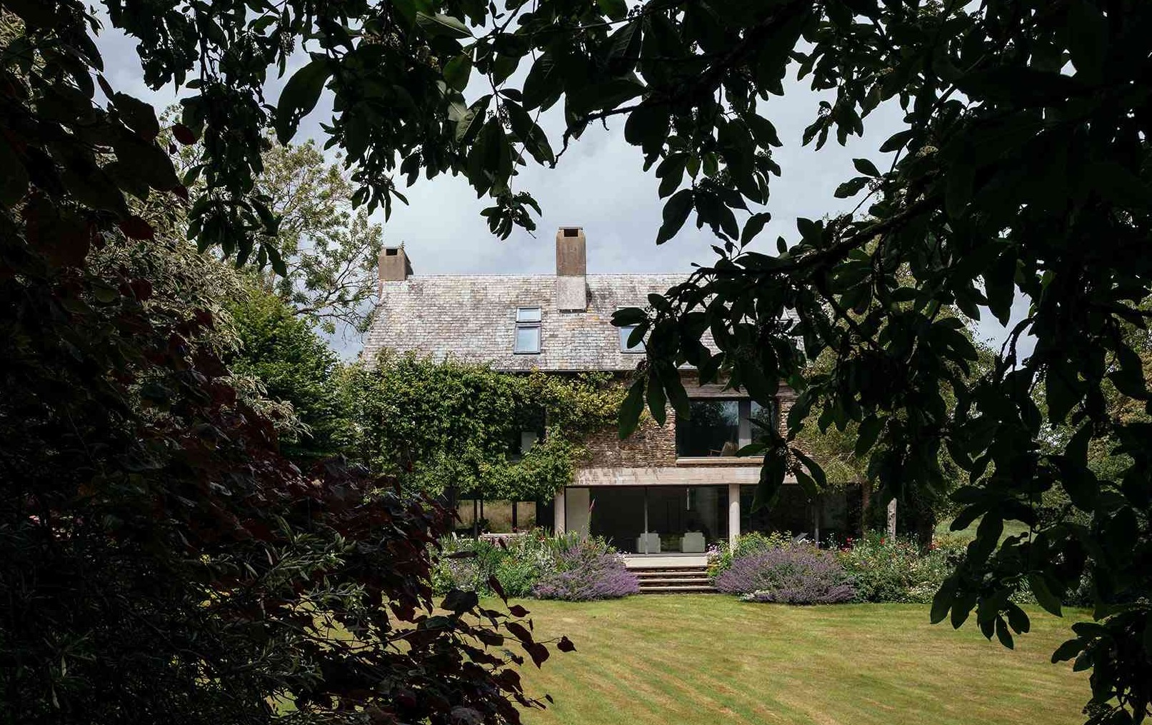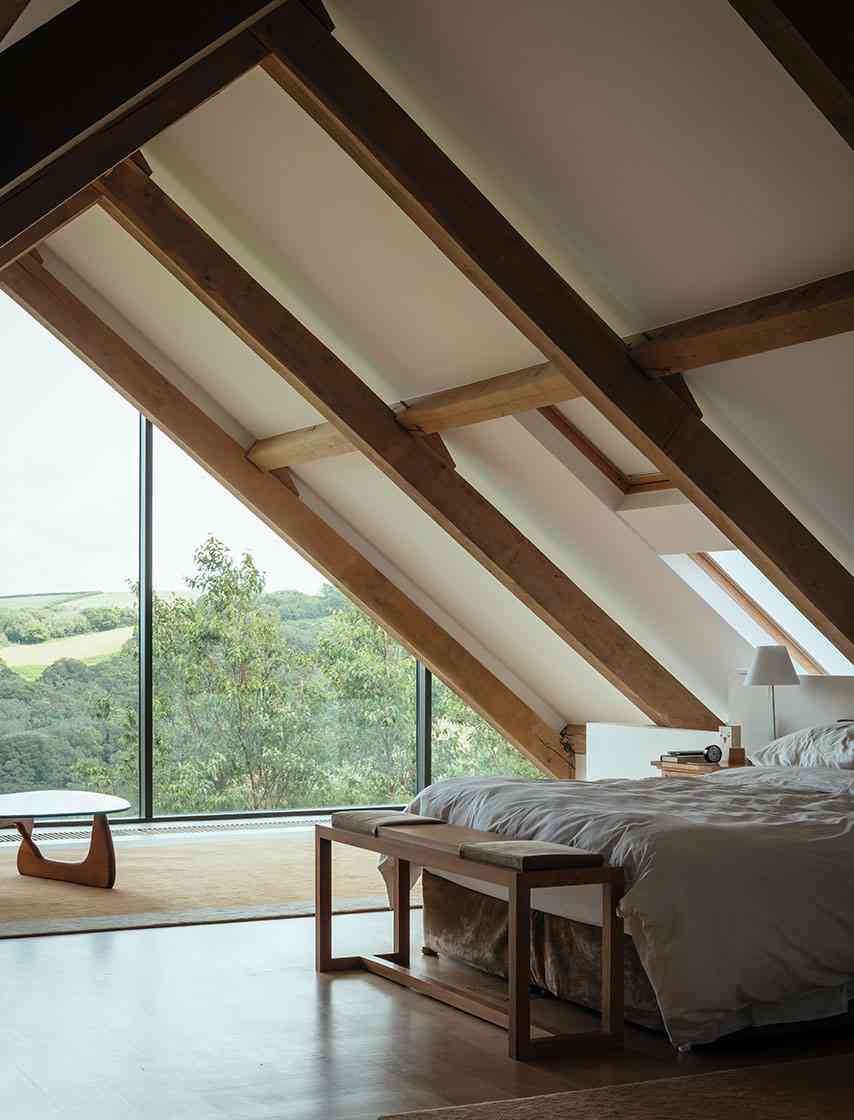Architekci postawili na połączenie tradycji i nowoczesności, wykorzystując lokalne materiały w nowoczesny sposób. Ciemnoszary kamień odzyskany z rozbiórki dawnego budynku kontrastuje tu ze szkłem i betonem, tworząc elegancką kompozycję. Do drzwi prowadzi kamienna ścieżka biegnąca nad żwirową fosą – symboliczny element, łączący architekturę i ogrodnictwo, zgodny z duchem brytyjskiej architektury krajobrazowej. Devon Valley House stanowi wzorcowy przykład tego, jak nowoczesna stodoła może naturalnie wtopić się w krajobraz, stając się integralną częścią przyrody.