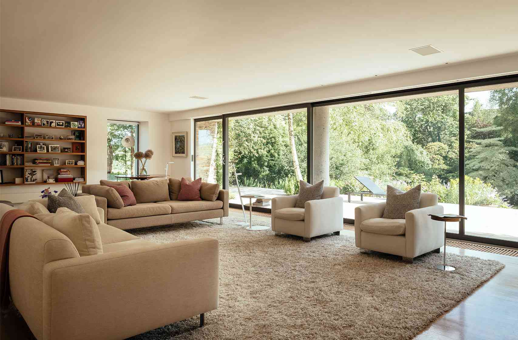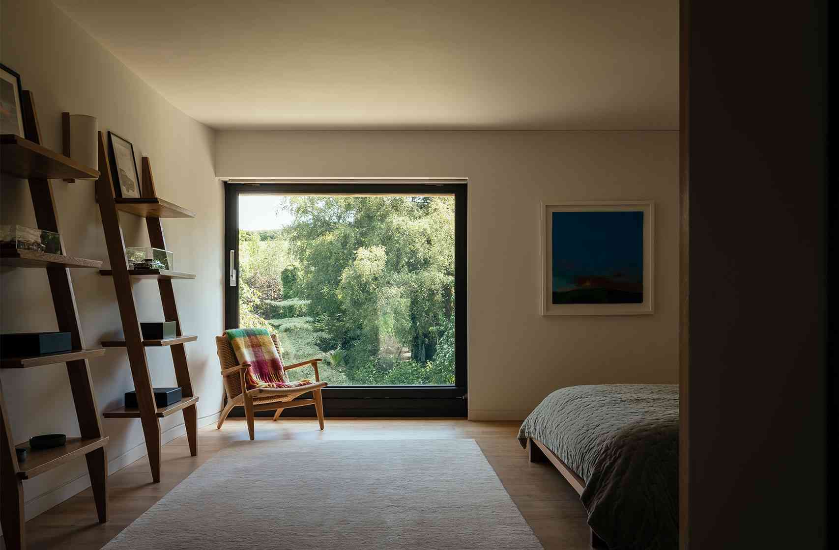 Wnętrze Devon Valley House zachwyca przestronnością i funkcjonalnym układem. Parter stanowi niemal w całości otwartą przestrzeń, w której strefa dzienna płynnie łączy się z jadalnią i kuchnią. Jedynym wyraźnym elementem dzielącym pomieszczenia jest ściana z wbudowanym kominkiem, która tworzy centralny punkt domu. Jasne, naturalne materiały, przeszklone elewacje i prostota formy sprawiają, że wnętrze jest przejrzyste, pełne światła i kontaktu z naturą.