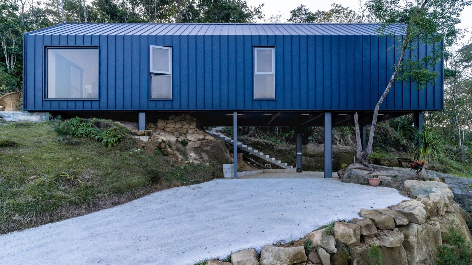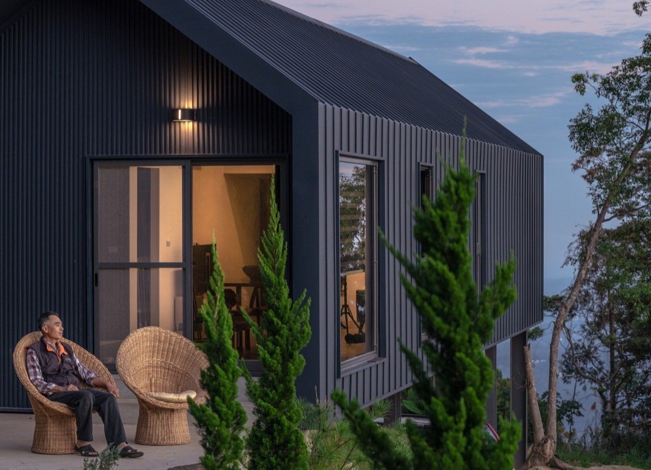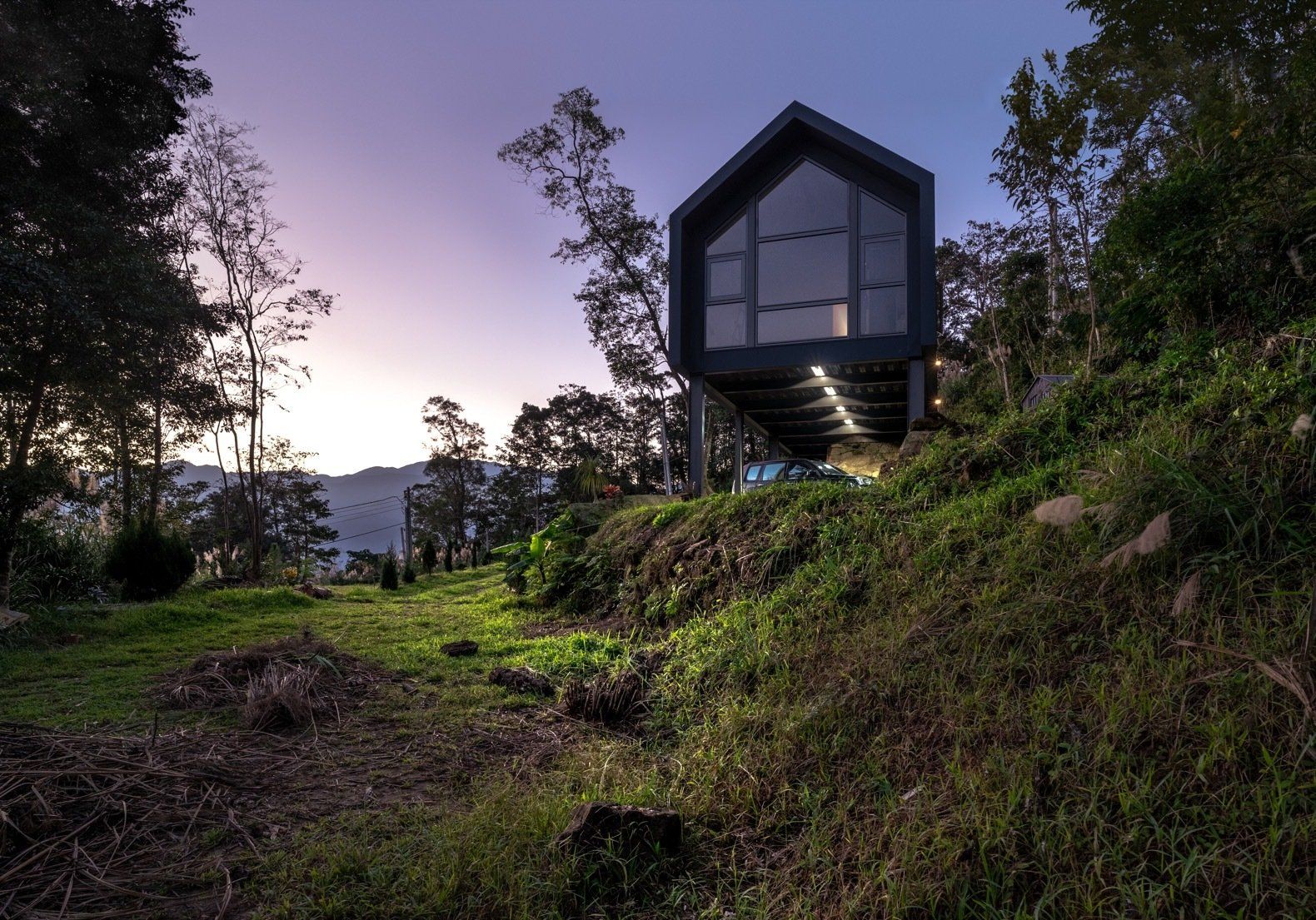 Dom usytuowano na szczycie góry pomiędzy dwiema dolinami, co zapewnia spektakularne widoki na ocean, góry i okoliczne doliny, a jednocześnie pełną prywatność. Ze względu na stromy teren, brak dostępu dla ciężkiego sprzętu, zagrożenie trzęsieniami ziemi i tajfunami oraz ograniczone możliwości lokalnych wykonawców, architekt zdecydował się na prefabrykowaną, metalową konstrukcję uniesioną na palach. Minimalna ilość materiałów wykończeniowych, symetryczna forma i prosta geometria pozwoliły skrócić czas realizacji do pięciu miesięcy. Efektem jest jasny, odporny na ekstremalne warunki dom w górach, który harmonijnie wpisuje się w krajobraz i pozwala mieszkańcom w pełni cieszyć się ciszą, światłem i otaczającą przyrodą — podobnie jak w idei nowoczesna stodoła dostosowanej do azjatyckiego klimatu.