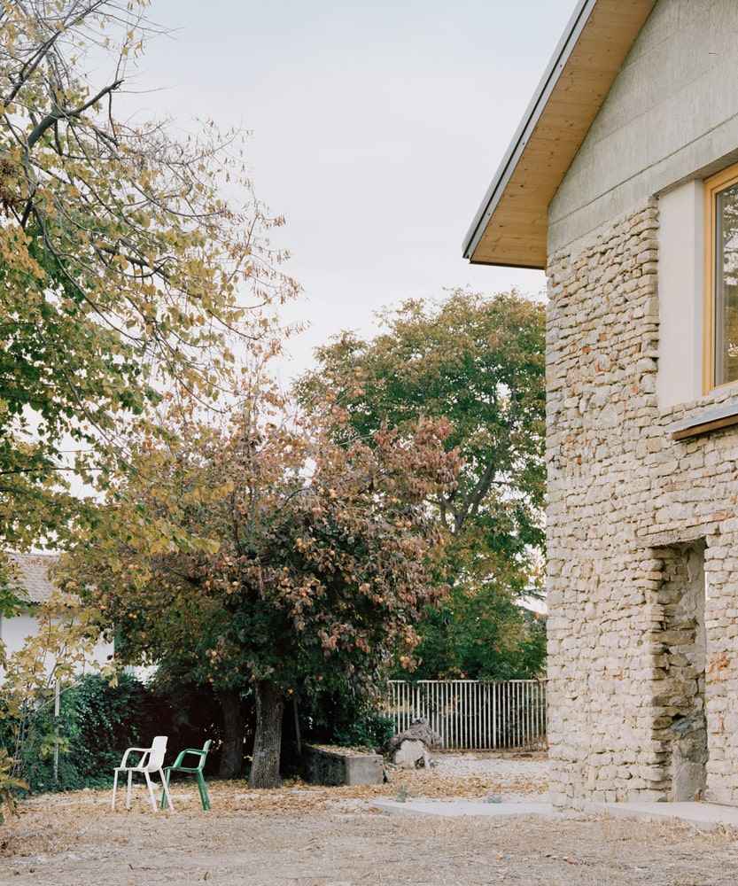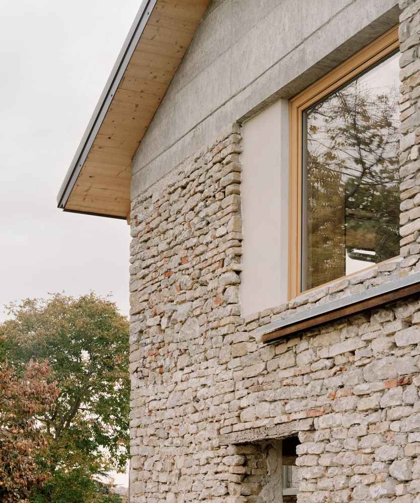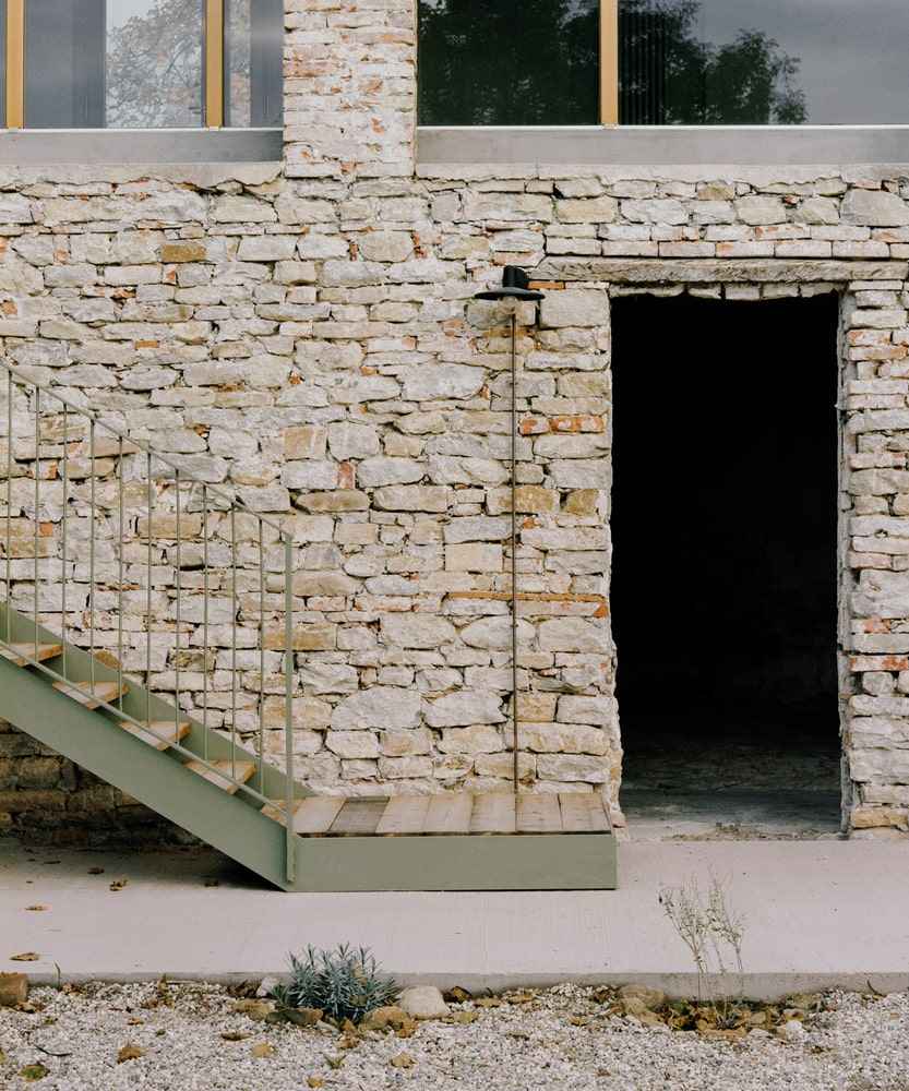 Historyczna zabudowa składa się z dwóch części: starszej bryły ze stajnią i magazynami oraz nowszej – uformowanej w kształt litery L – zorientowanej na dziedziniec. Stodoła, która stanowiła centralny element obiektu, została zachowana jako otwarta przestrzeń i pełni teraz funkcję salonu, kuchni i jadalni. Dzięki monumentalnemu, 15-metrowemu przeszkleniu, wnętrze domu przenika się z otaczającym krajobrazem. Odsłonięte ceglane filary, betonowe wykończenia oraz balkon z zewnętrzną klatką schodową tworzą nowoczesną interpretację klasycznej architektury wiejskiej. Projekt idealnie wpisuje się w ideę nowoczesnej stodoły, łącząc autentyczne detale z funkcjonalnością XXI wieku.