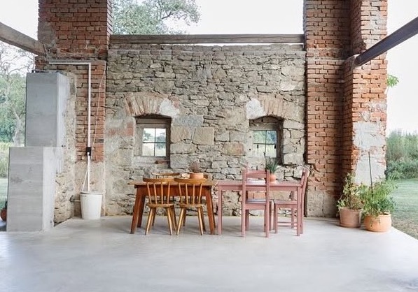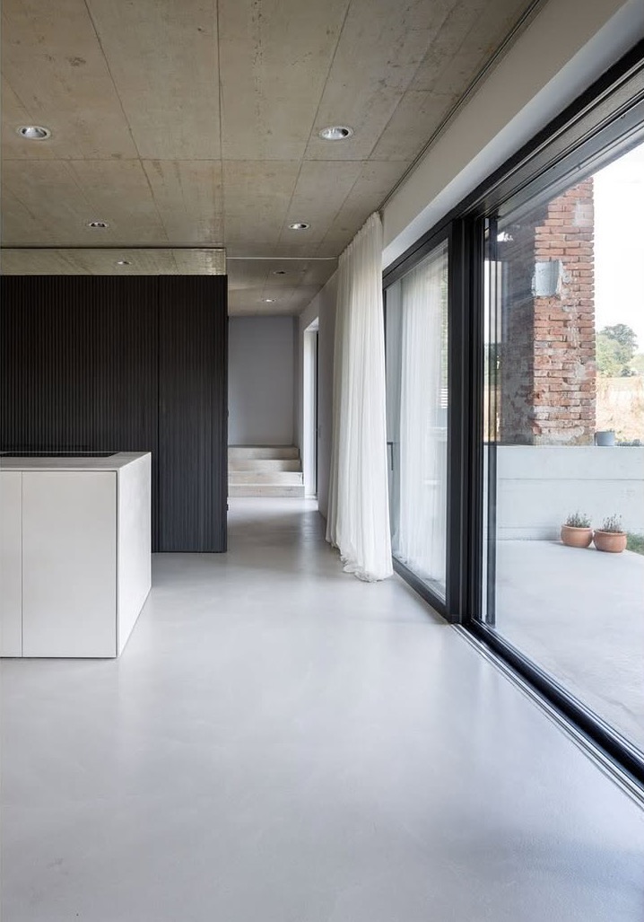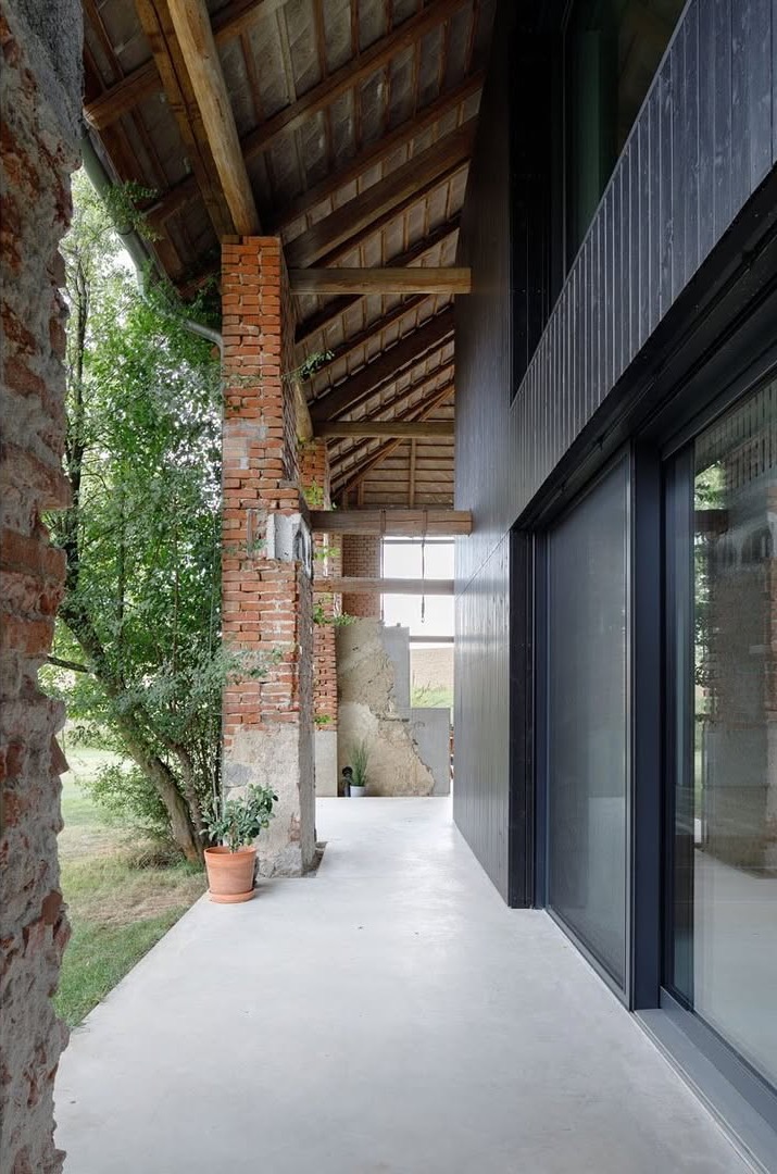 Nowoczesna struktura wewnętrzna została zaprojektowana z otwartym planem, organizując przestrzeń wokół centralnego bloku infrastrukturalnego zawierającego wszystkie niezbędne instalacje techniczne. Elewacja nowego budynku została zaprojektowana w sposób minimalistyczny, aby kontrastować z solidnymi cegłami filarów. Zadaszone przestrzenie zewnętrzne dodatkowo powiększają obszar mieszkalny, sprzyjając harmonijnej integracji wnętrza z otoczeniem.