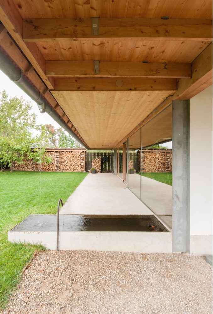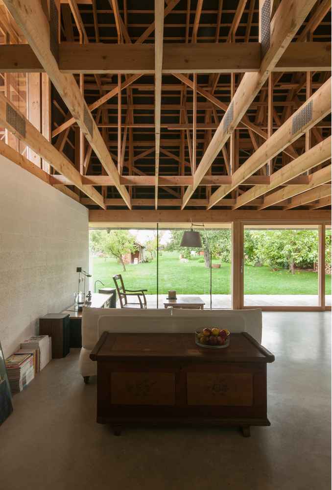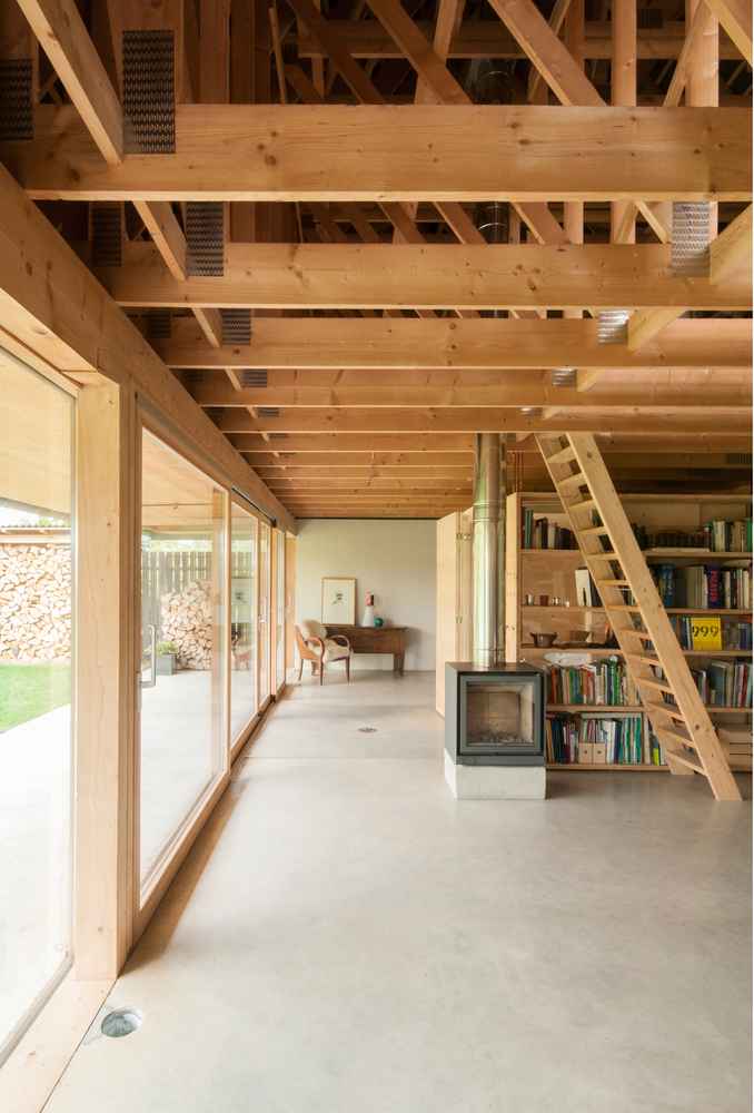 Najbardziej charakterystycznym elementem bryły jest duży, dwuspadowy dach wykończony dachówką, który z zewnątrz sprawia wrażenie klasycznego domu wiejskiego. Pod tą tradycyjną formą kryje się jednak nowoczesne wnętrze o otwartym układzie funkcjonalnym. Parter zaprojektowano jako jedną, swobodną przestrzeń dzienną, całkowicie otwartą na ogród zlokalizowany od strony południowej. Ekspozycja konstrukcji poddasza i dachu nadaje wnętrzu charakteru, podkreślając wysokość i lekkość przestrzeni.