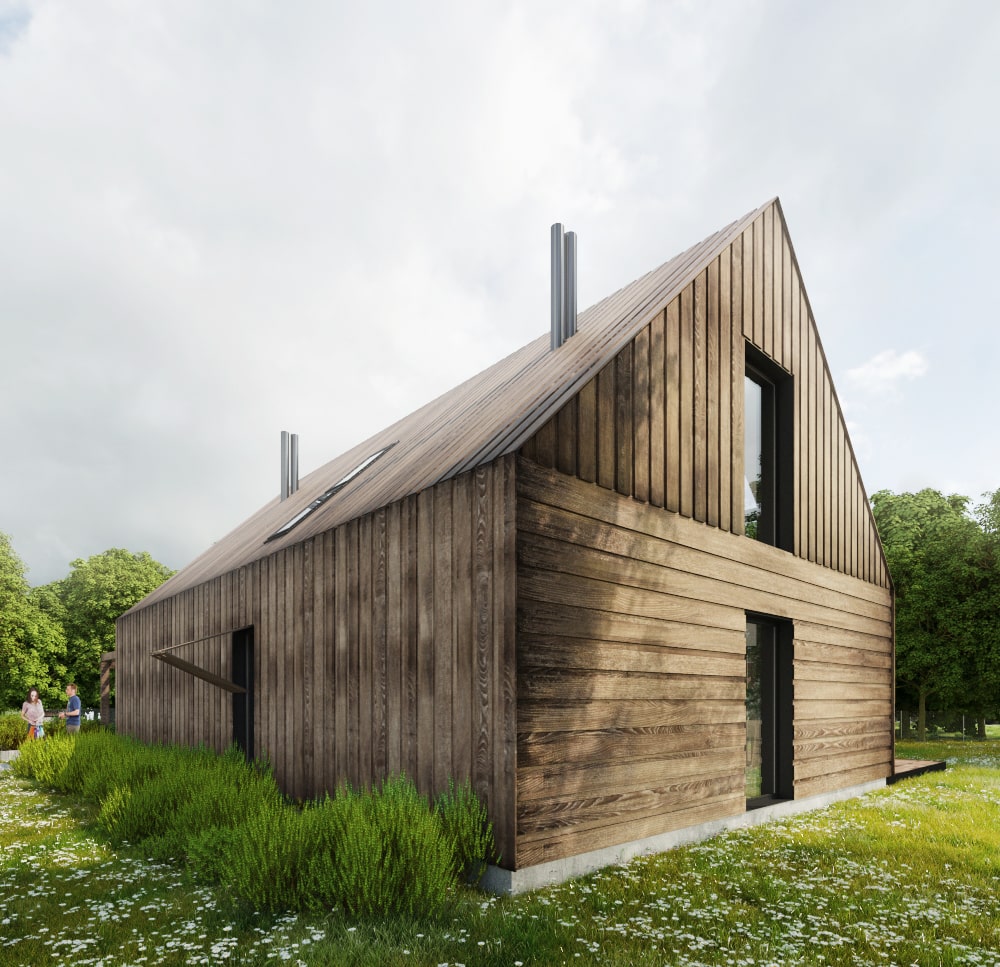 Projekt nowoczesnego domu jednorodzinnego DKP_15, w krajobrazie kujawsko-pomorskim, zaprojektowano jako współczesny dom charakteryzujący się nowoczesną formą której proporcje i detal czerpią z najlepszych historycznych wzorców. Poszanowanie tradycji, prostota oraz alternatywne źródła energii stały się bazą na której powstał spójny nowoczesny projekt. Zaproponowano rozbicie programu użytkowego na dwie bryły – część mieszkalną oraz obsługującą, obie z nich ustawione swoimi kalenicami równolegle do drogi co wpisuje się w schemat lokalnej urbanistyki. Część obsługującą cofnięto w głąb działki, tworząc funkcjonalne przedpole – rozwiązanie to w klarowny sposób strefuje działkę na część techniczną oraz rekreacyjną. Obie bryły połączono wspólnym, osiowym traktem, z którego to dostępne są wejścia do domu oraz do pomieszczeń technicznych w budynku obsługującym. Przeniesienie wejścia na ścianę szczytową, tak aby otwierało się na techniczne przedpole ułatwia komunikacje dom-garaż i idzie w zgodzie z łatwo zauważalną tendencją przenoszenia głównych wejść ze ściany frontowej w głąb działki.