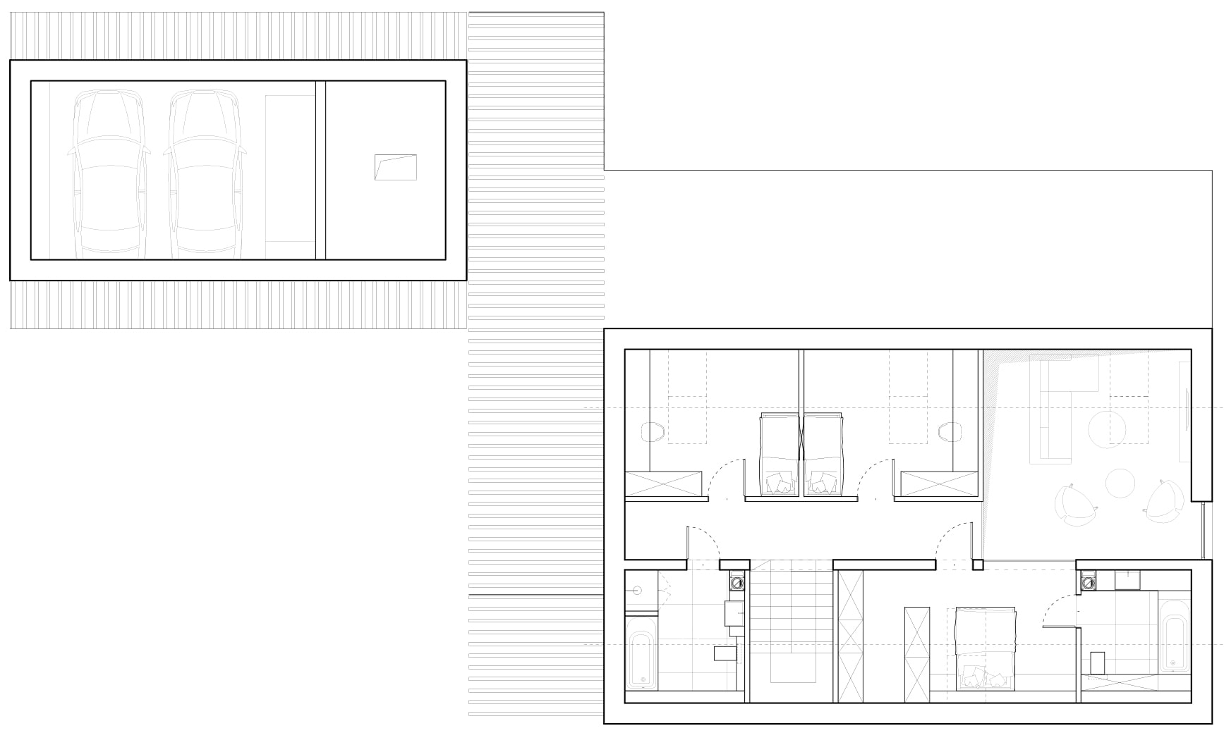 Na piętrze części mieszkalnej od północnej strony umiejscowiono sypialnię główną rodziców wraz z garderobą i łazienką. Południową stronę zagospodarowano dwoma pokojami z dużymi wertykalnymi oknami otwierającymi się na ogród oraz antresolą, która podkreśla rangę salonu znajdującego się piętro niżej.