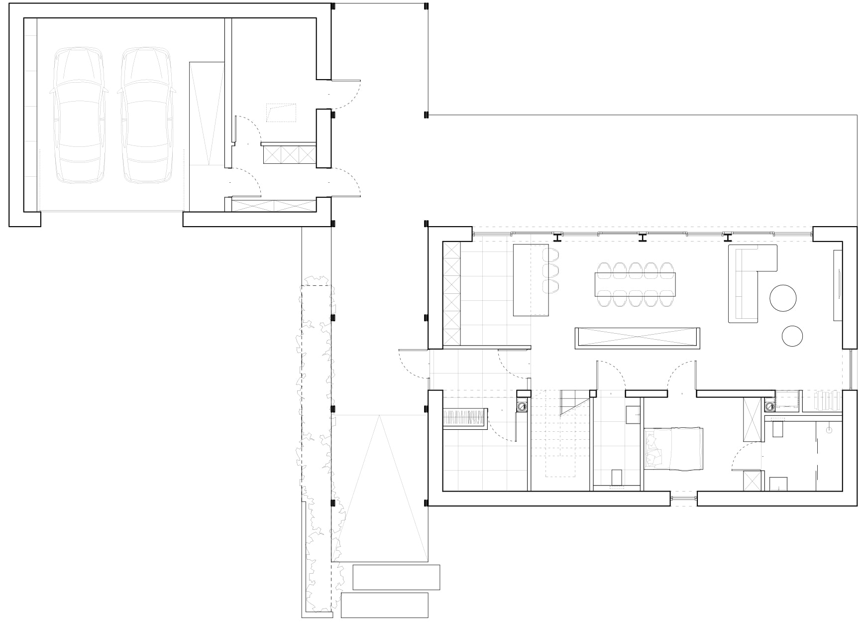 Wewnętrzny układ funkcjonalny został zaprojektowano jako dwutraktowy, a rozkład pomieszczeń poddany strefowaniu. Parter części mieszkalnej to typowa strefa dzienna wraz z pomieszczeniami technicznymi oraz pokój gościnny. Zlokalizowane od północy kotłowania, klatka schodowa, łazienki i pokój stanowią bufor termiczny dla pomieszczeń znajdujących się od strony południowej. Kuchnia, jadalnia oraz salon zaprojektowano jako jeden trakt otwarty na południowy taras i ogród poprzez panoramiczne przeszklenie z drzwiami przesuwnymi. W budynku obsługującym zaproponowano garaż na dwa zwykłe stanowiska, a od strony traktu dwa pomieszczenia techniczne.