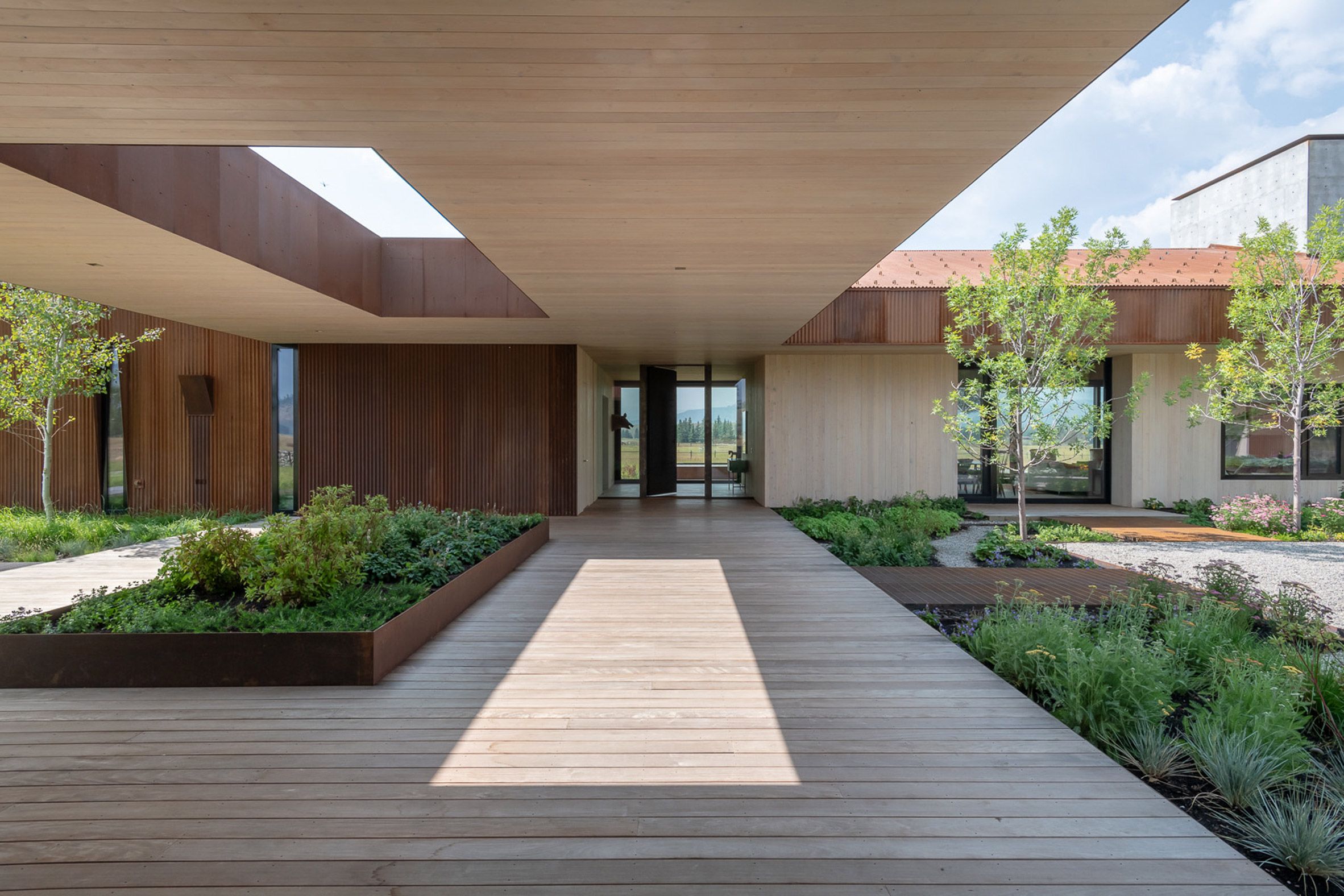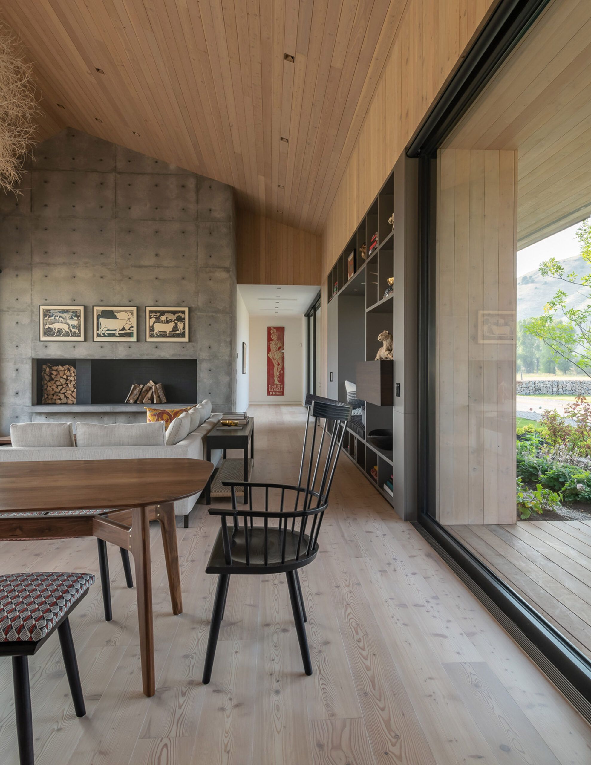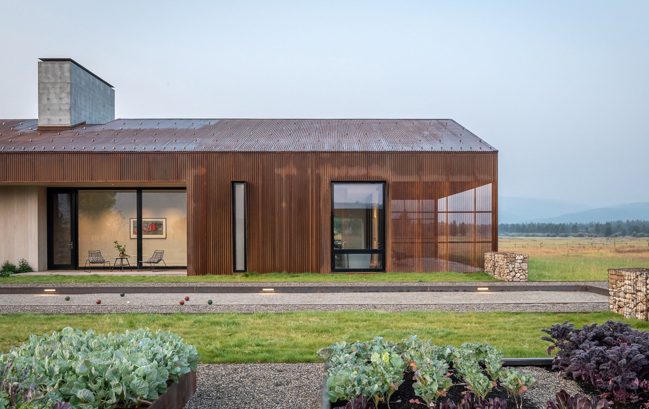 Elewację wykończono stalą oksydowaną, która naturalnie stapia się z otoczeniem, a duże przeszklenia otwierają wnętrza na widoki łąk i gór, w tym odległy szczyt Glory. Dom o powierzchni 325 m² został zaplanowany na osi wschód–zachód i podzielony na trzy funkcjonalne strefy: centralną z otwartą kuchnią, jadalnią i salonem z masywnym, betonowym kominkiem oraz dwie prywatne części po przeciwnych stronach budynku. Zadaszone patia na obu końcach bryły umożliwiają korzystanie z przestrzeni zewnętrznych przez cały rok. Wnętrza łączą surowość betonu i stali z ciepłem modrzewiowego drewna oraz stonowaną paletą barw, tworząc spokojny, nowoczesny dom w duchu nowoczesna stodoła, idealnie wpisany w naturalne otoczenie Jackson Hole.