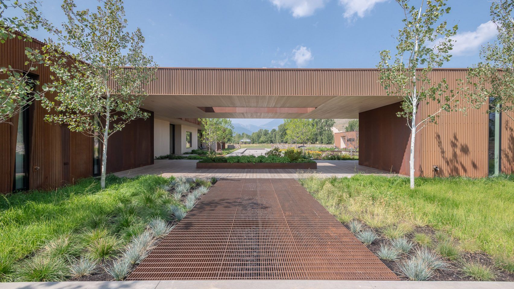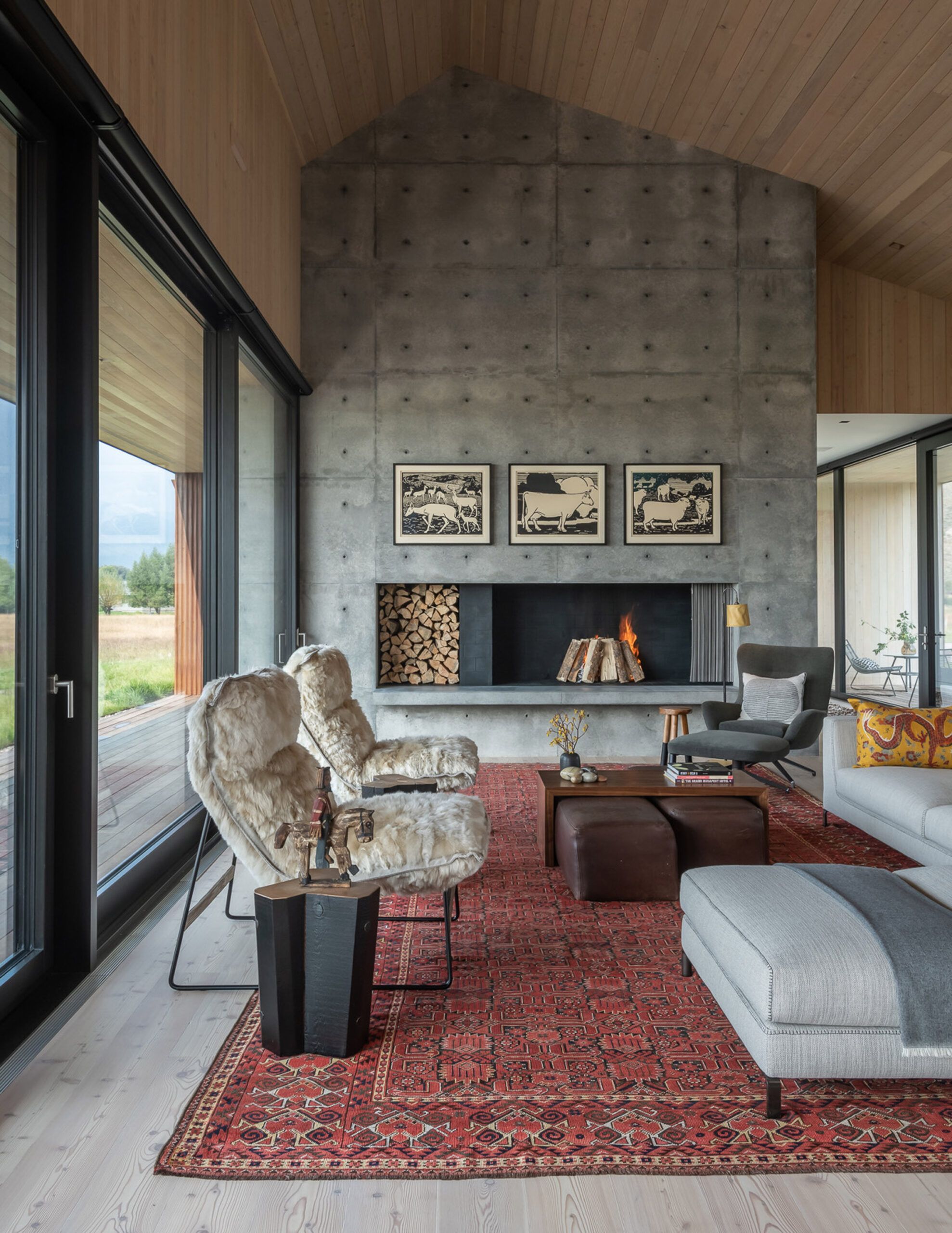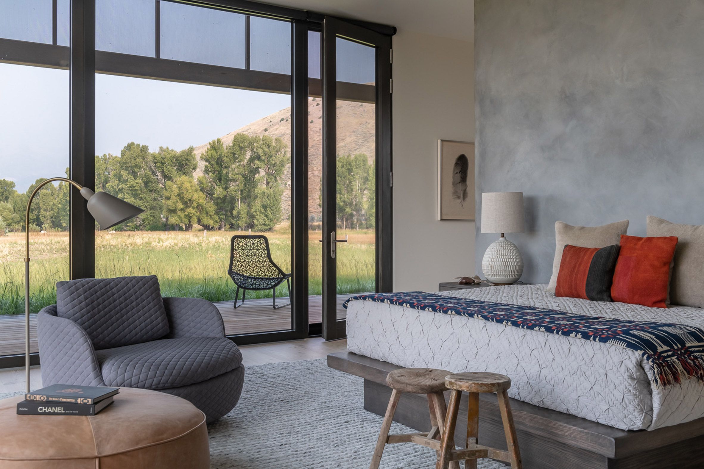 Elewację wykończono stalą oksydowaną, która naturalnie stapia się z otoczeniem, a duże przeszklenia otwierają wnętrza na widoki łąk i gór, w tym odległy szczyt Glory. Dom o powierzchni 325 m² został zaplanowany na osi wschód–zachód i podzielony na trzy funkcjonalne strefy: centralną z otwartą kuchnią, jadalnią i salonem z masywnym, betonowym kominkiem oraz dwie prywatne części po przeciwnych stronach budynku. Zadaszone patia na obu końcach bryły umożliwiają korzystanie z przestrzeni zewnętrznych przez cały rok. Wnętrza łączą surowość betonu i stali z ciepłem modrzewiowego drewna oraz stonowaną paletą barw, tworząc spokojny, nowoczesny dom w duchu nowoczesna stodoła, idealnie wpisany w naturalne otoczenie Jackson Hole.
