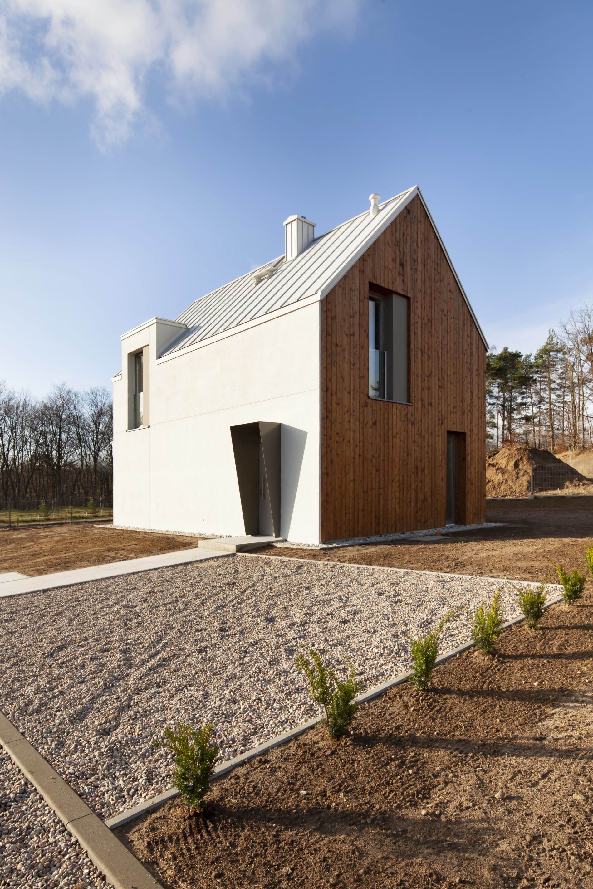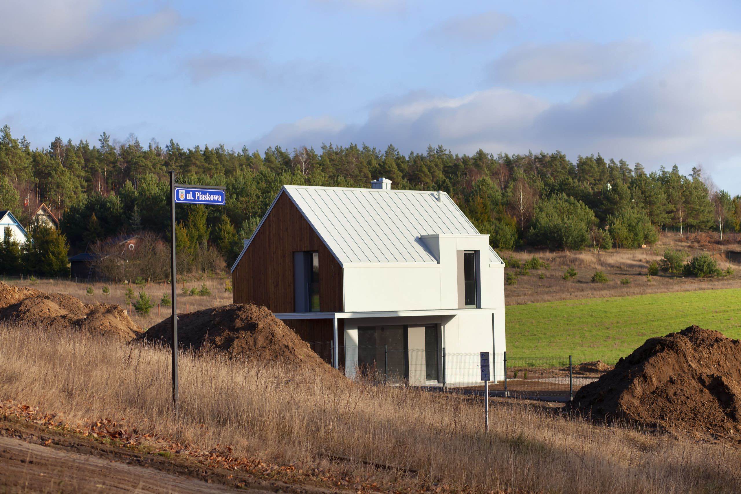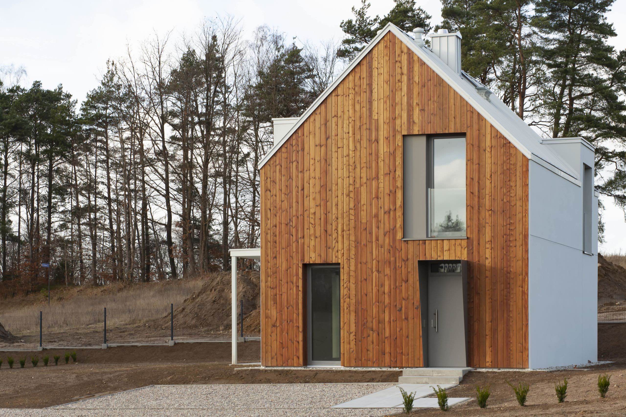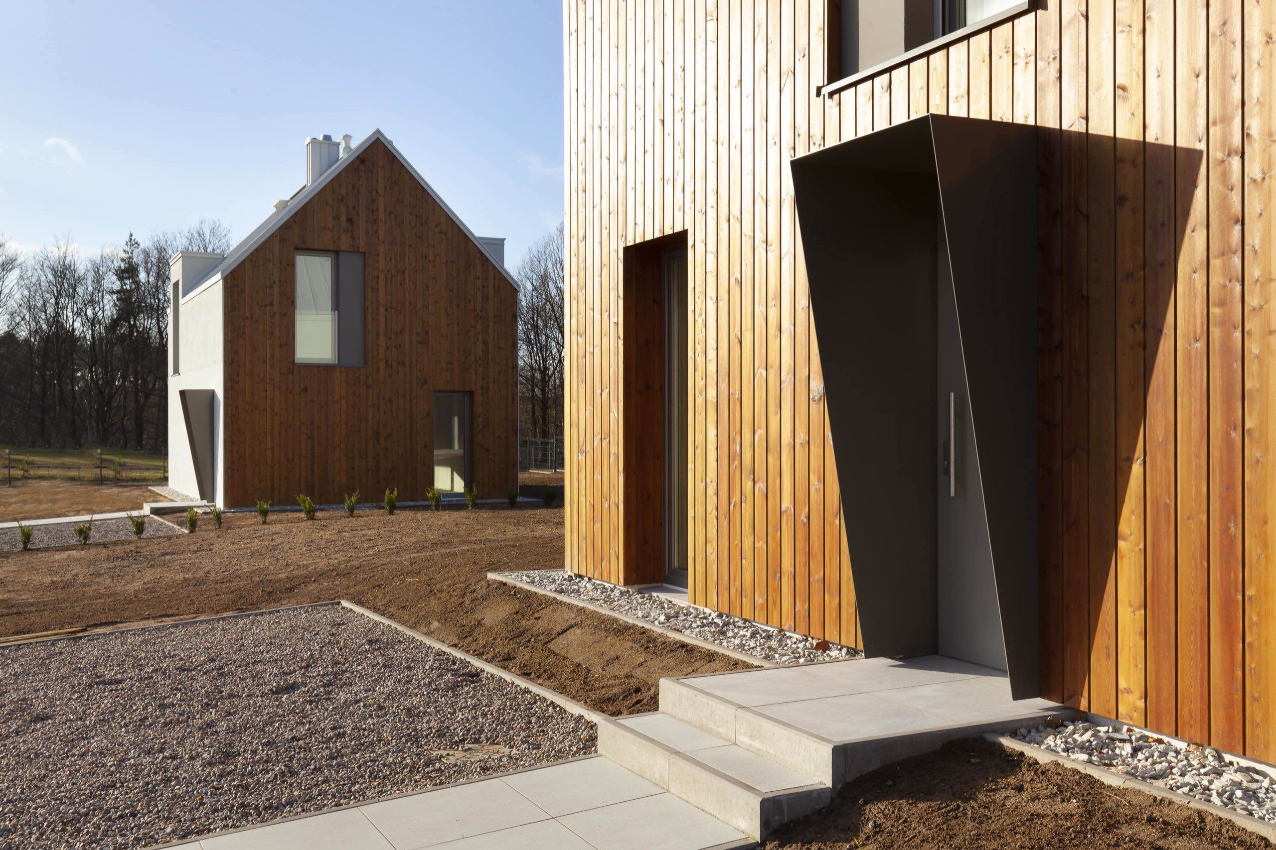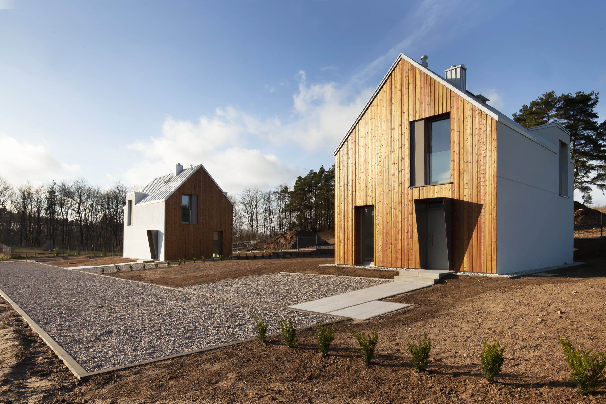 Zespół domów zaprojektowano w niewielkiej skali, co pozwoliło stworzyć przyjemną, półprywatną przestrzeń sprzyjającą relacjom sąsiedzkim. Formy budynków czerpią z archetypu nowoczesnej stodoły, utrzymane są w spójnej, jasnoszarej kolorystyce, a ich szczyty wykończono drewnianymi deskami. Połączenie tych elementów nadaje założeniu niepowtarzalny, współczesny charakter, który harmonijnie wpisuje się w otaczający krajobraz.