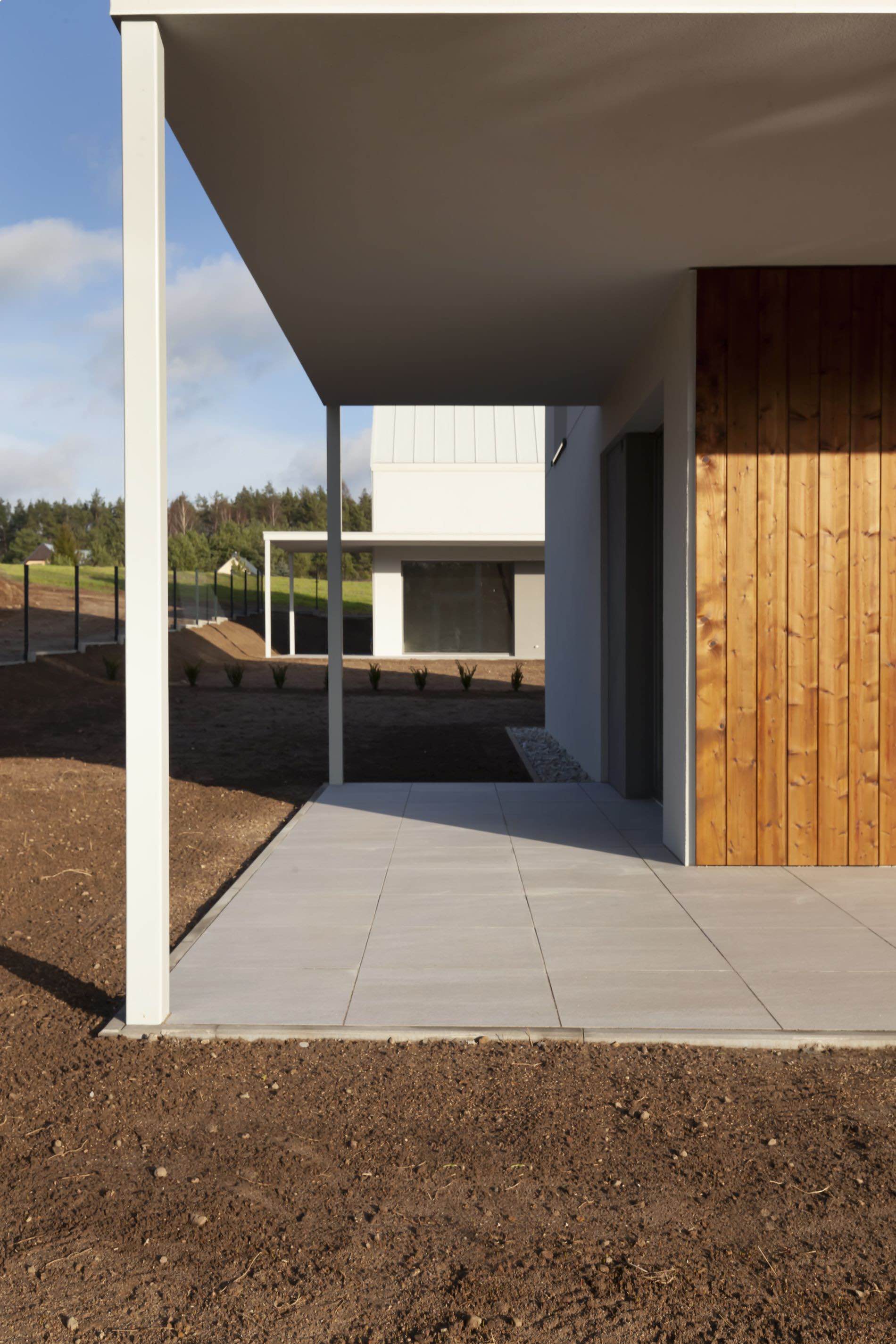 W projekcie zadbano również o komfort i prywatność mieszkańców. Każdy dom wyposażono w zadaszony taras, którego forma stanowi integralną część architektury, a jednocześnie tworzy idealne miejsce do odpoczynku niezależnie od pogody. Zadaszenia podkreślają linię brył i wydłużają ich geometrię, tworząc przytulne strefy, które płynnie łączą wnętrza z otoczeniem na zewnątrz.