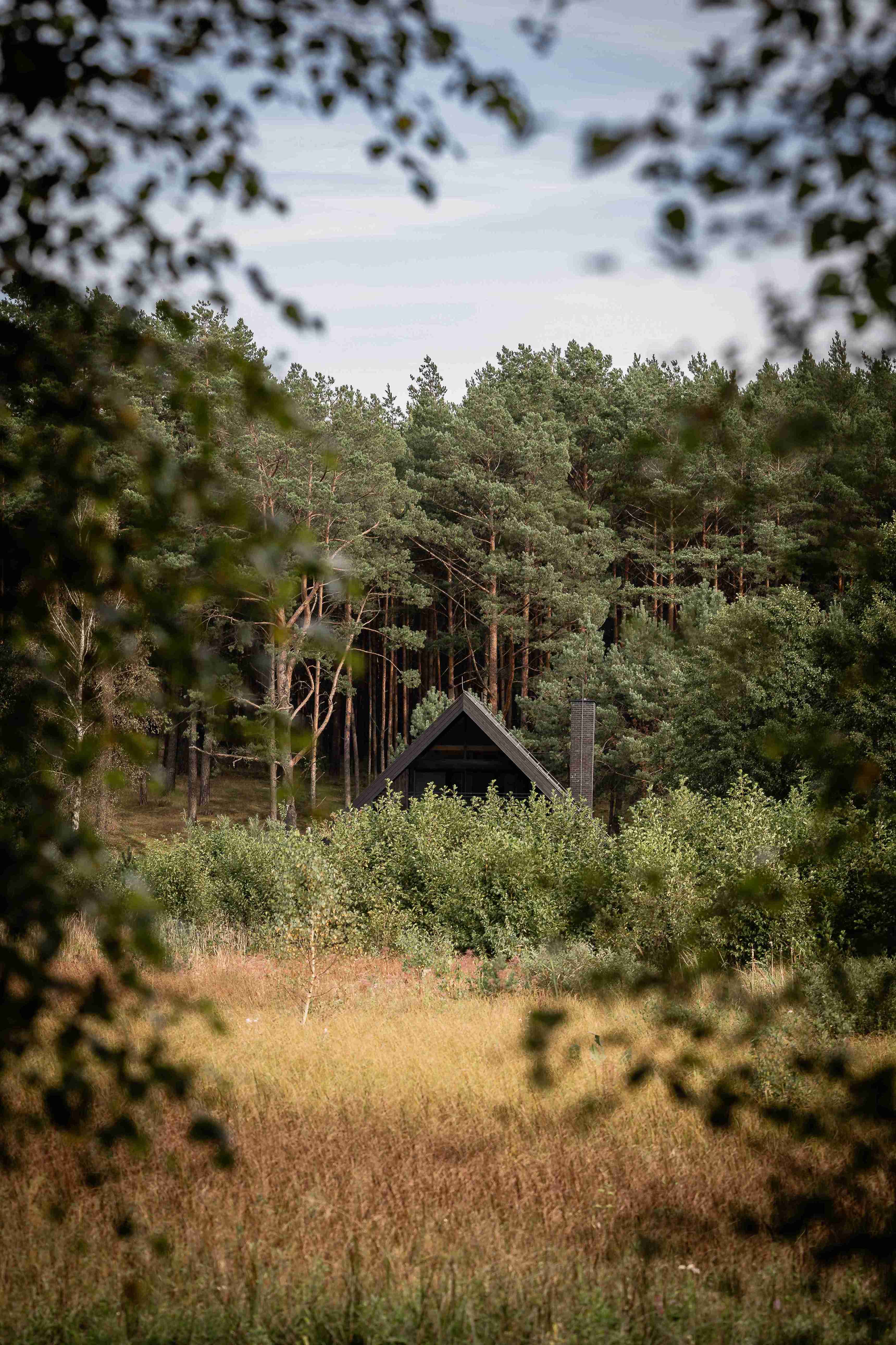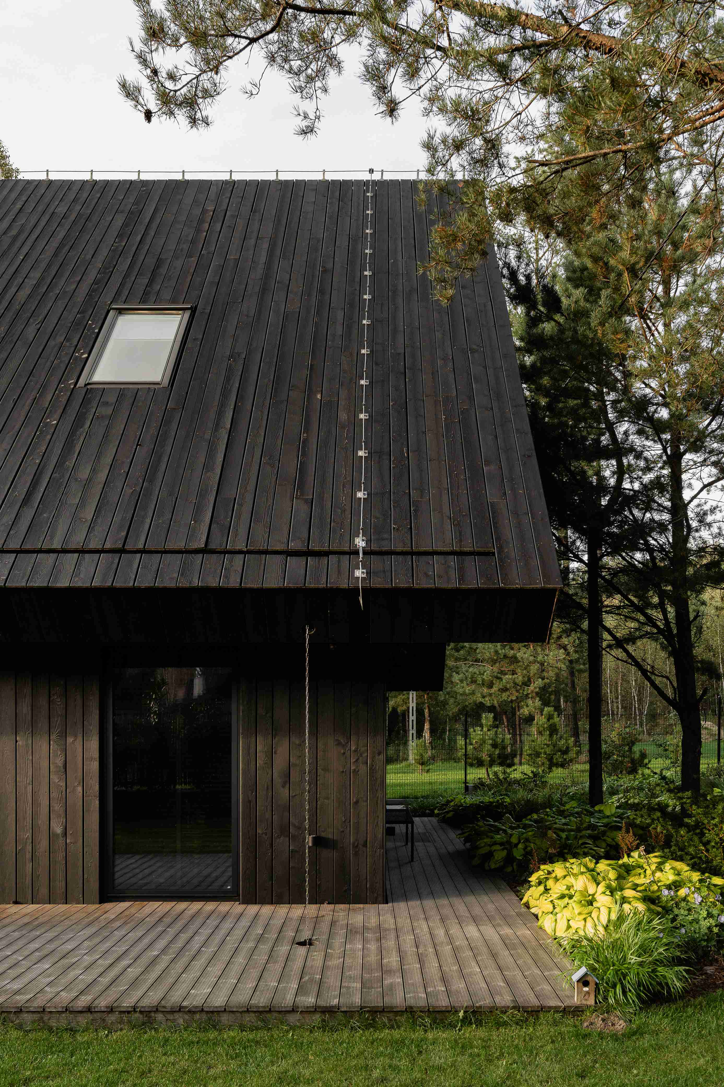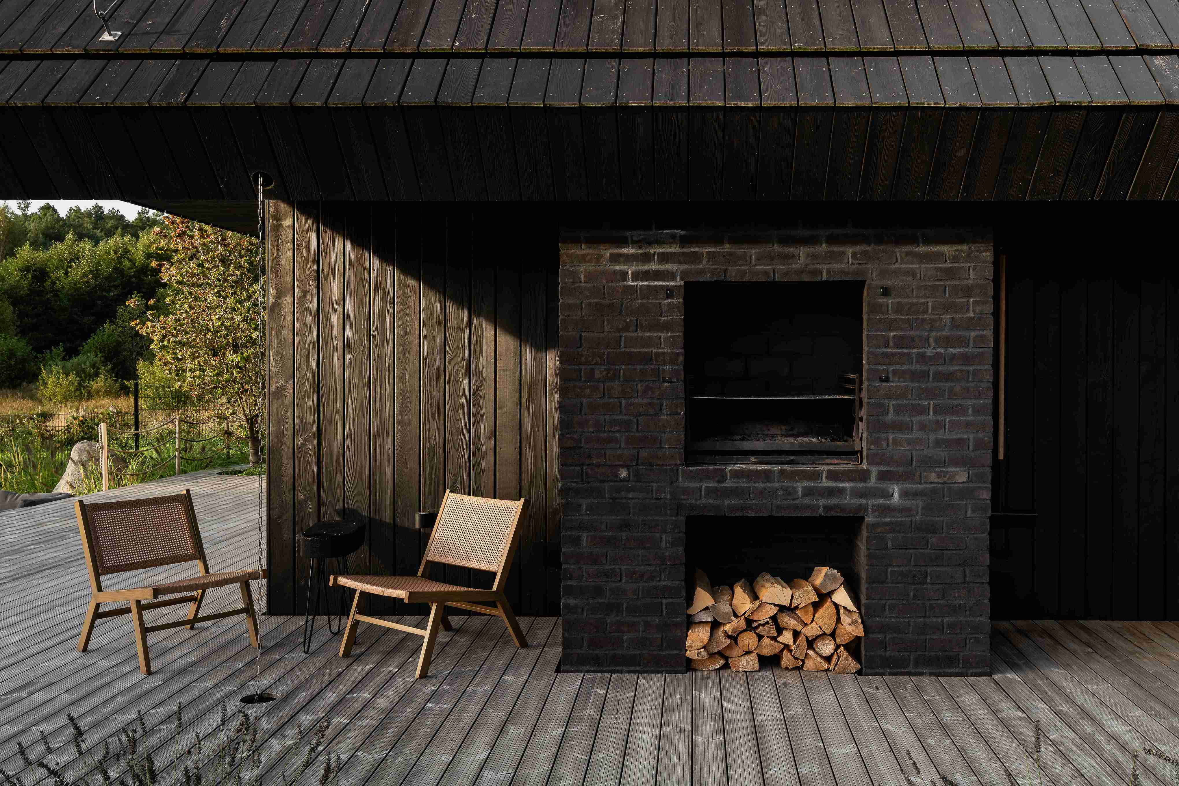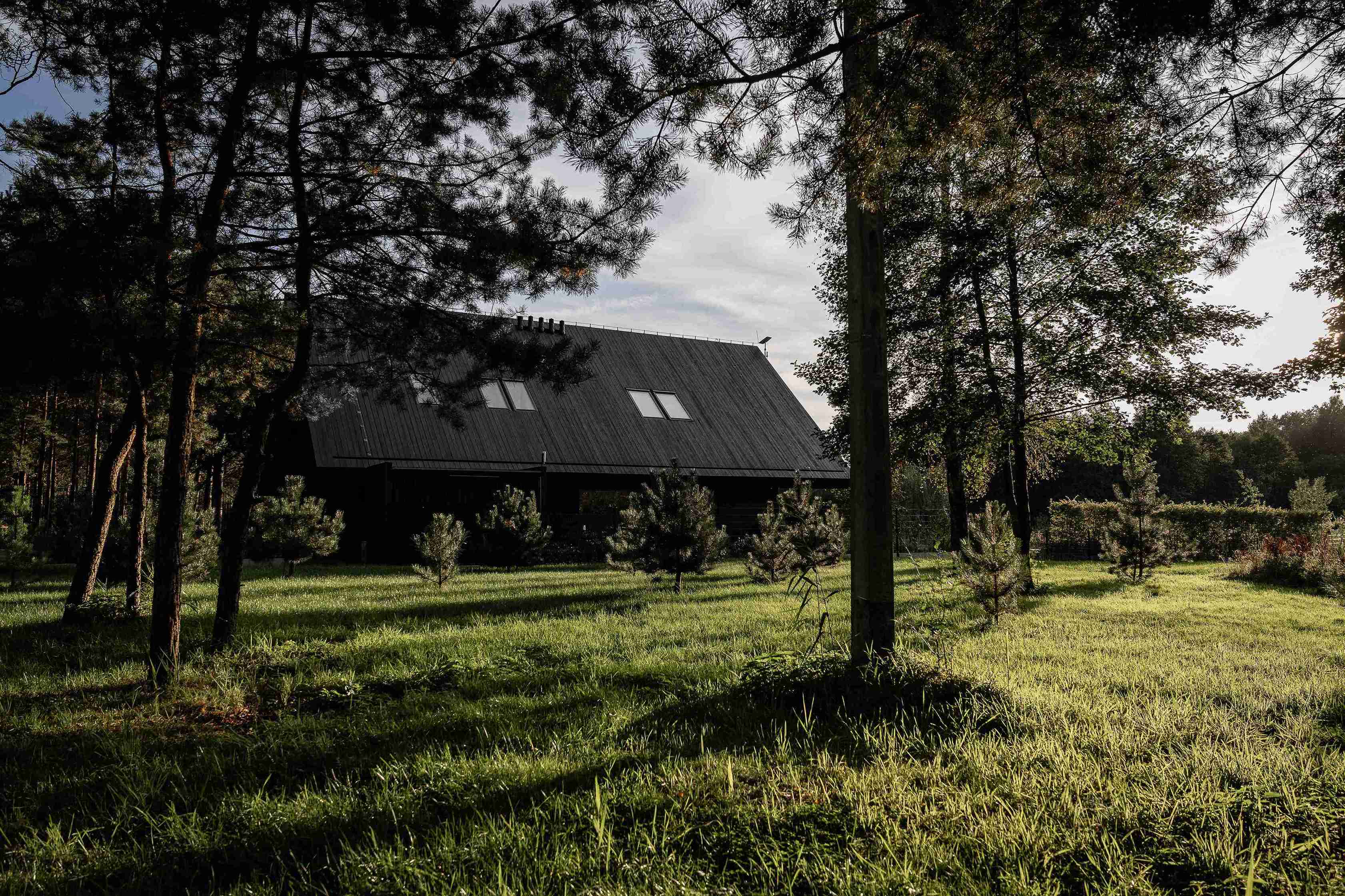 Dom na skraju kociewskiej polany leśnej, cały z opalanego drewna, z masywnym dachem o mocno wysuniętych okapach.