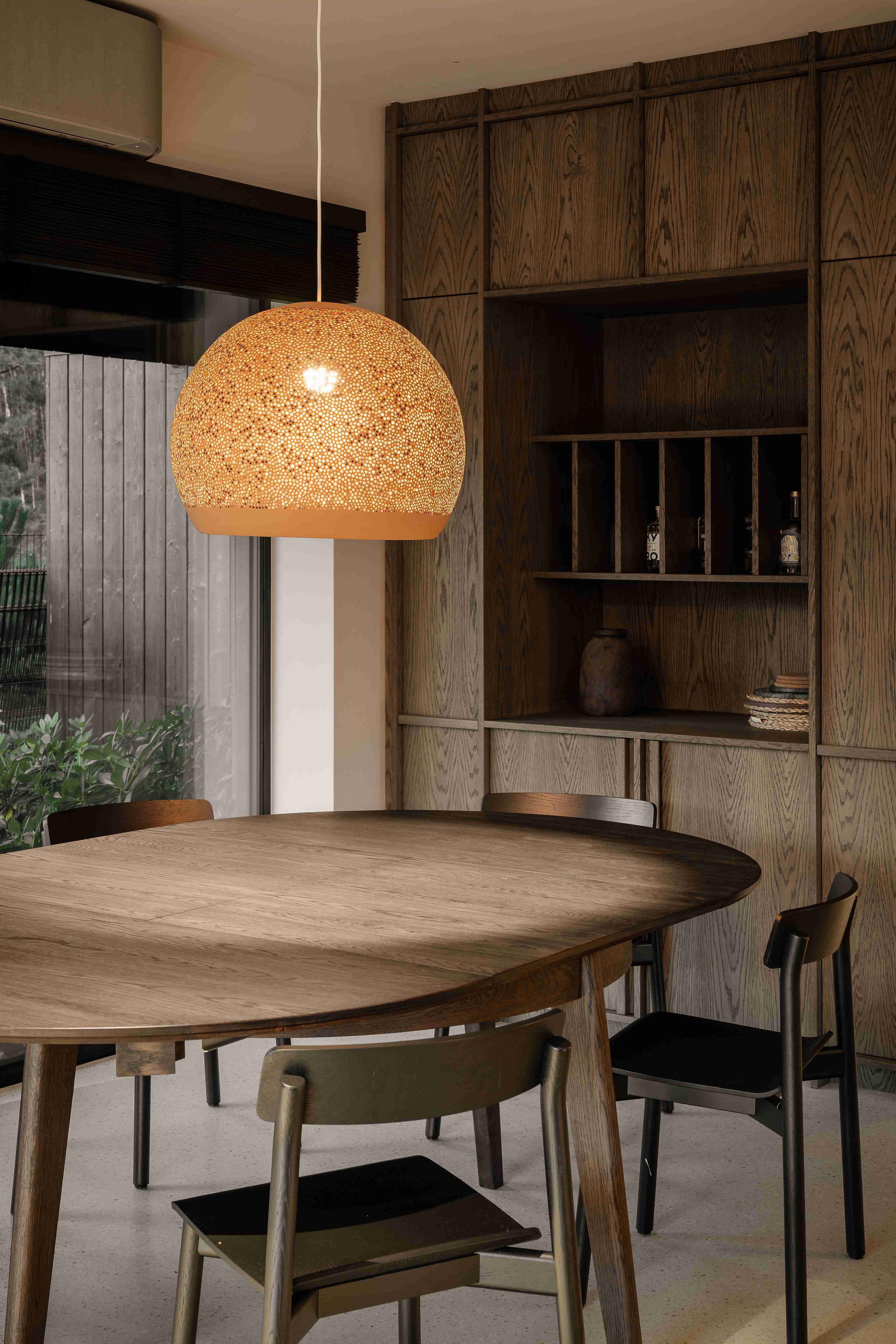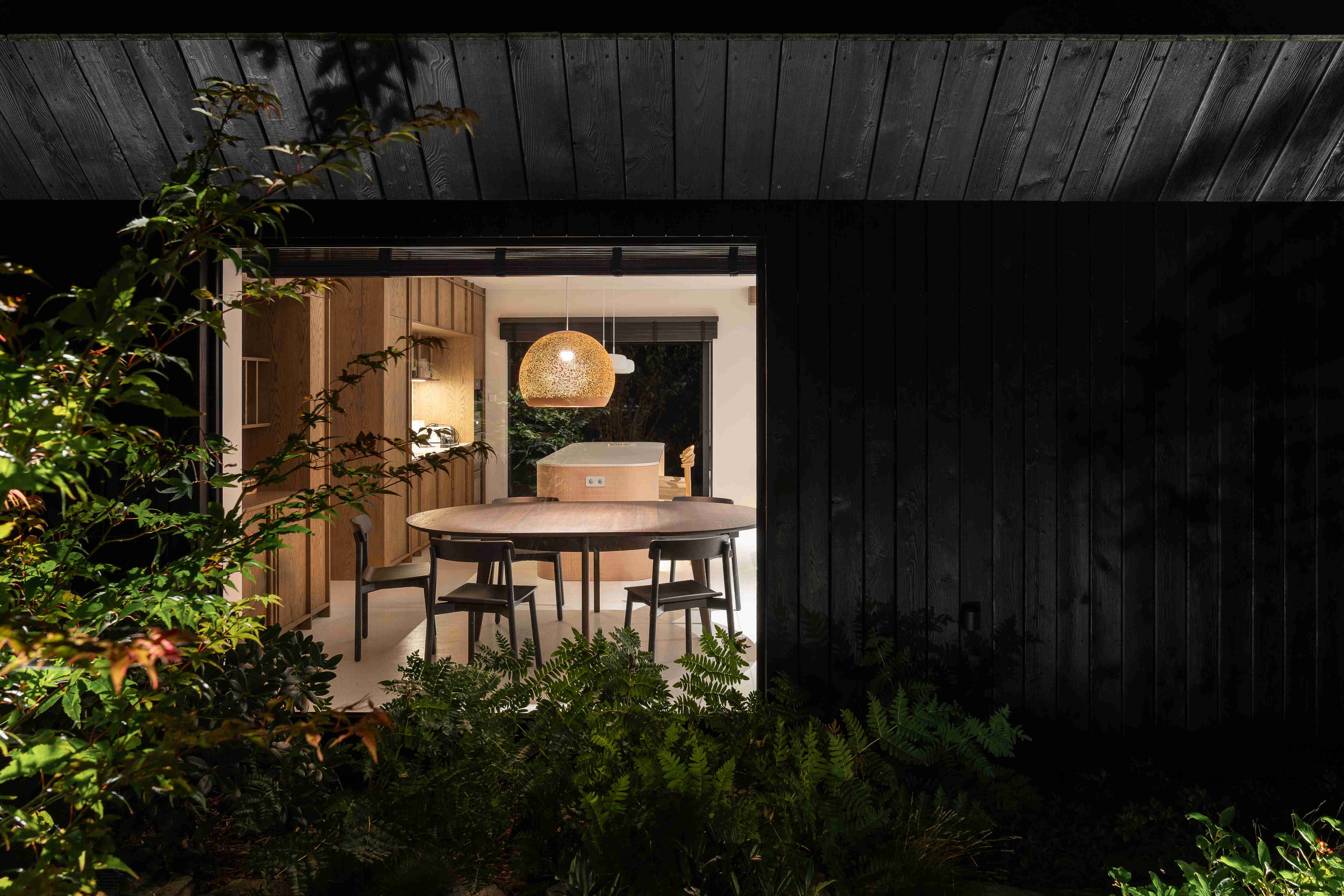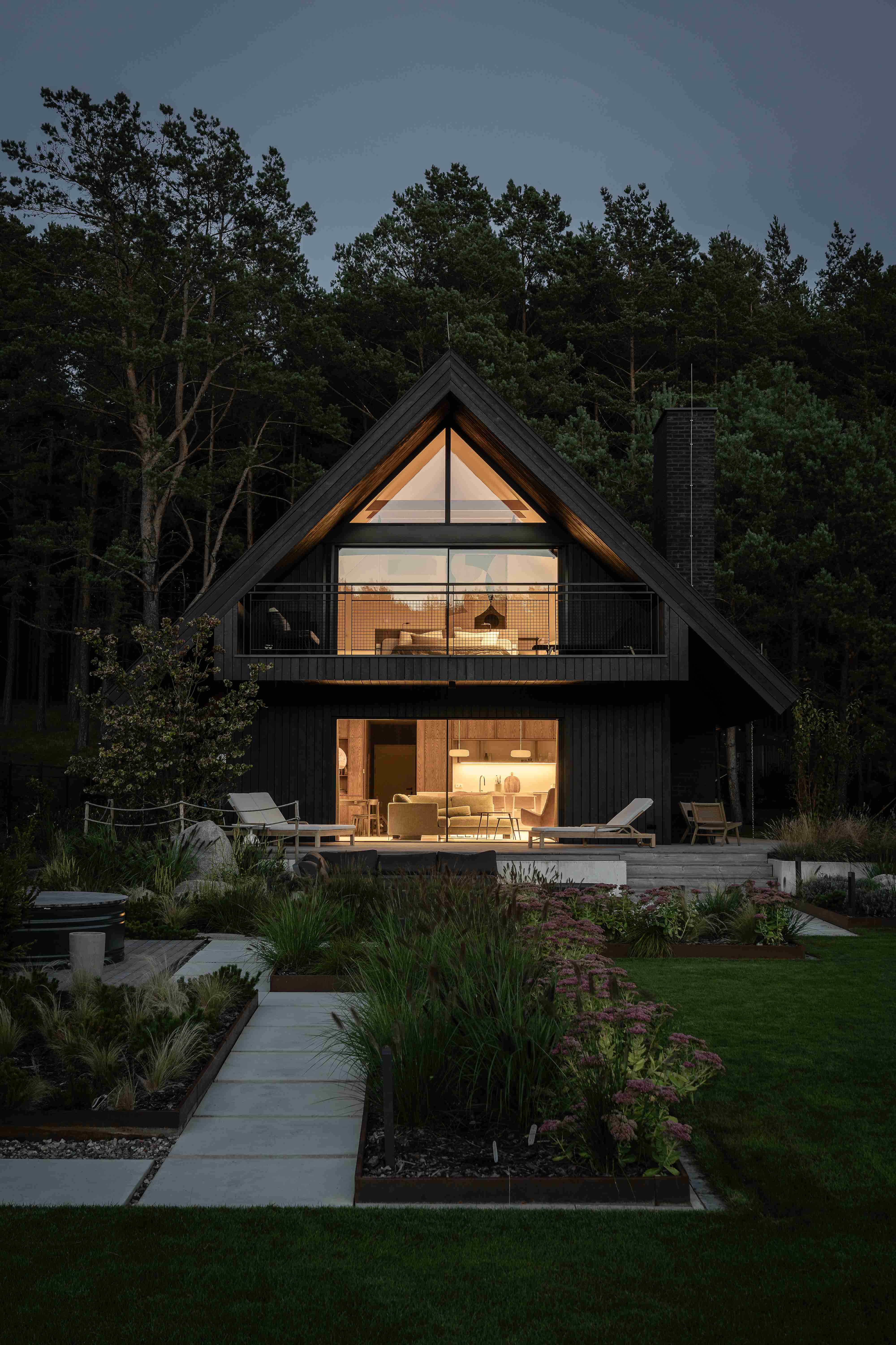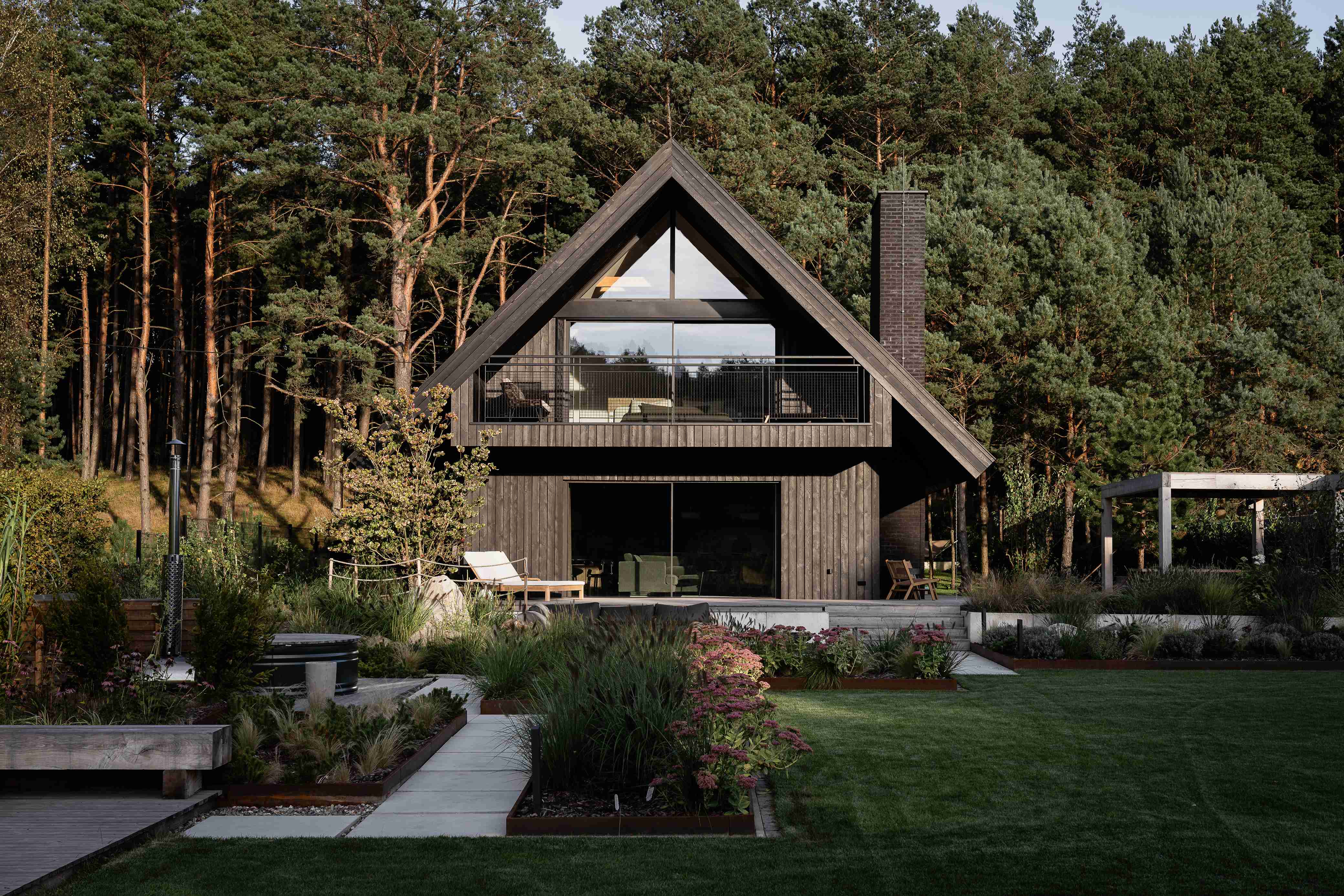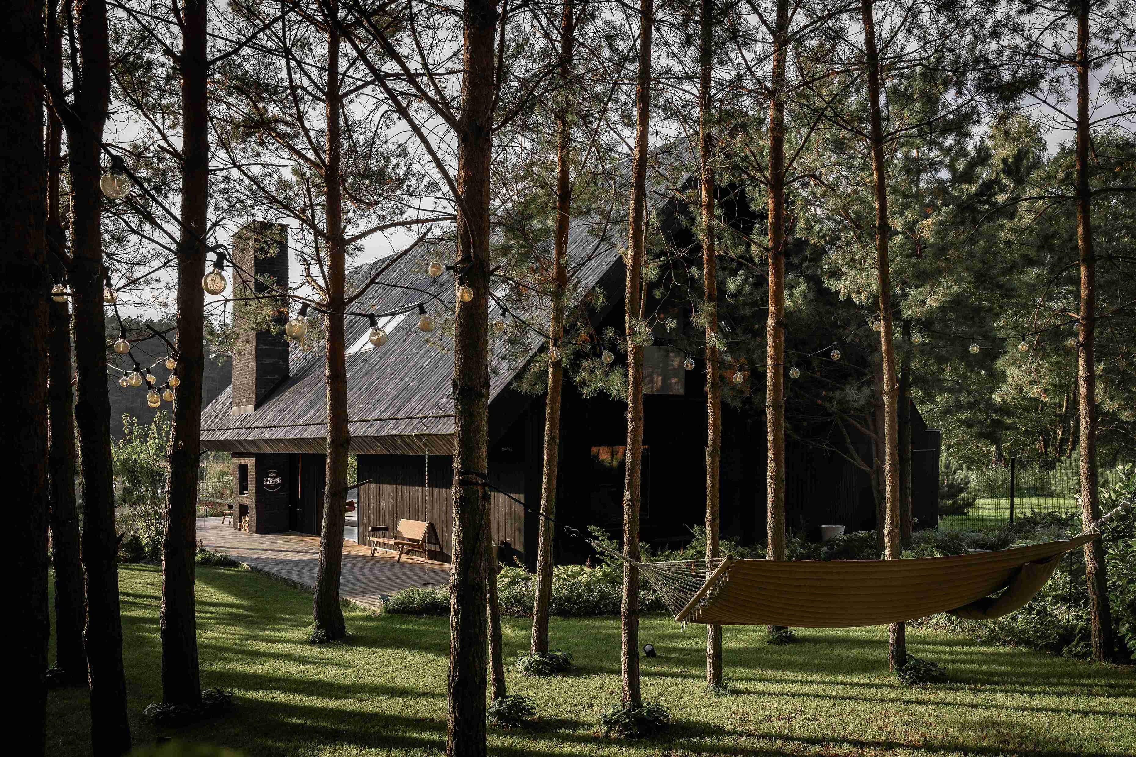Dom na skraju kociewskiej polany leśnej, cały z opalanego drewna, z masywnym dachem o mocno wysuniętych okapach.