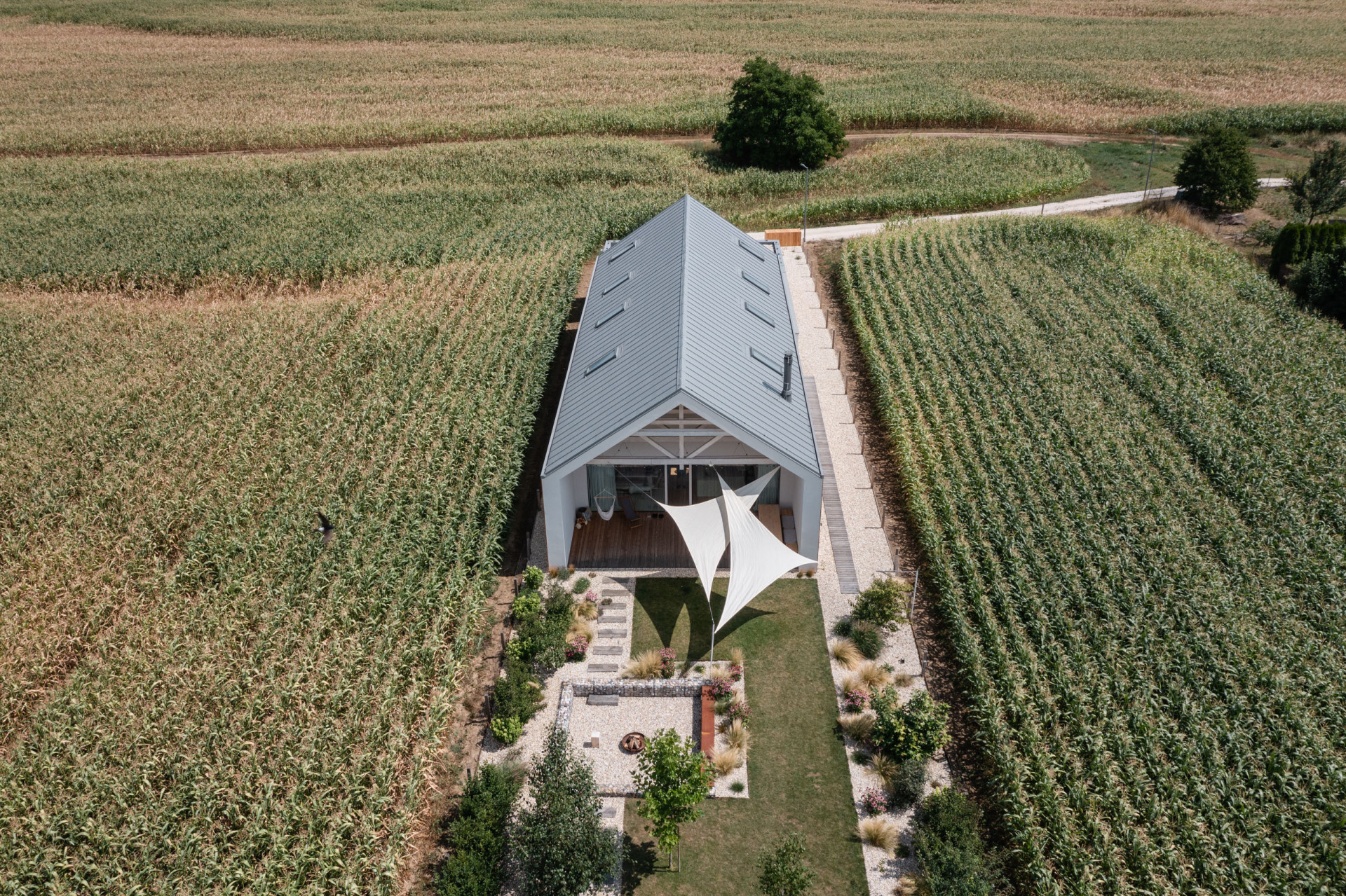 Dom usytuowano na skraju wsi, przy końcu ślepej ulicy, gdzie zabudowa stopniowo przechodzi w otwartą przestrzeń pól i łąk. W odpowiedzi na ten kontekst architekci sięgnęli po archetypalną formę domu jednorodzinnego – prostą bryłę na planie prostokąta, zwieńczoną dwuspadowym dachem.