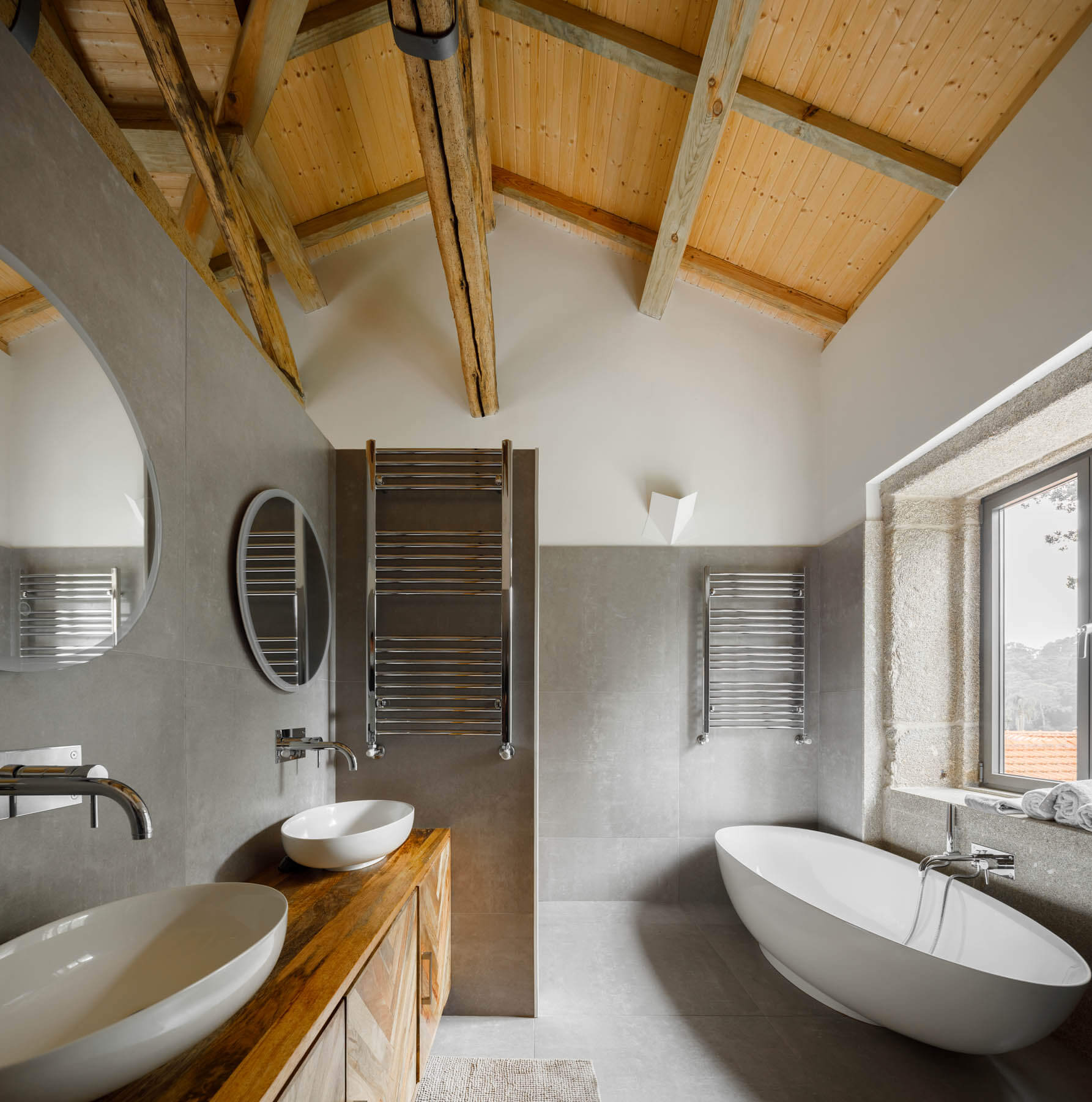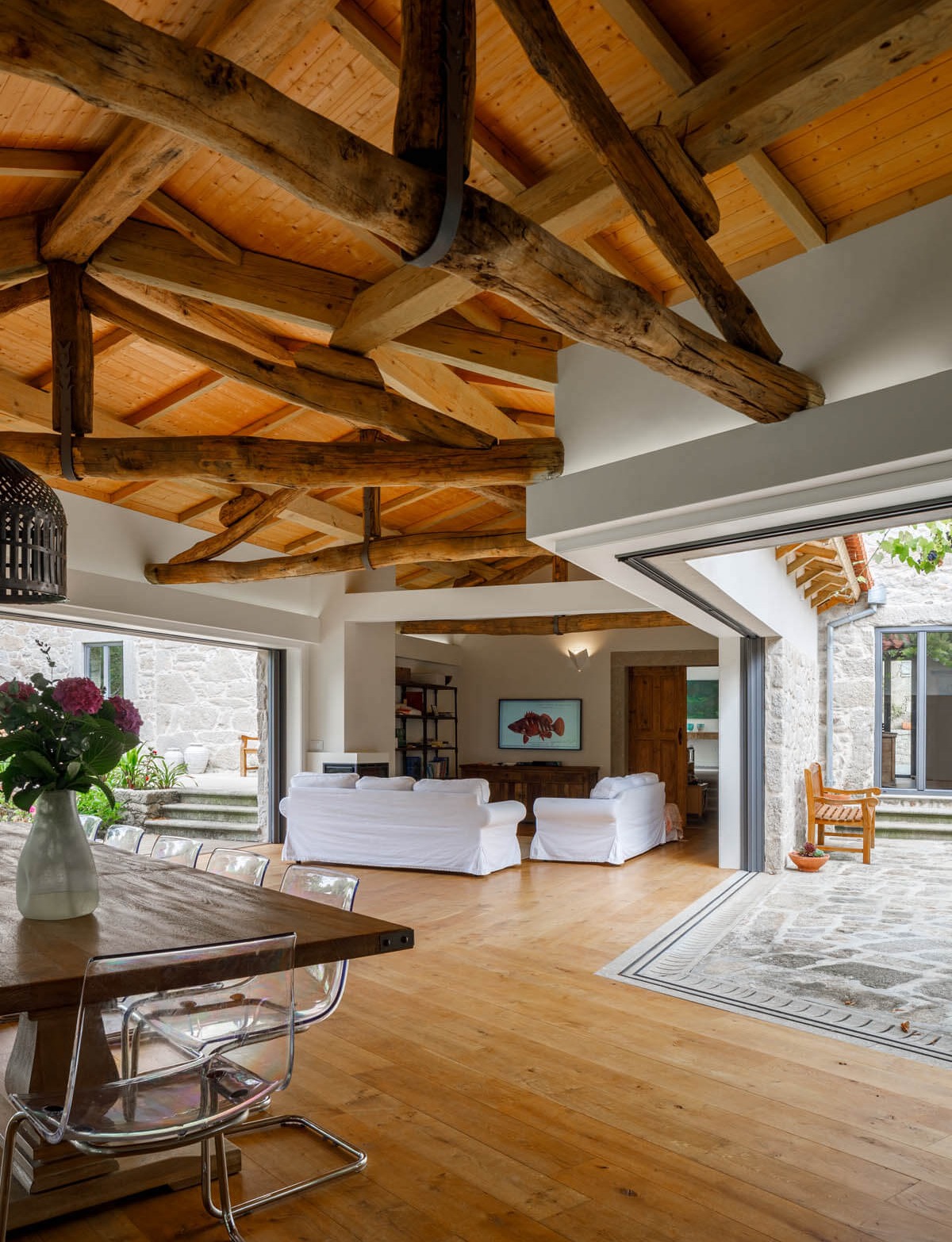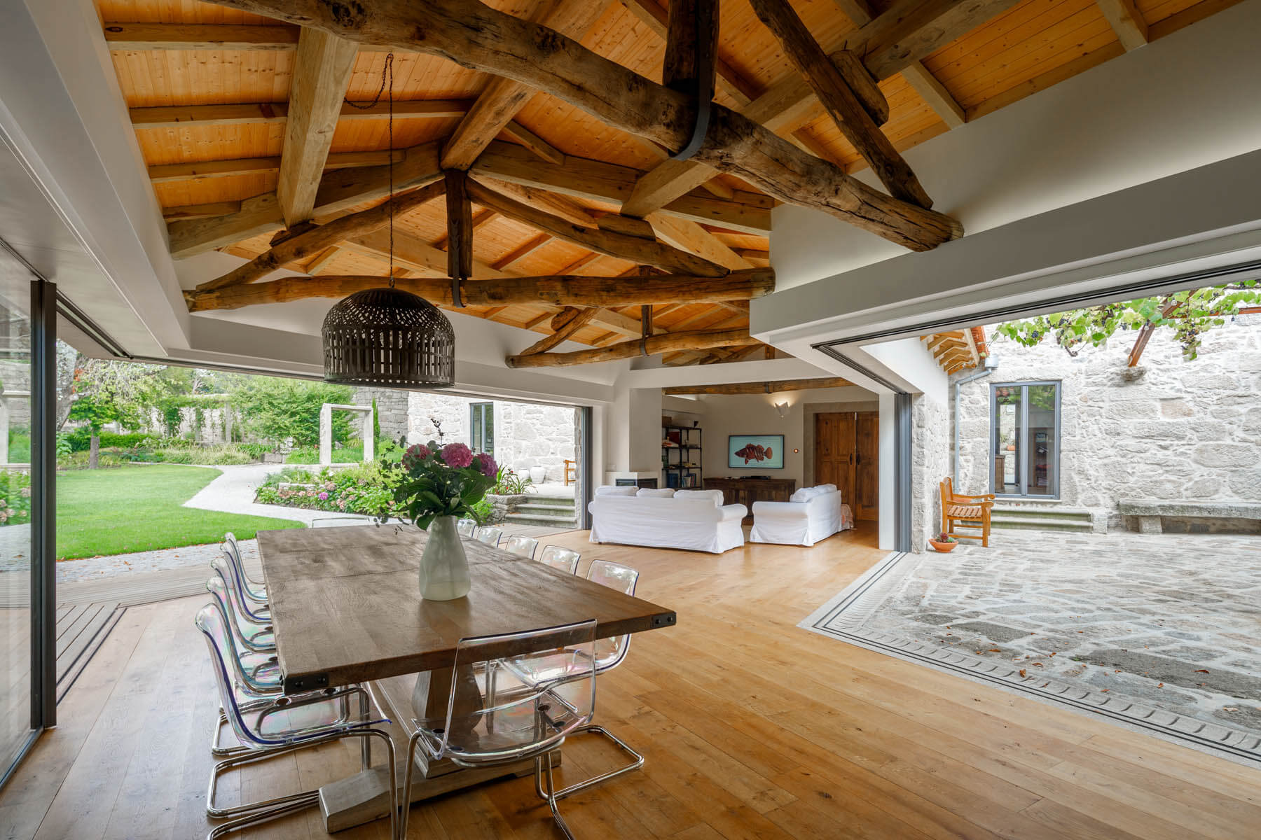 Osobny budynek przekształcono w komfortowy domek dla gości z kuchnią, jadalnią i salonem na parterze oraz sypialnią i łazienką na piętrze. Architekci zadbali również o zewnętrzną kuchnię, przebieralnię przy basenie oraz miejsce na sprzęt ogrodniczy. Nowoczesna organizacja przestrzeni i subtelne materiały naturalne – takie jak kamień, drewno i tynki wapienne – nadają posiadłości wyjątkowy charakter. Choć daleki od typowego projektu w stylu nowoczesna stodoła, Dom Calçada zachowuje podobną równowagę między tradycją, prostotą formy a współczesnym komfortem. To przykład architektury, która z szacunkiem odnosi się do przeszłości, ale w pełni odpowiada potrzebom nowoczesnego życia.
