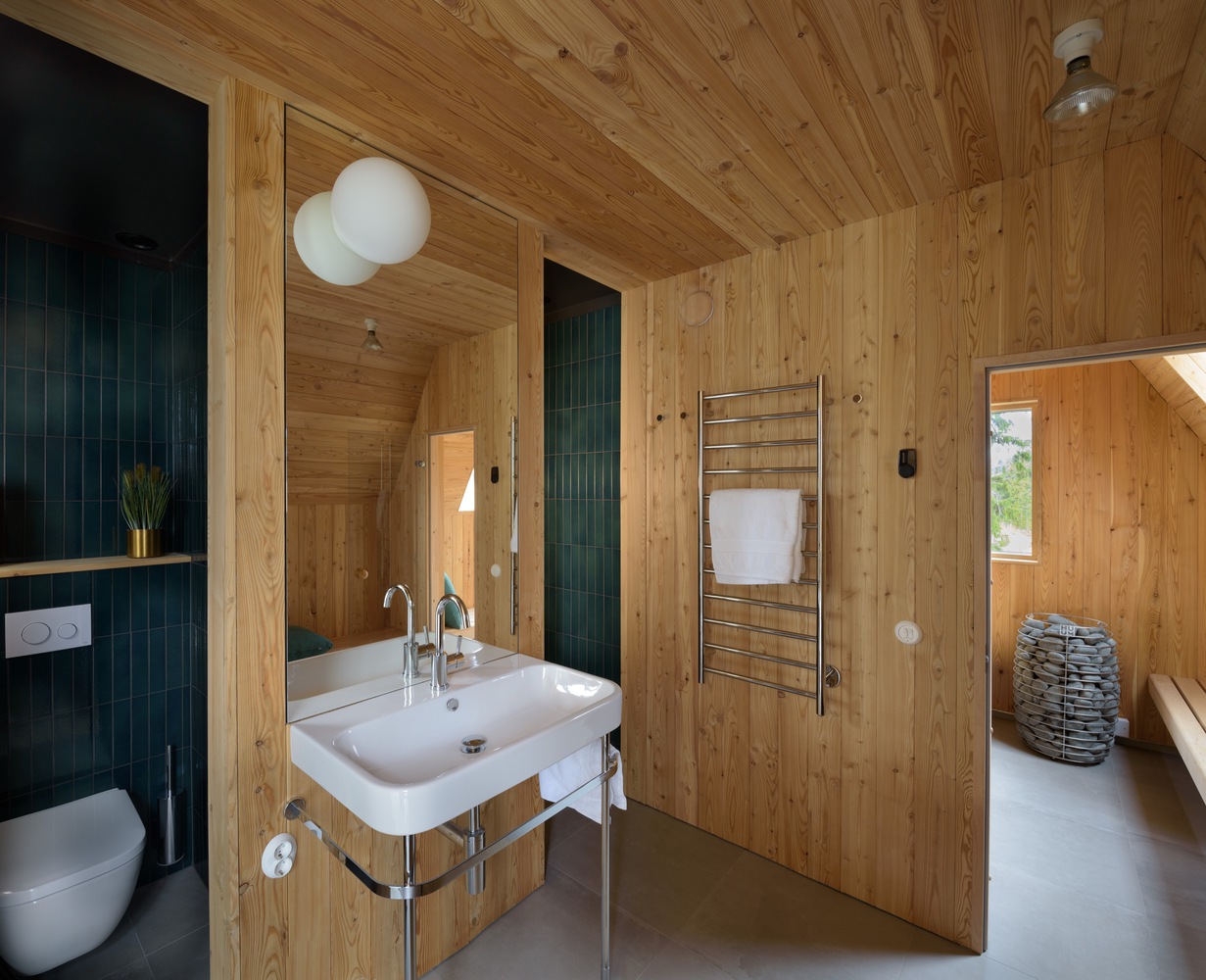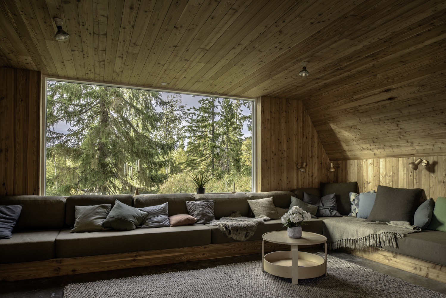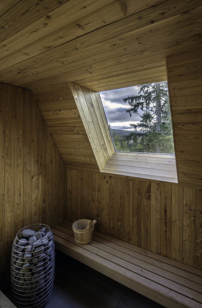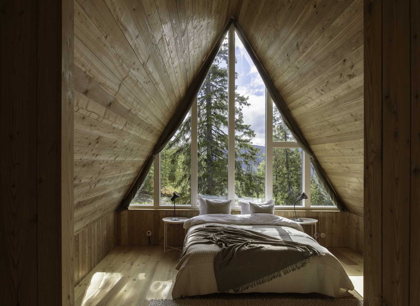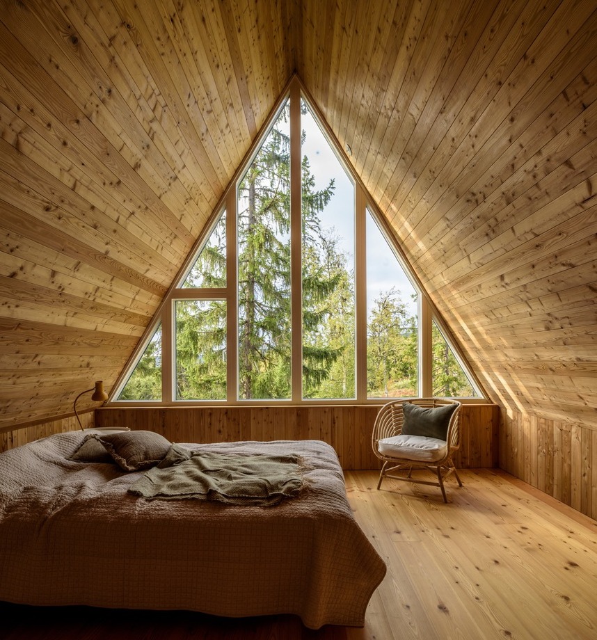 Na górnym poziomie znajdują się dwa identyczne apartamenty z pięcioma łóżkami w każdym, a także pokój ze szczytem przypominającym namiot, który podkreśla wyjątkowy charakter tej architektury górskiej.