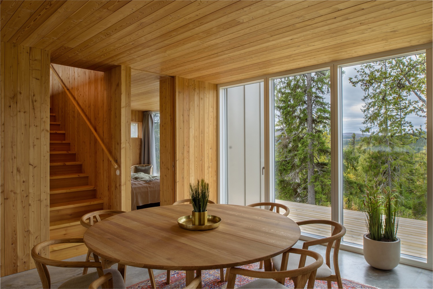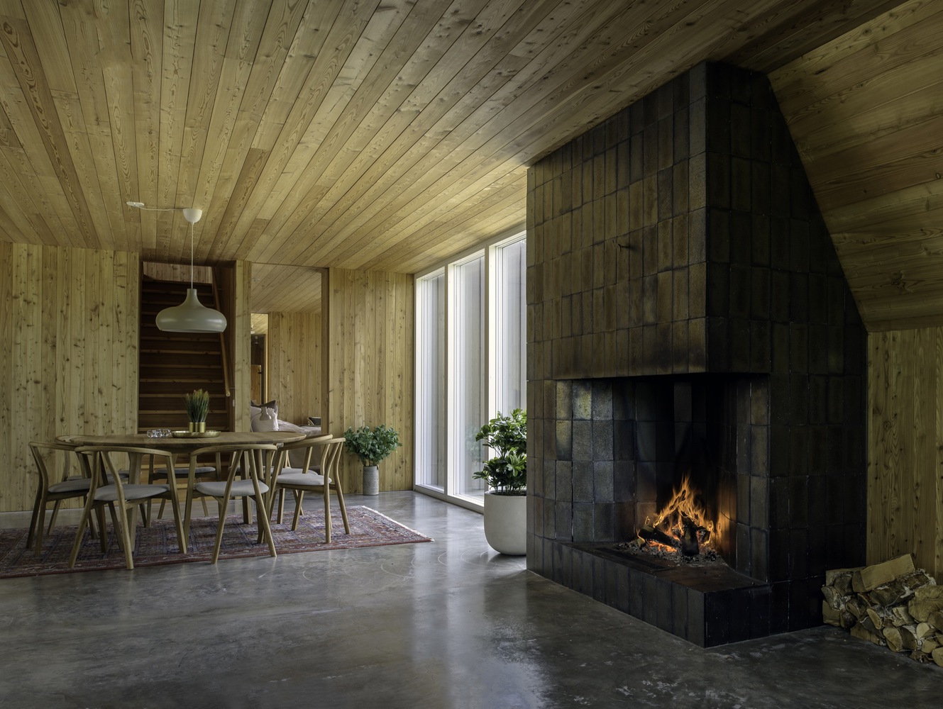 Plan domu obejmuje obszary socjalne i główną łazienkę na niższym piętrze. Kluczowym elementem jest kominek, zaprojektowany na zamówienie, w formie monolitycznej bryły z zakrzywioną przestrzenią, inspirowaną fenomenem zórzy polarnej. Celem było zapewnienie swobodnego przepływu przestrzeni poprzez ukryte drzwi przesuwne, dzięki którym wszystkie pomieszczenia, w tym spa, są częścią jednej spójnej przestrzeni.