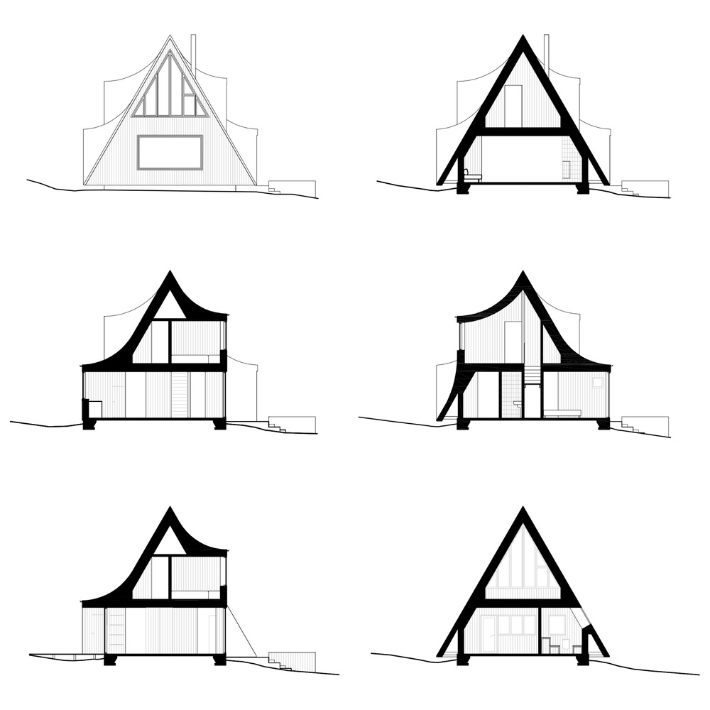 Domek narciarski, zaprojektowany w kształcie litery A, to unikalna budowla, która łączy tradycyjny design z nowoczesnymi rozwiązaniami architektonicznymi. Zbudowany z prefabrykowanych ram i zakrzywionych lukarn, ten trójkątny kształt przypomina niewielką górę. W zimie, kiedy gromadzi się śnieg, granica między domem a otaczającą go ziemią zlewa się, tworząc wrażenie jedności z naturą.
