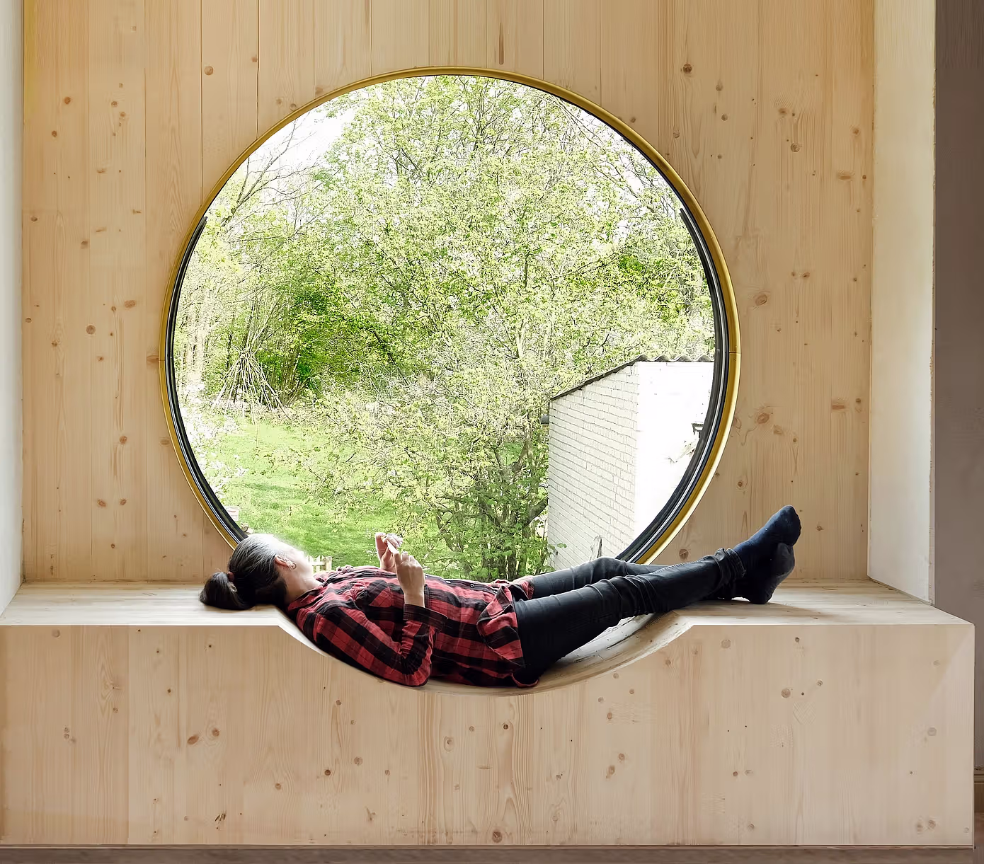 Jedną z ciekawych cech jest zmiana tego, co kiedyś było mało inspirującą ścianą bez okien, na coś przyciągającego wzrok – teraz może pochwalić się dużym okrągłym oknem poza środkiem, między innymi. Ten dodatek pozwala, aby poranne promienie słoneczne wnikały głęboko do pomieszczeń, w których wcześniej brakowało godzin światła dziennego. Ponadto zakrzywione płyty mosiężne odprowadzają deszczówkę od połączeń drewnianych, a wstawianie szklanych tafli również w wyjątkowy sposób ukazuje oryginalność.