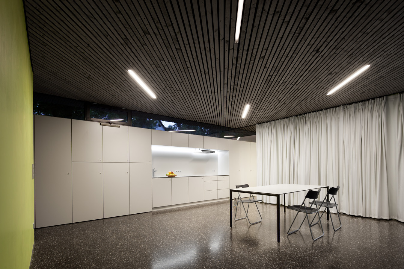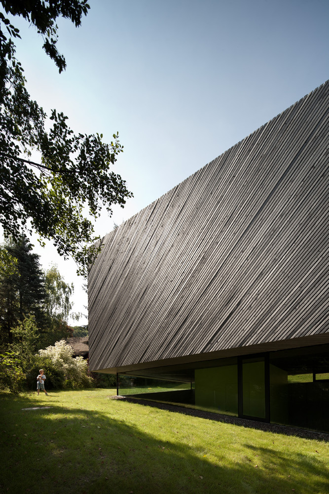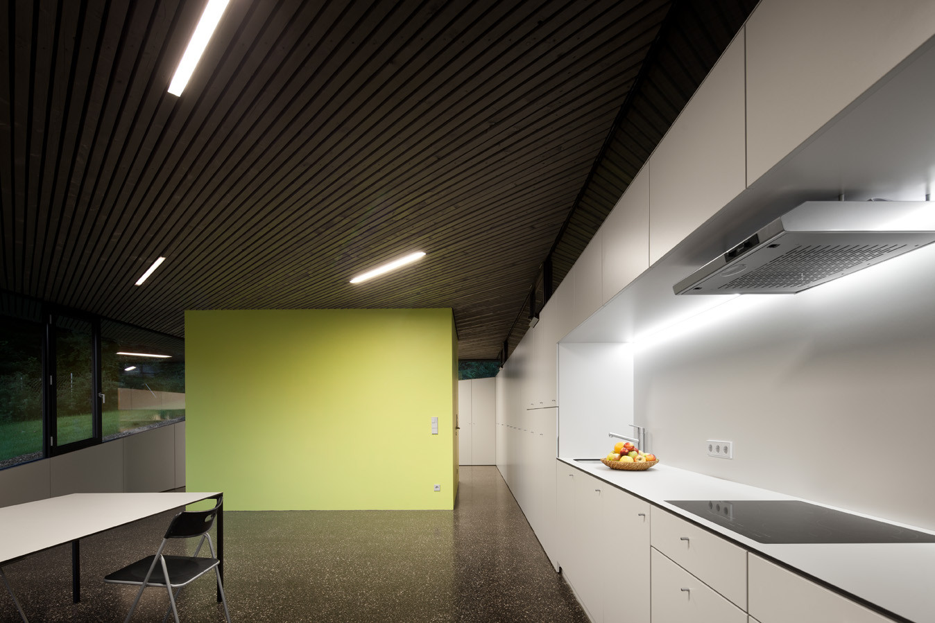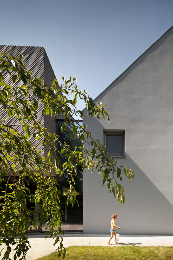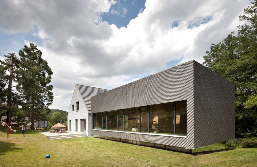 Młodzi rodzice marzyli o własnym domu jednorodzinnym na wsi. Znaleźli niewielki budynek z dużym ogrodem, który wymagał renowacji i ocieplenia. Po narodzinach drugiego dziecka powróciła myśl o rozbudowie. Do współpracy zaproszono pracownię Franz Architekten, a wraz z babcią narodził się pomysł stworzenia dodatkowego mieszkania w przybudówce. Architekci, ograniczeni lokalnymi regulacjami, zaprojektowali dwupoziomowe skrzydło częściowo ukryte w gruncie, z osobnym mieszkaniem dla babci, które w przyszłości może pełnić funkcję gabinetu lekarskiego.